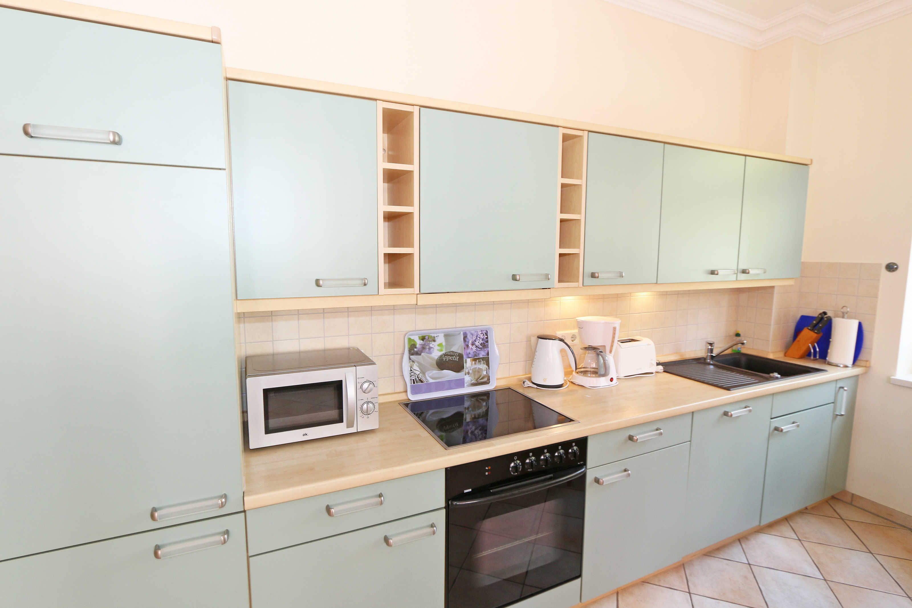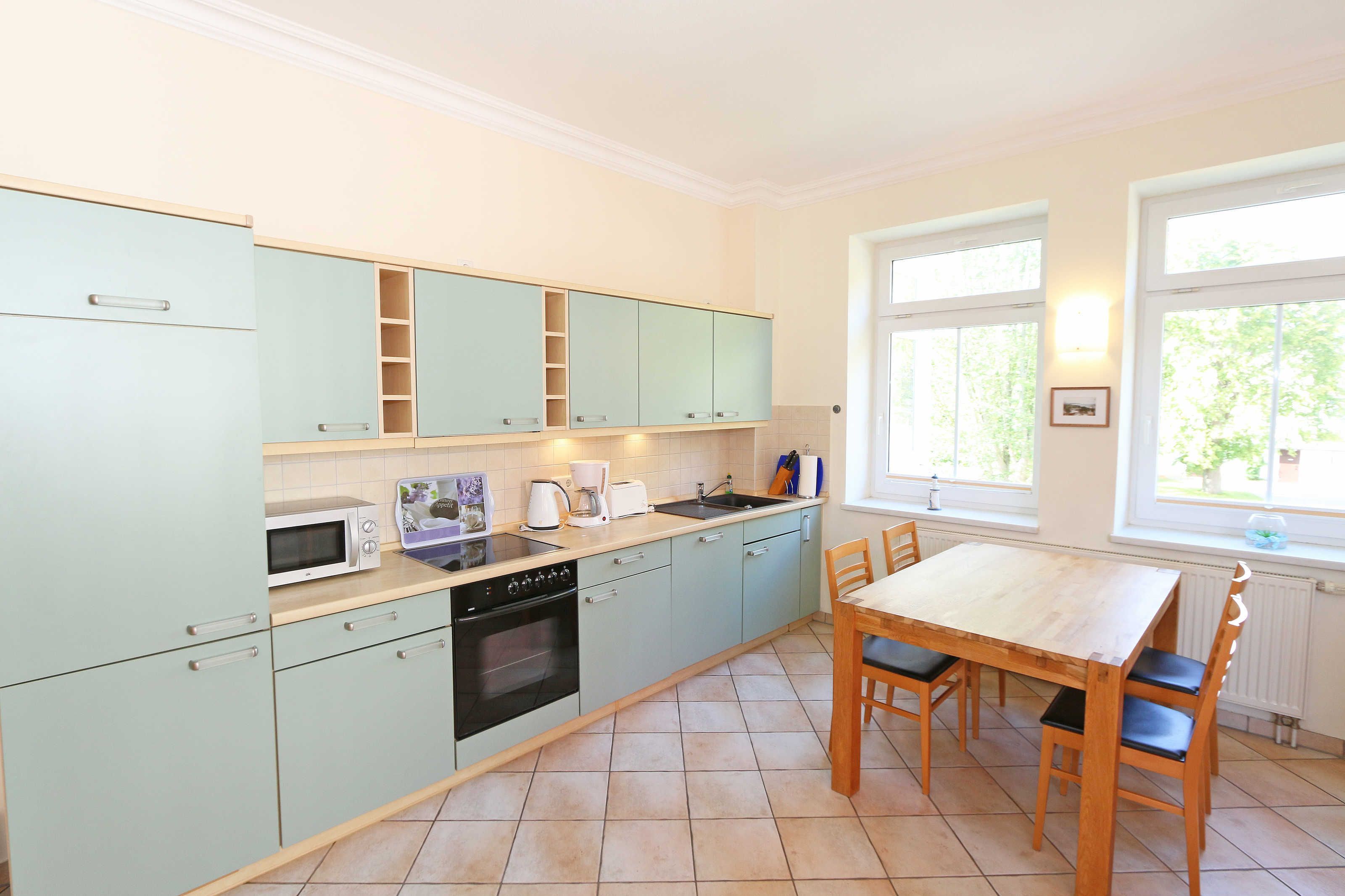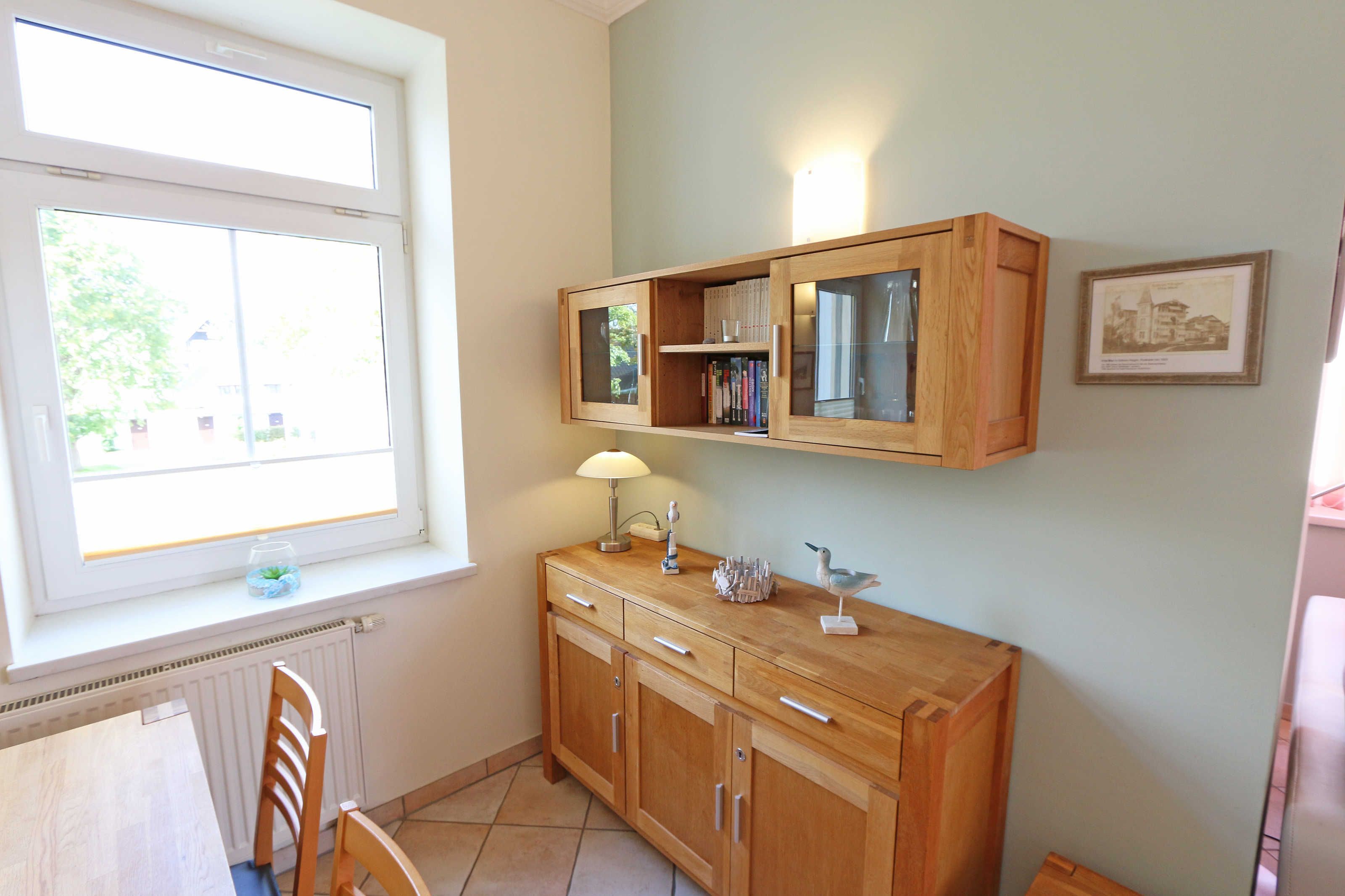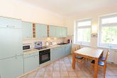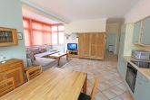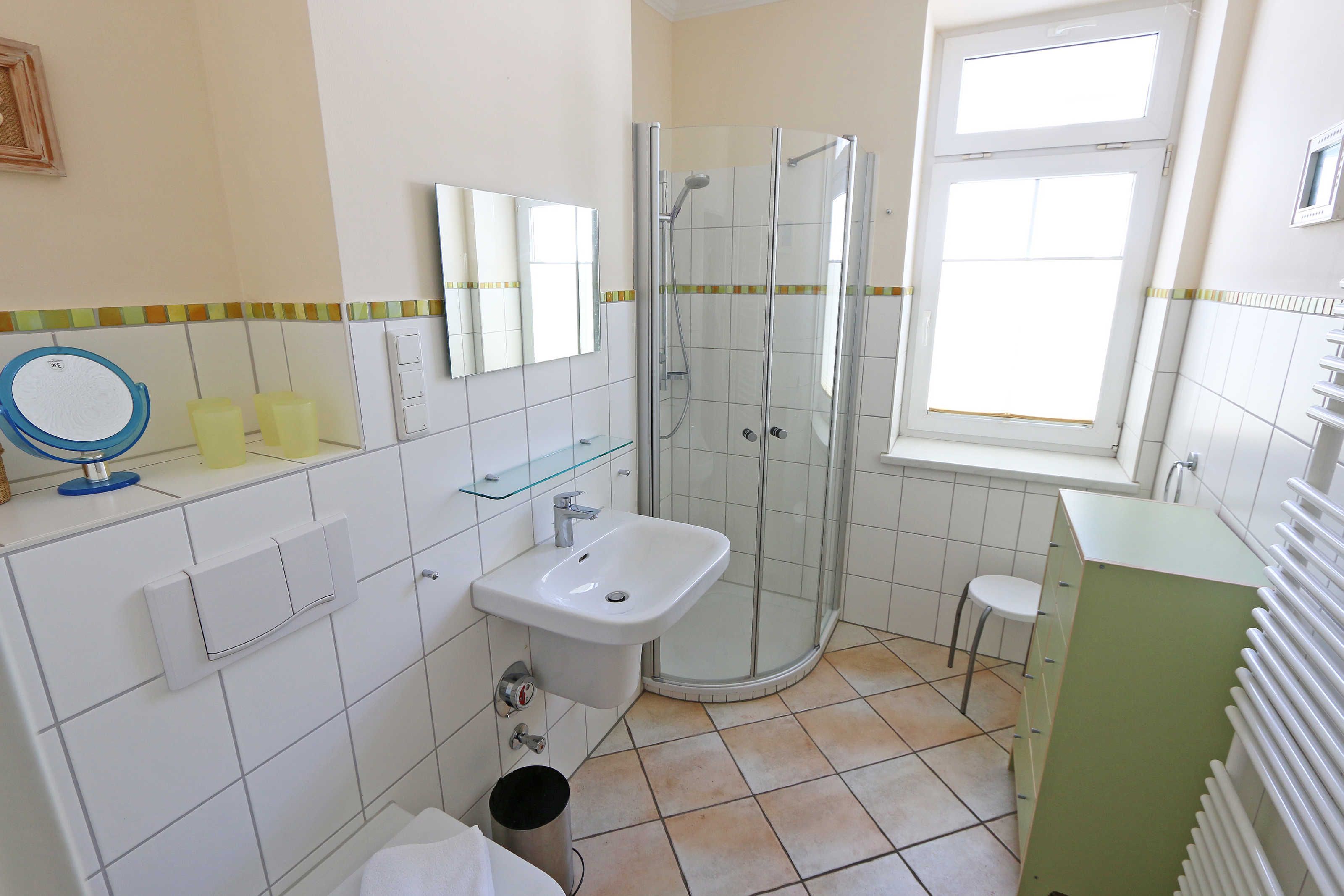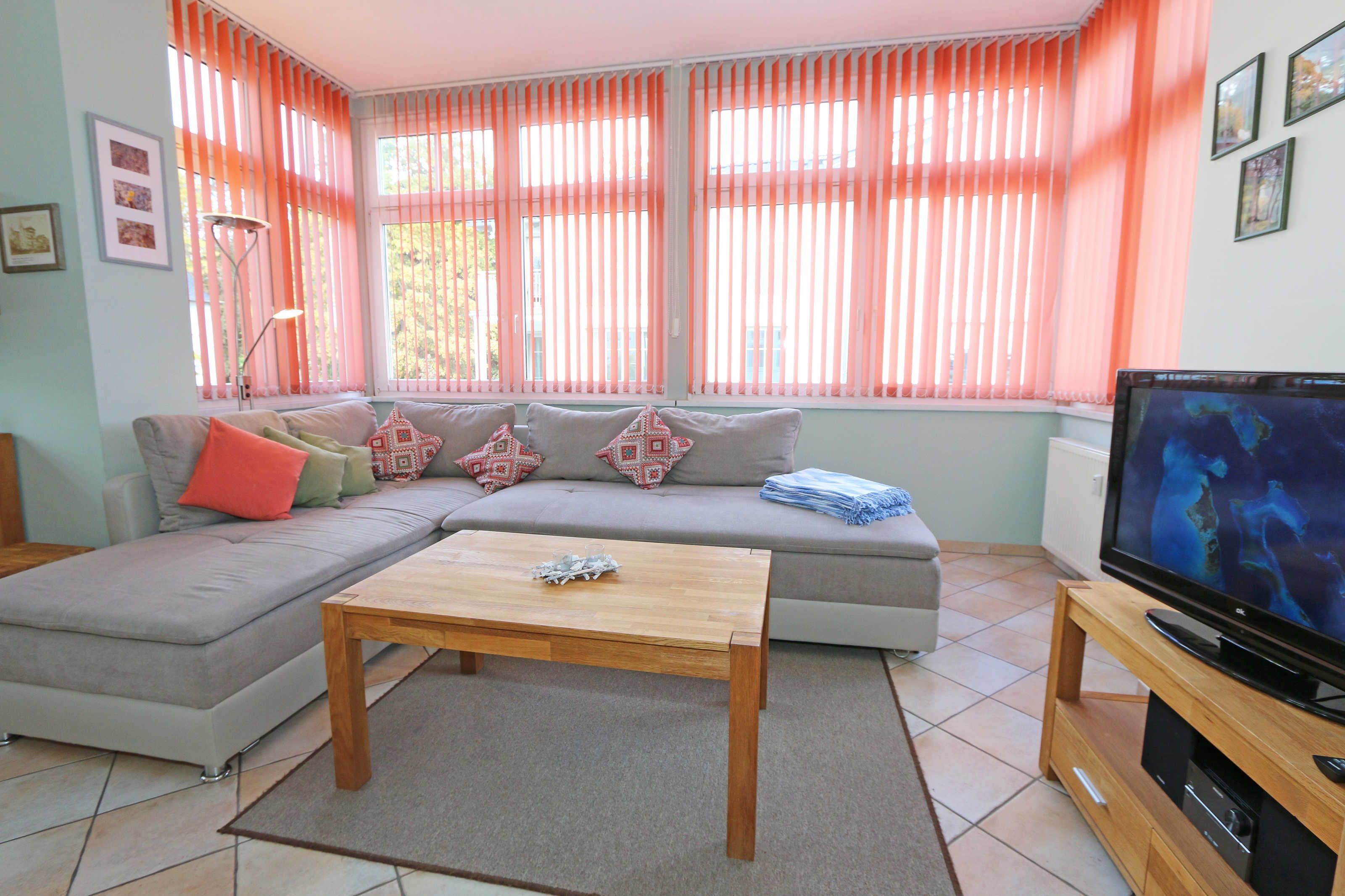 Die 2-Raumferienwohnung (Nichtraucher) liegt im 1. Obergeschoss und bietet mit Ihren ca. 50 qm genug Platz für 2-4 Personen. Durch die vollverglaste Veranda ist der kombinierte Wohn/Koch- und Essbereich sehr hell und freundlich. Die integrierte Küchenzeile mit Cerankochfeld, Backofen, Geschirrspüler, Mikrowelle, Kühlschrank, Gefrierfach, Kaffeemaschine, Wasserkocher, Toaster und diverse Küchenutensilien werden durch einen Essplatz für 4 Personen komplettiert. Der angrenzende und offene Wohnbereich besteht aus einem Sofa, welches zu einem Doppelbett (1,60m x 2,00m) ausgezogen werden kann, einem Sessel, Couchtisch und kleinem Beistelltisch. Abgerundet wird der Wohnbereich mit einem Flachbild-TV, DVD-Player und Mini-Stereo-Anlage mit USB-Anschluss. Auch auf einen Internetanschluss (WLAN) müssen Sie nicht im Urlaub verzichten. Ein Kleiderschrank bietet genügend Platz für Ihre Bekleidung. Das Schlafzimmer verfügt über ein Doppelbett (1,80m x 2,00m), Nachttischablagen, einer geräumigen Kommode und einem Wandspiegel. Das Tageslichtbad wird durch eine ebenerdige Dusche, Waschplatz, Handtuchtrockner, WC und Fön abgerundet. Alle Räumlichkeiten sind mit Raff-Plissees bzw. Lamellenstores versehen. Im Keller des Hauses können Sie eine Waschmaschine sowie ein Trockner gegen Gebühr nutzen. 1 Haustier (keine Katzen) ist gegen eine Gebühr ein gern gesehener Gast. Ein PKW-Stellplatz Nr. 04 befindet sich direkt hinter dem Haus. Ihre mitgebrachten Fahrräder oder auch geliehenen Räder können Sie im Fahrradschuppen verschließen. Die Erstausstattung eines Wäschepaketes (komplette Bettwäsche, 1 Duschhandtuch, 2 kleine Handtücher) können Sie bis 14 Tage vor Anreise gegen einen Aufpreis dazu buchen oder durch eigene ergänzen. Ab 2 gebuchten Paketen erhalten Sie einmalig 1 Geschirrhandtuch und 1 Duschvorleger hinzu.