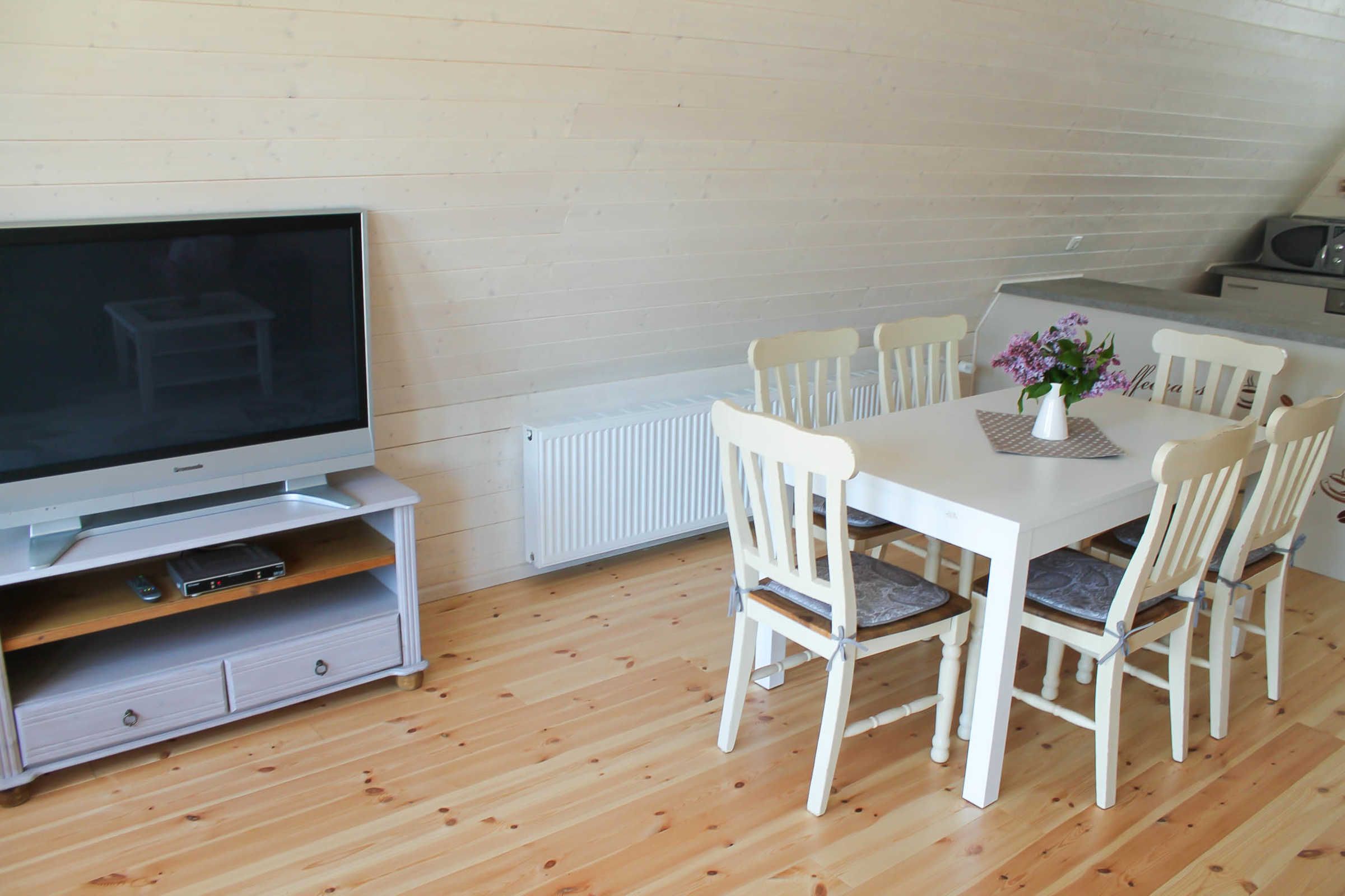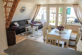 Zu der modern eingerichteten Küche gehören ein Carankochfeld, Backofen, Geschirrspüler, Kühlschrank mit Gefrierfach, Mirkowelle, Kaffeemaschine, Wasserkocher und Toaster. Im gemütlich eingerichteten Wohnzimmer befindet sich eine große Couch mit Schlaffunktion (180x200; Aufbettung für zwei Personen möglich) sowie ein Flachbild-TV.