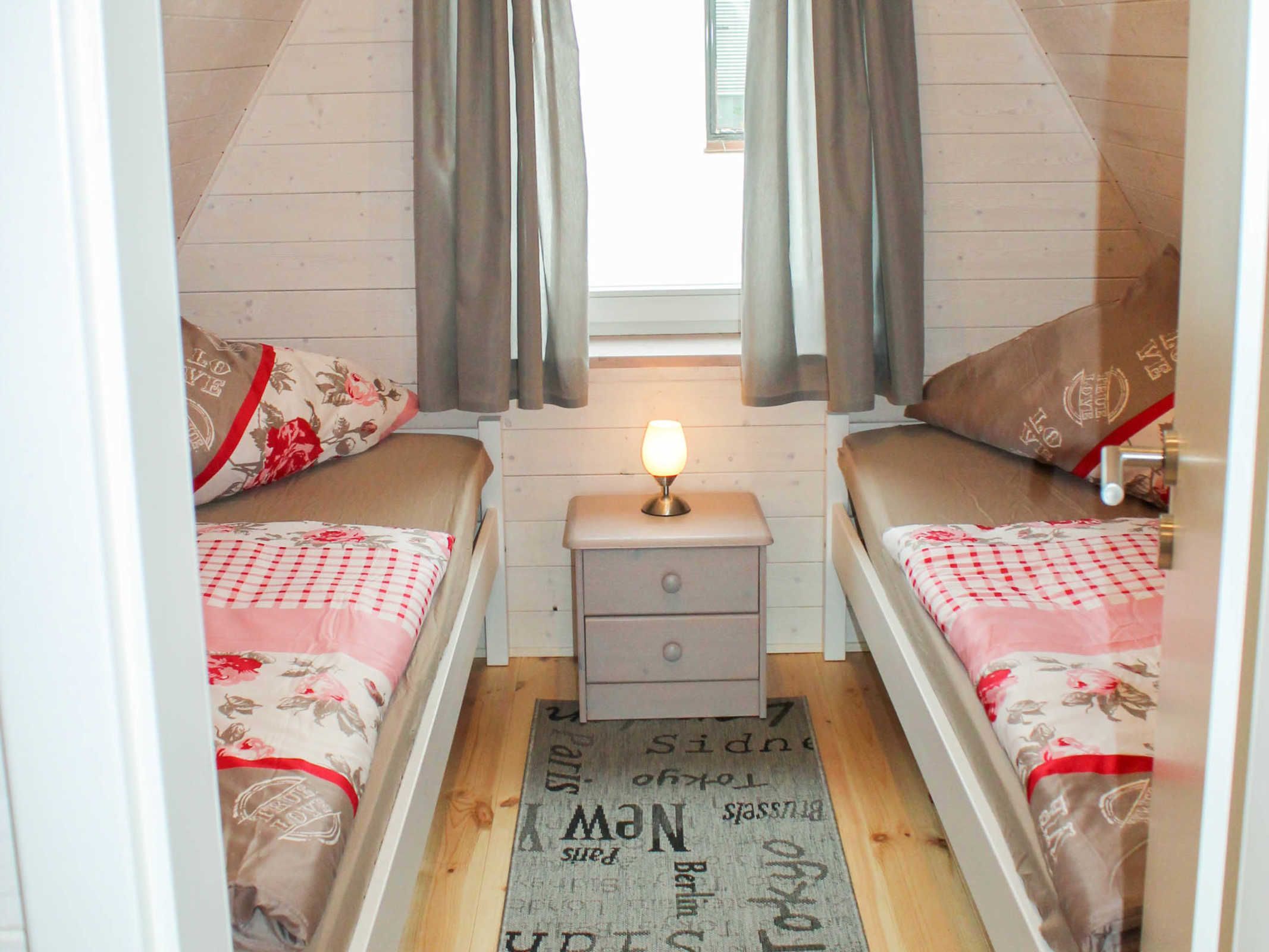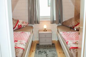 Über eine vollwertige Holztreppe sind im Obergeschoss zwei Schlafzimmer erreichbar mit jeweils zwei Einzelbetten (90x200). Ein Kinderbett (bis 3 Jahre) kann kostenlos zugestellt werden. In einem der beiden Schlafzimmer befindet sich ein Flachbild-TV.