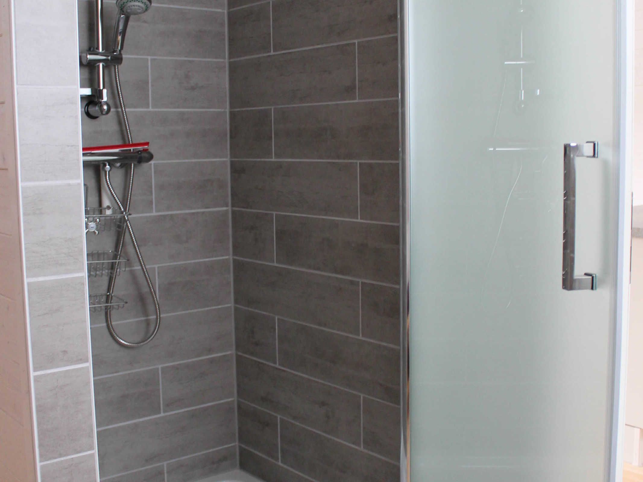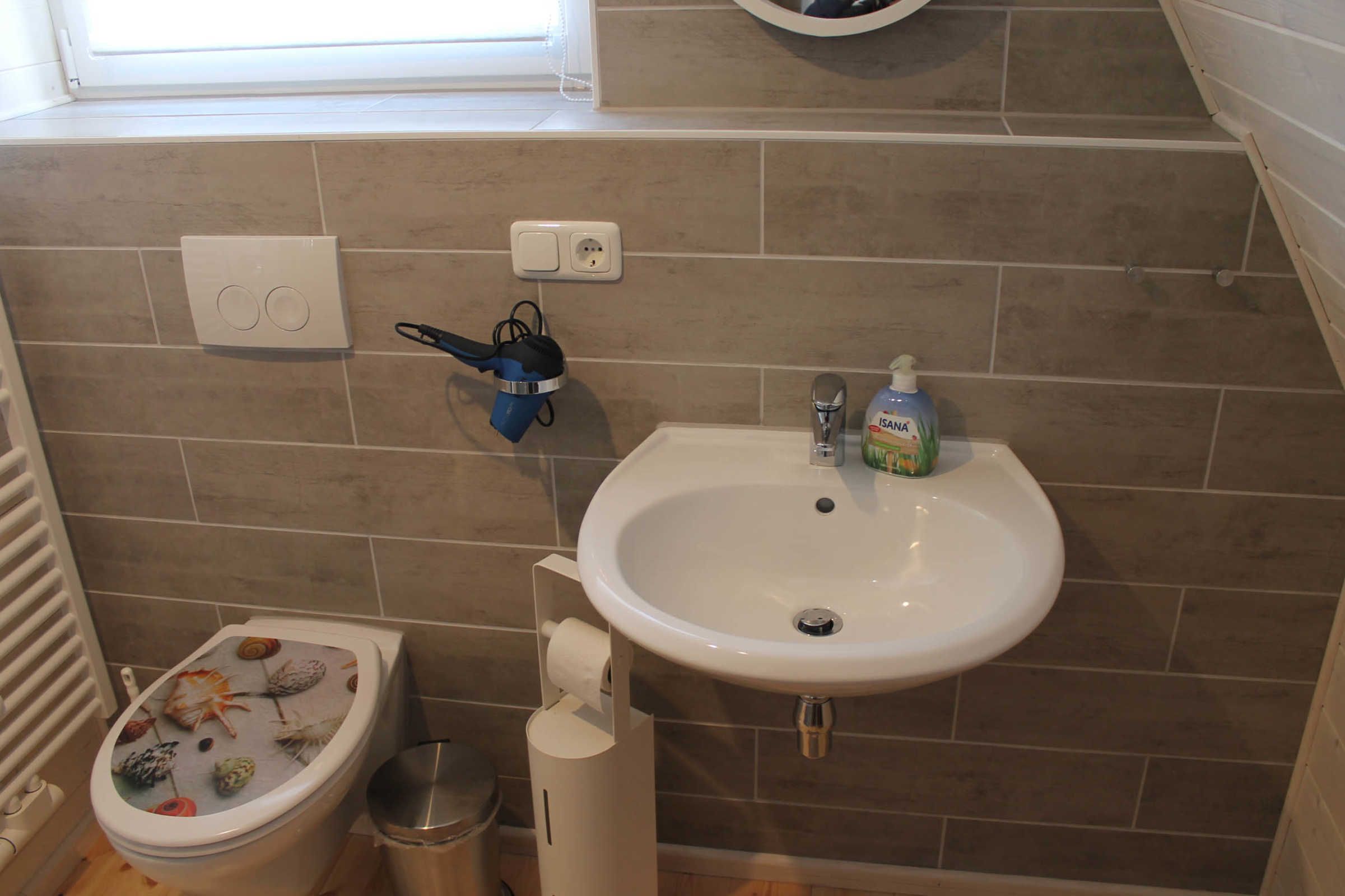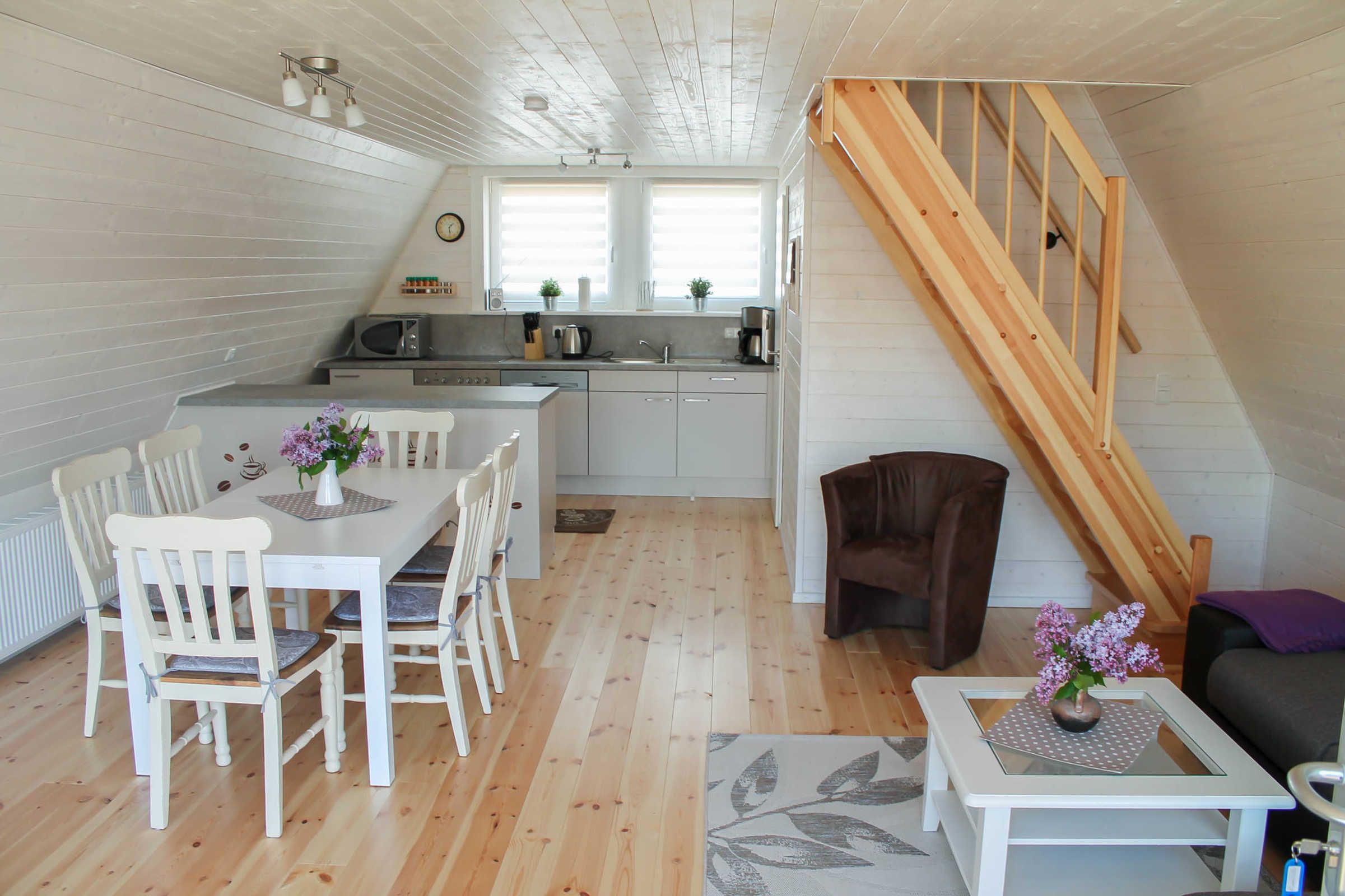 Die Finnhütte verfügt im Erdgeschoss über ein großes Wohnzimmer mit Essbereich für 6 Personen und offener Küche sowie einem Bad mit großer Dusche, WC und Fön.