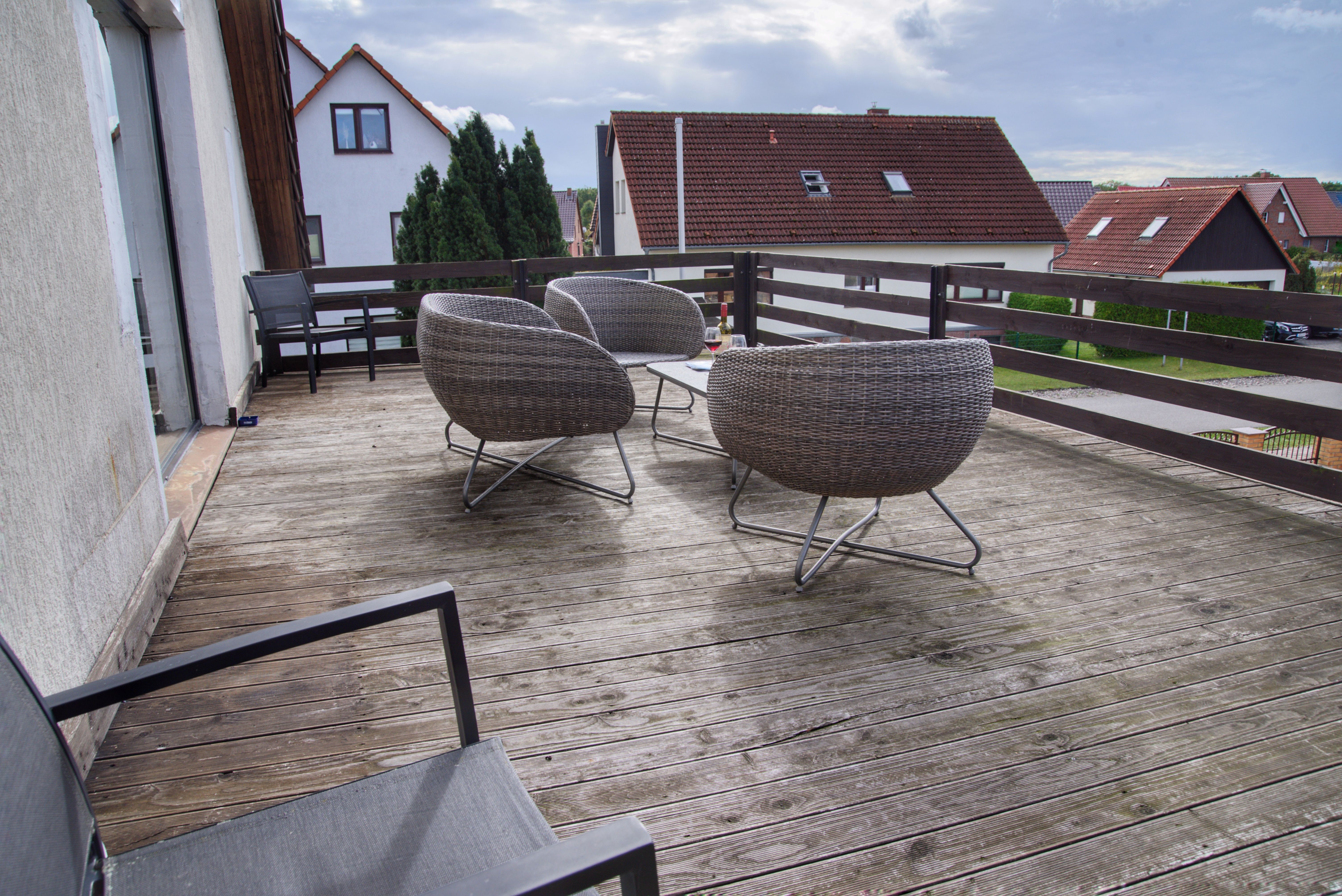 Die Ferienwohnung verfügt über eine Dachterrasse und eine Sitzecke im Garten
