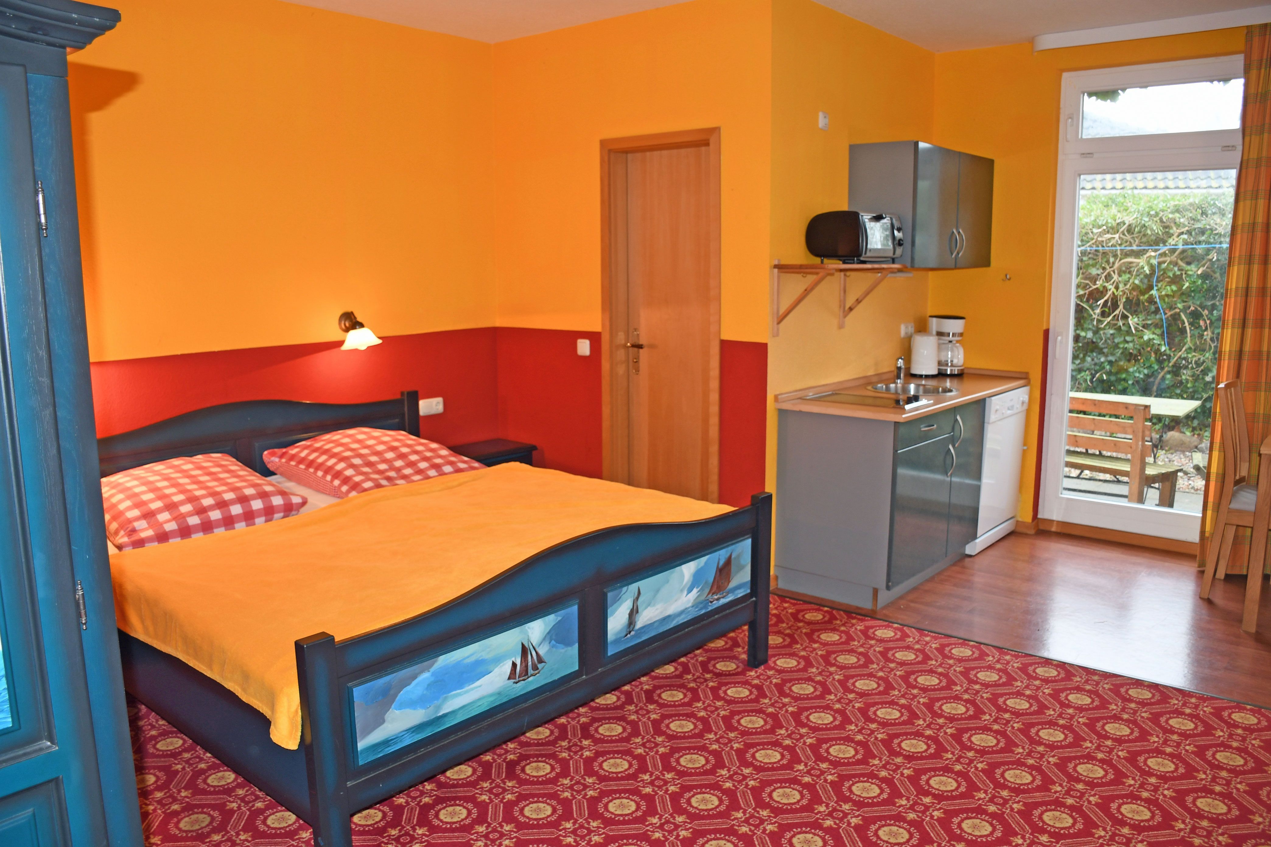 Dieses Ferienappartement verfügt über einen separaten Eingang und liegt im Erdgeschoss. Sie ist ca. 35 qm groß, bietet Platz für maximal 3 Erwachsene und wurde modern eingerichtet. Das 1-Raum-Appartement ist unterteilt in Schlaf,- Wohn- und Küchenbereich.