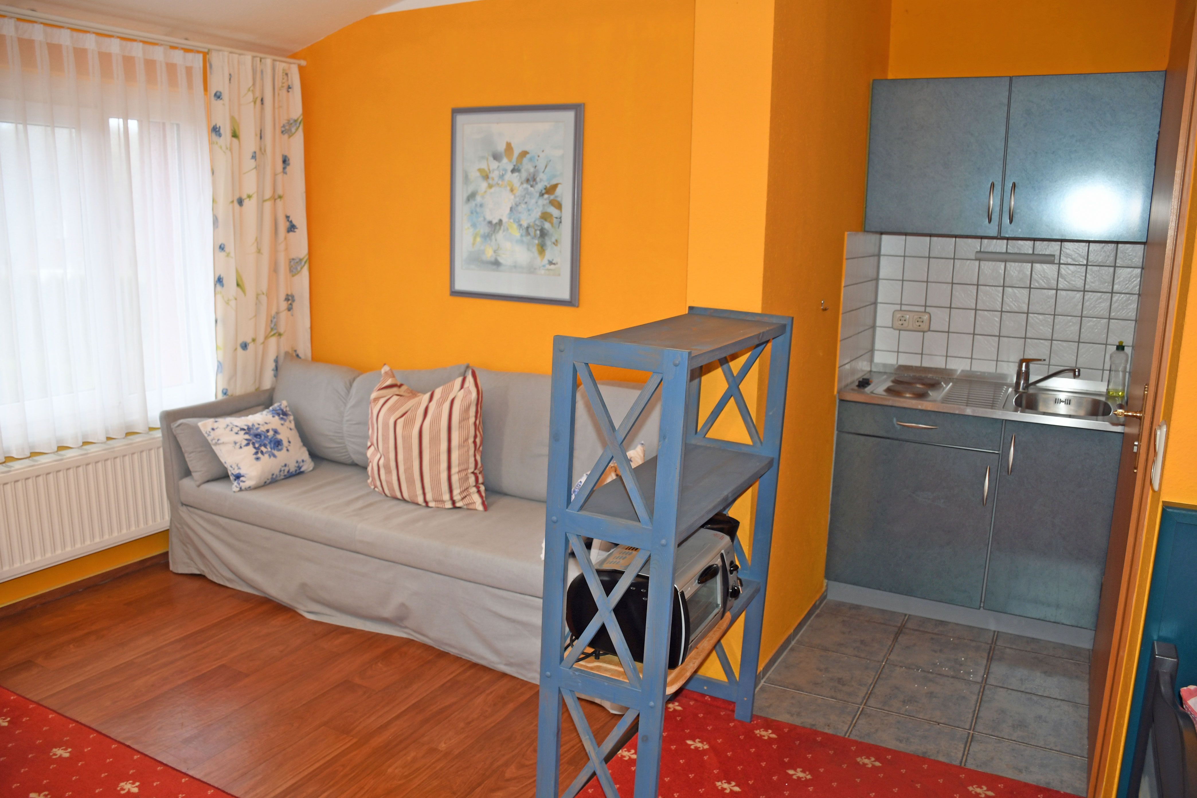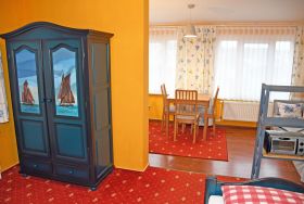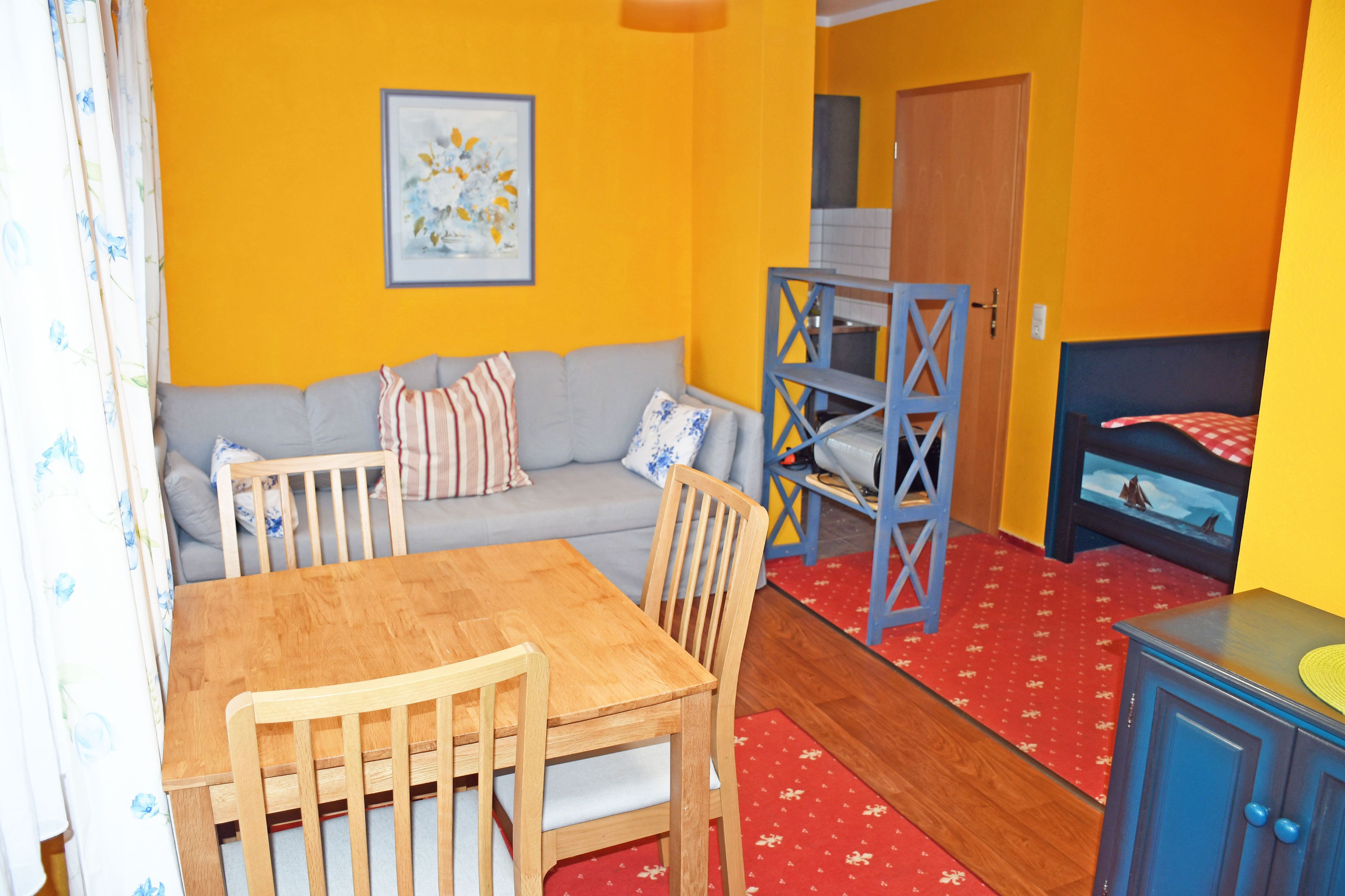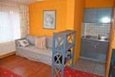 Dieses Ferienappartement erreichen Sie über den Hintereingang und liegt im Obergeschoss. Sie ist ca. 30 qm groß, bietet Platz für maximal 3 Erwachsene und wurde modern eingerichtet. Das 1-Raum-Appartement ist unterteilt in Schlaf,- Wohn- und Küchenbereich.