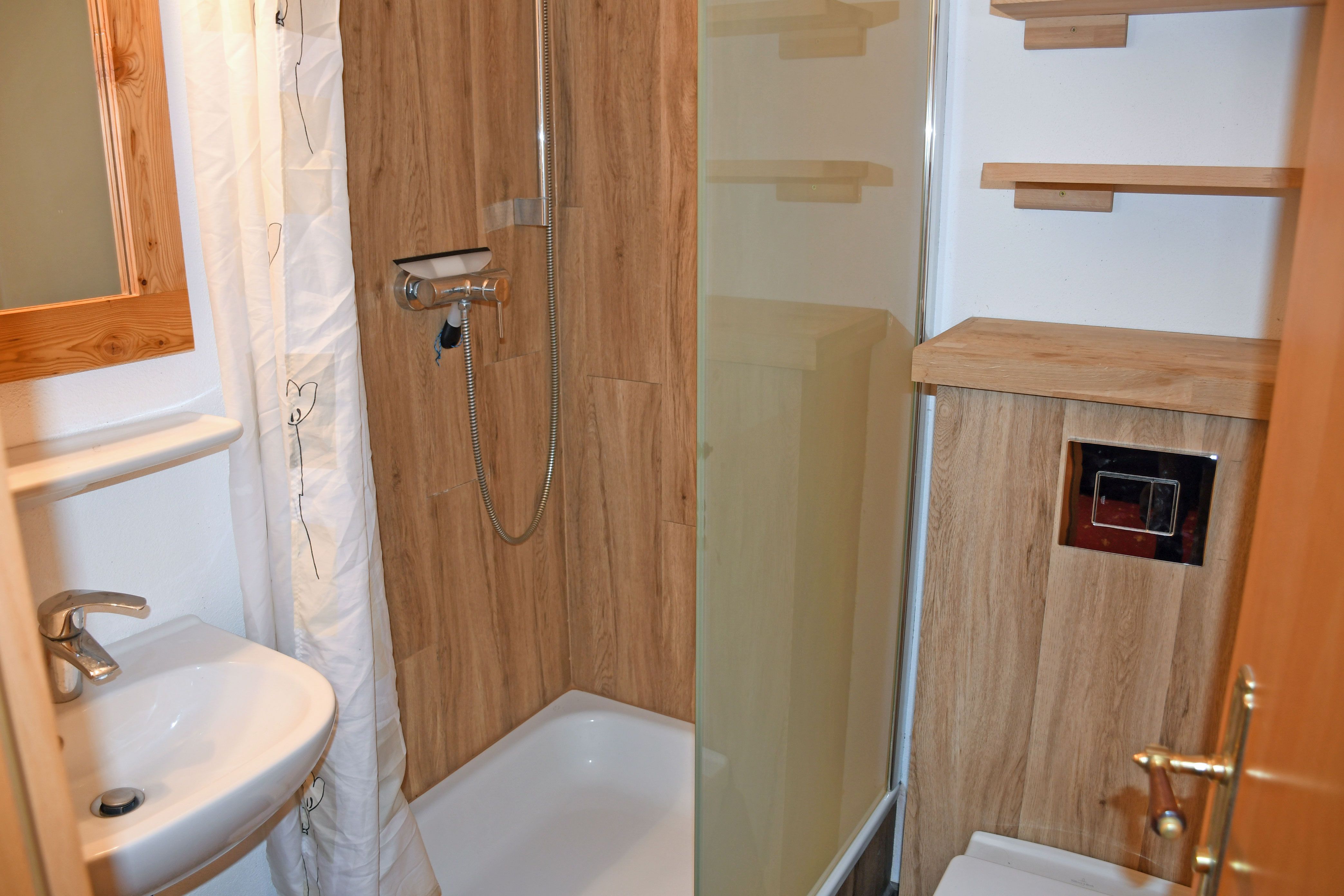 Das Bad ist mit Dusche, WC, Fön und Waschtisch ausgestattet.