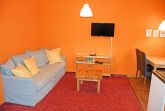 Im kombinierten Wohn-/Küchenbereich befinden sich ein Schlafsofa, welches ausgeklappt Platz für 2 Erwachsene bietet, ein Tisch und ein TV-Gerät. Hier steht auch ein Esstisch mit 4 Stühlen.