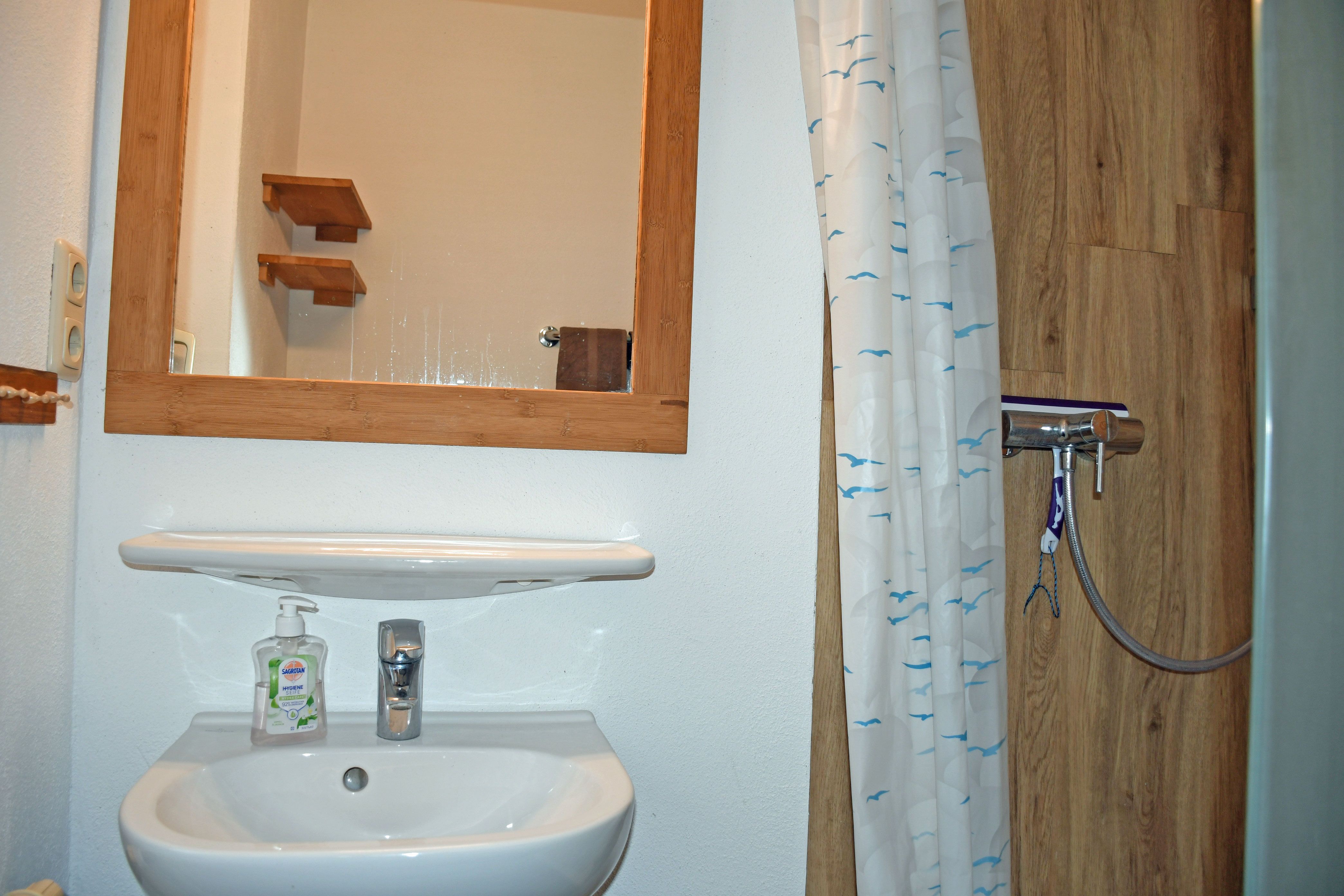 Das Bad ist mit Dusche, WC, Fön und Waschtisch ausgestattet.