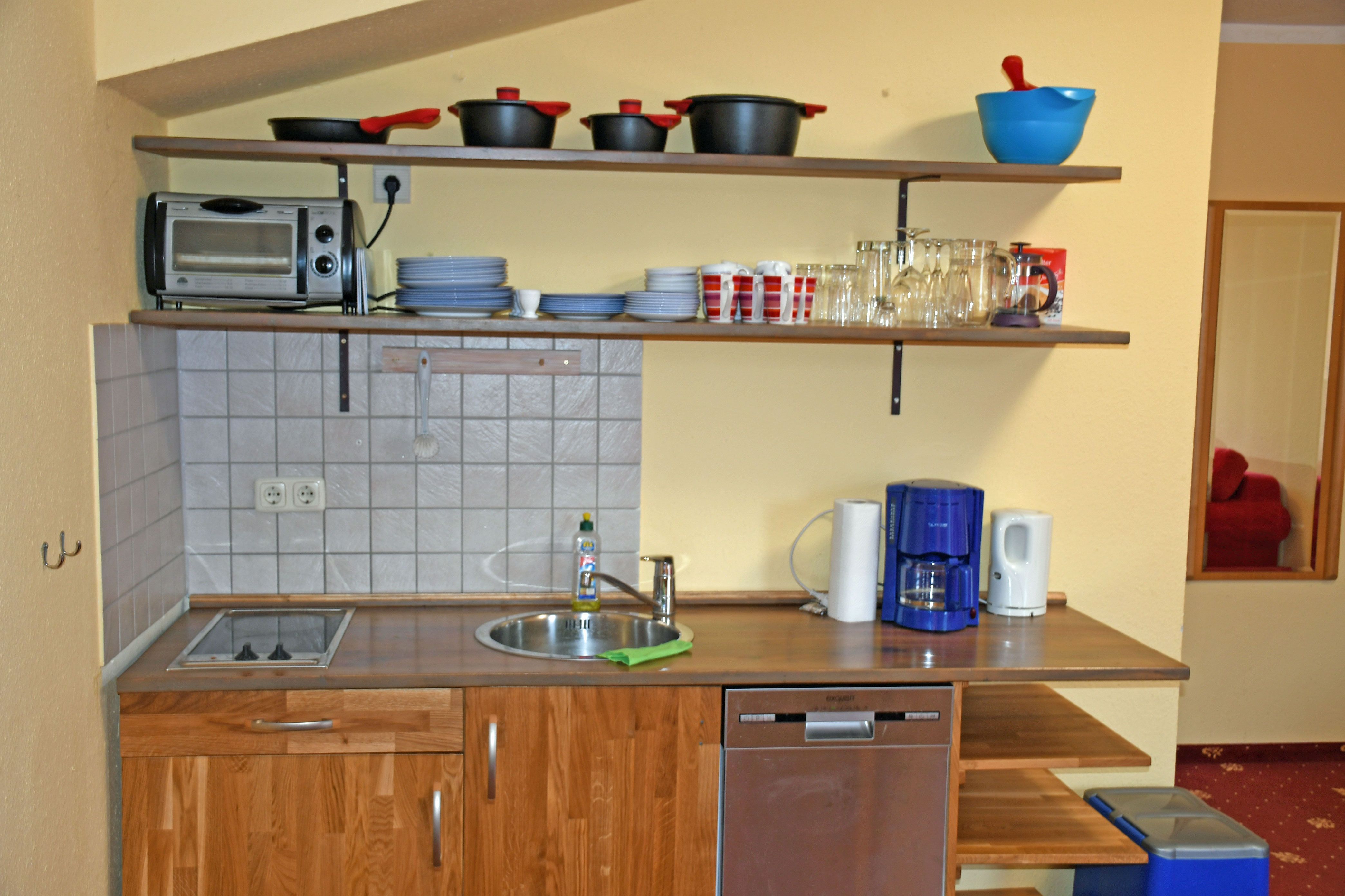 Die Pantry-Küche ist ausgestattet: 2 P. E-Herd, Spülmaschine, Minibackofen, Kaffeemaschine, Wasserkocher, 6-Set-Ess-Geschirr und Besteck, kleine Auswahl an Gläsern, kleine Topfsammlung, ein paar kleine Küchenhelfer --- Grundausstattung!!!