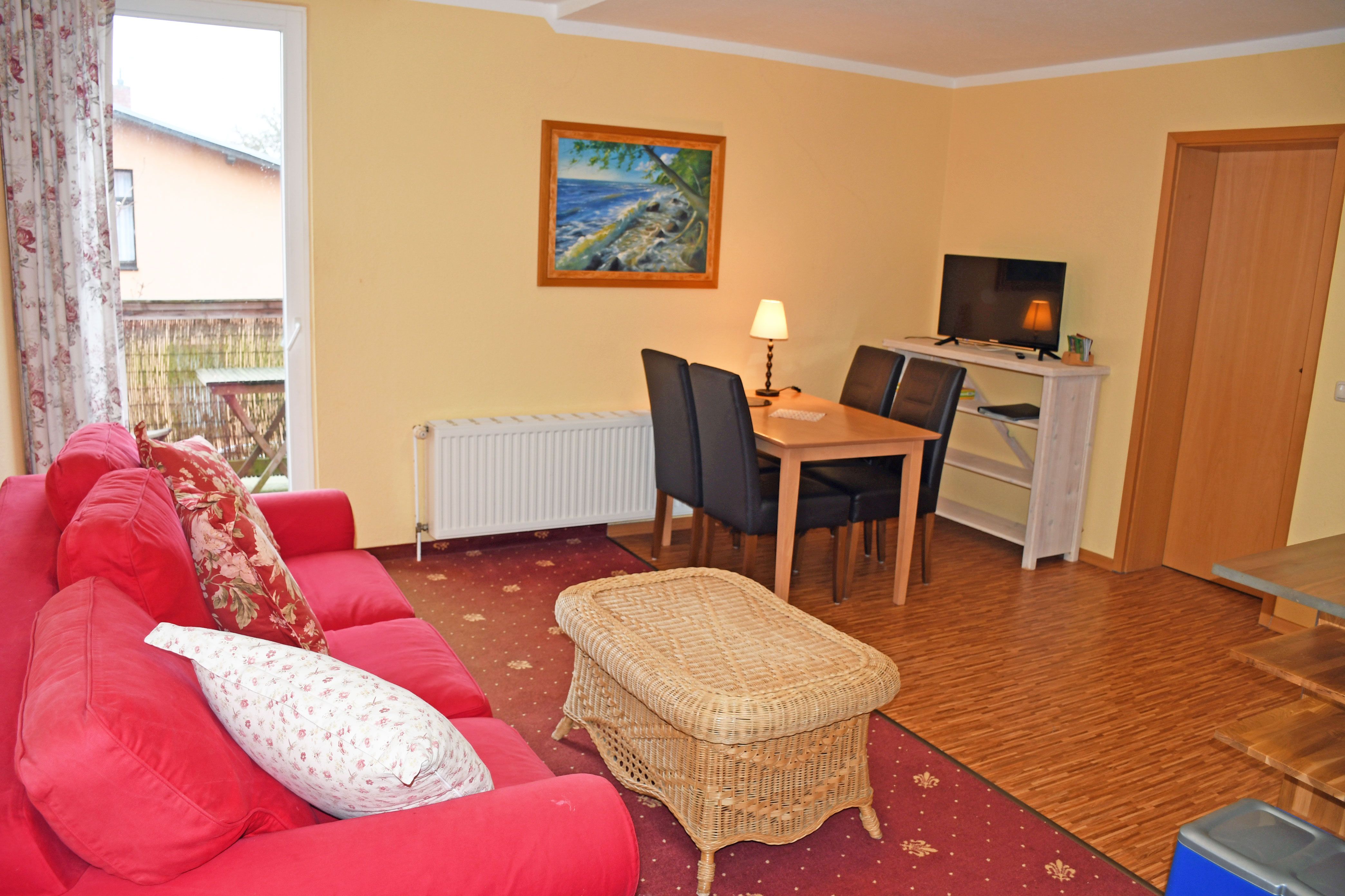 Im kombinierten Wohn-/Küchenbereich befinden sich ein Schlafsofa, welches ausgeklappt Platz für 2 Erwachsene bietet, ein Tisch und ein TV-Gerät. Hier steht auch ein Esstisch mit 4 Stühlen.