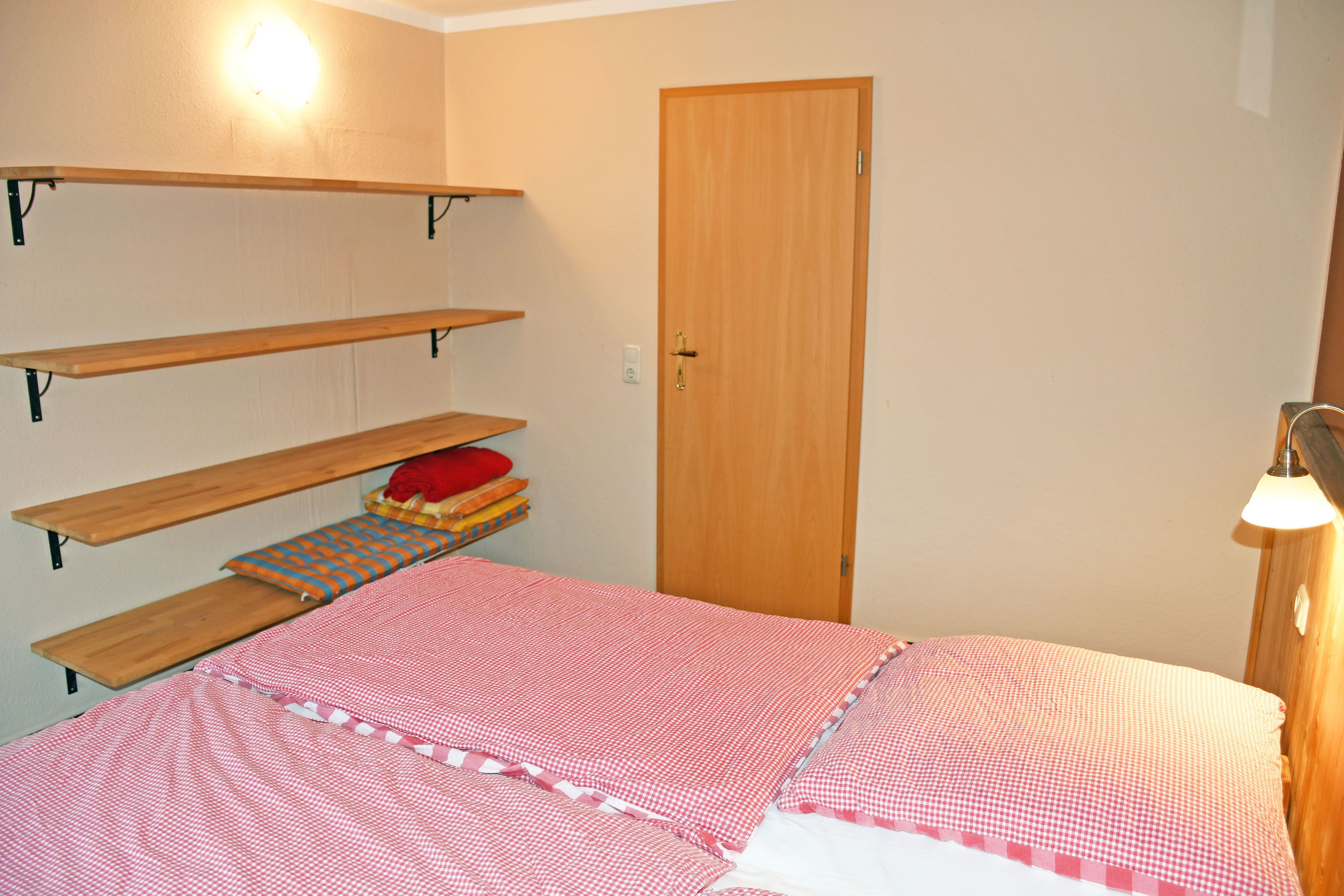 Im separaten Schlafraum befinden sich ein Doppelbett mit Ablagen und Leselampen sowie ein großes Ablageregal.