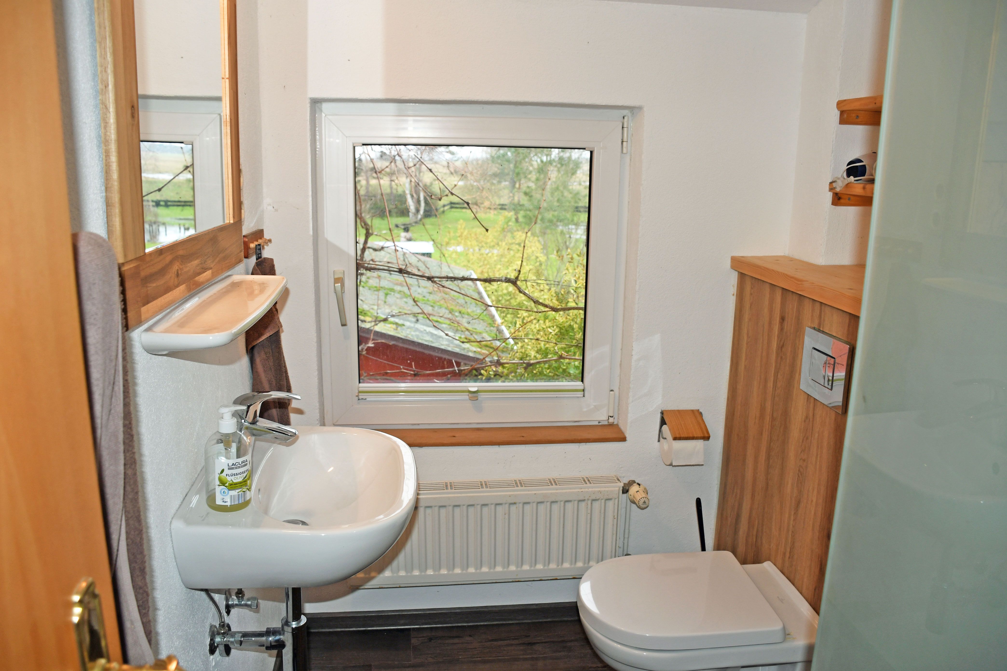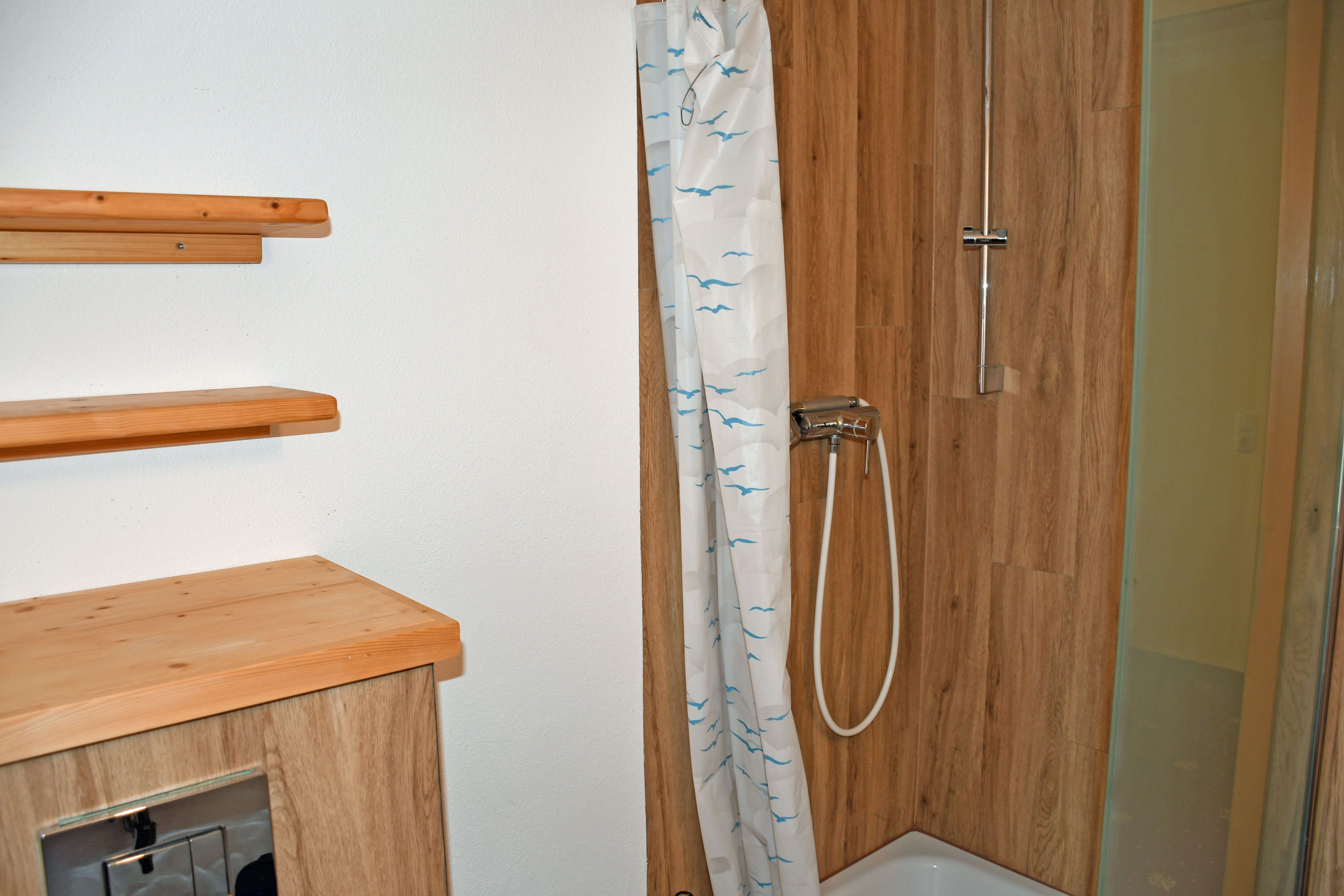 Das Bad ist mit Dusche, WC, Fön und Waschtisch ausgestattet.