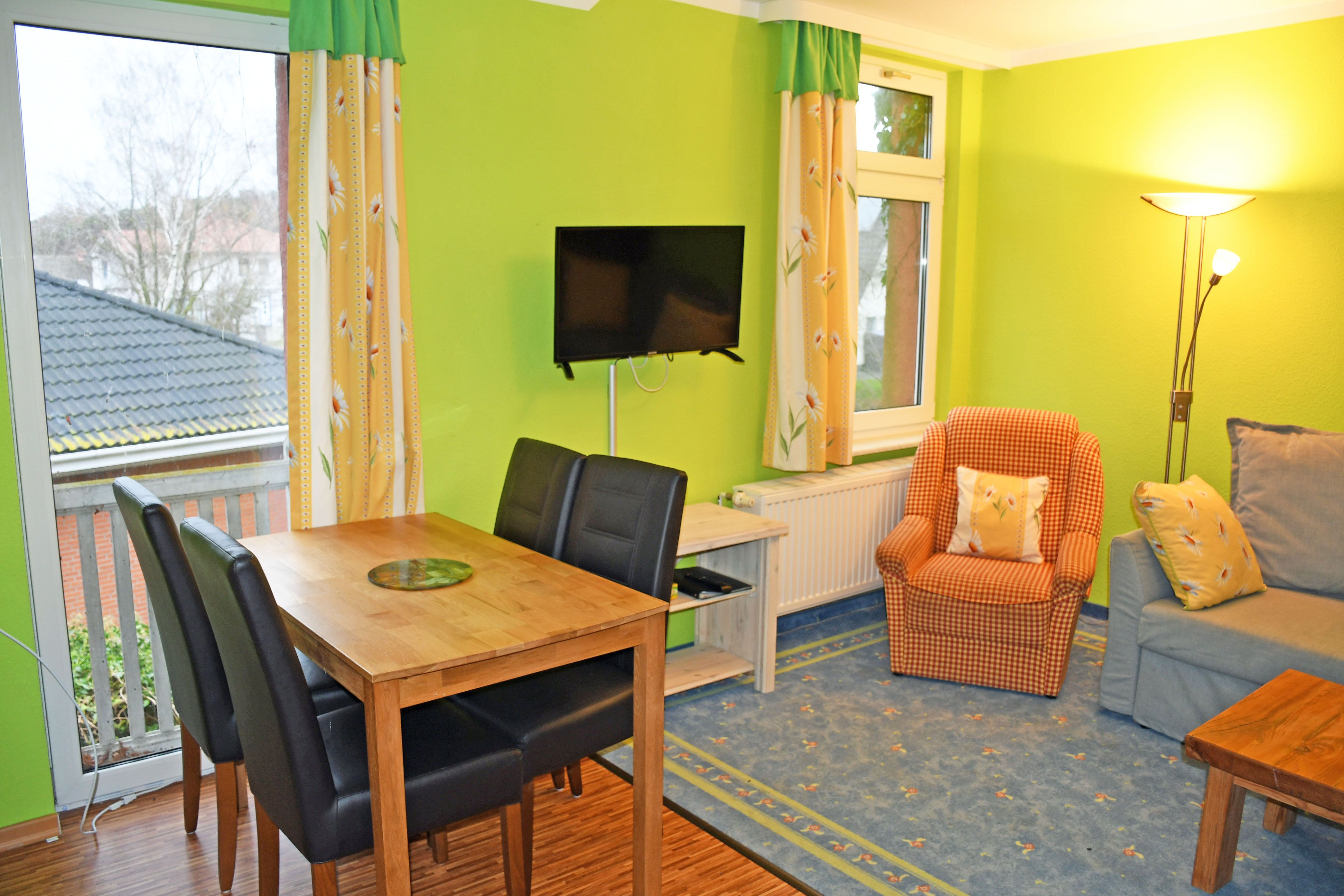 Im kombinierten Wohn-/Küchenbereich befinden sich ein Schlafsofa, welches ausgeklappt Platz für 2 Erwachsene bietet, ein Tisch und ein TV-Gerät. Hier steht auch ein Esstisch mit 4 Stühlen.