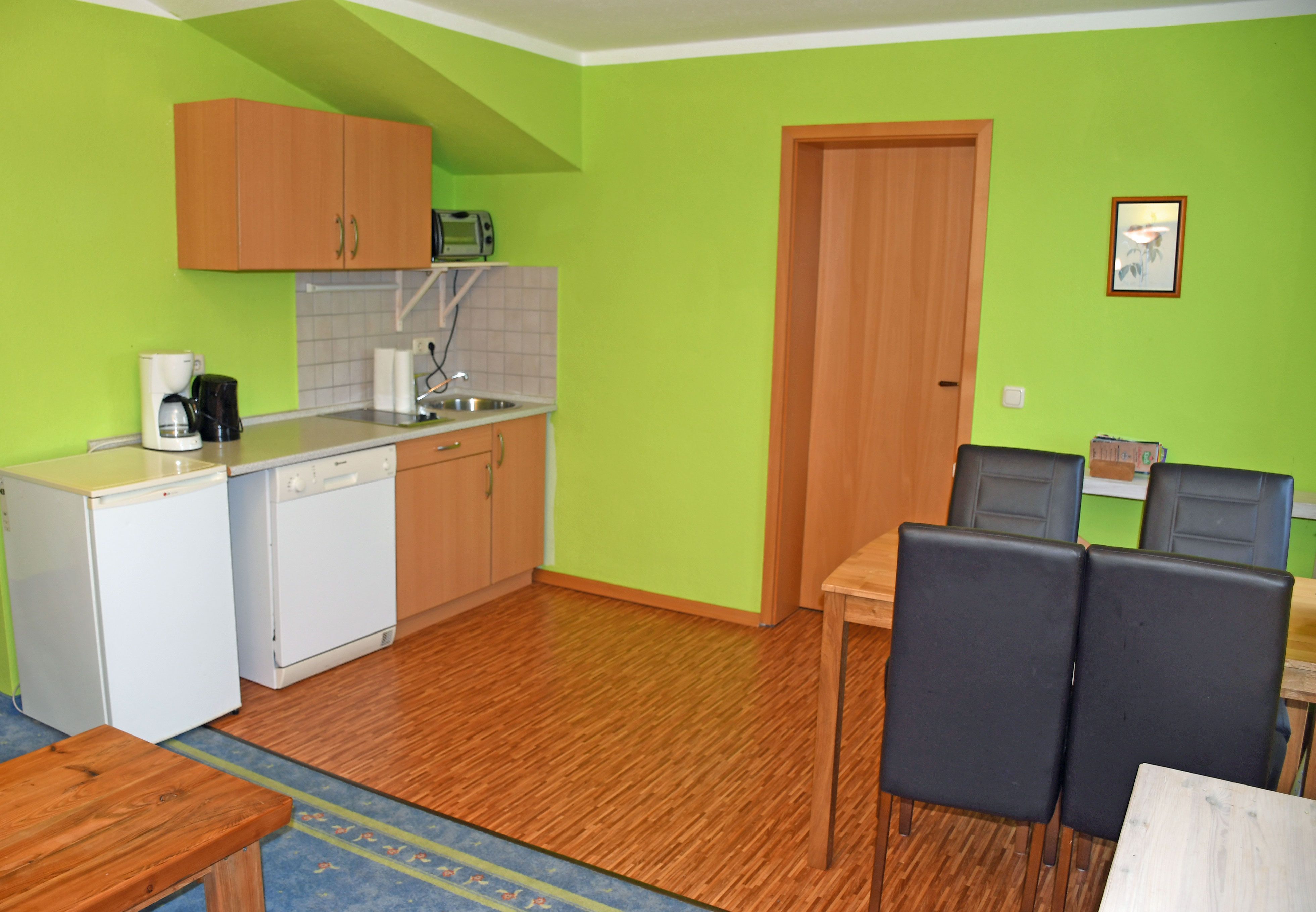 Die Pantry-Küche ist ausgestattet: 2 P. E-Herd, Spülmaschine, Minibackofen, Kaffeemaschine, Wasserkocher, 6-Set-Ess-Geschirr und Besteck, kleine Auswahl an Gläsern, kleine Topfsammlung, ein paar kleine Küchenhelfer --- Grundausstattung!!!