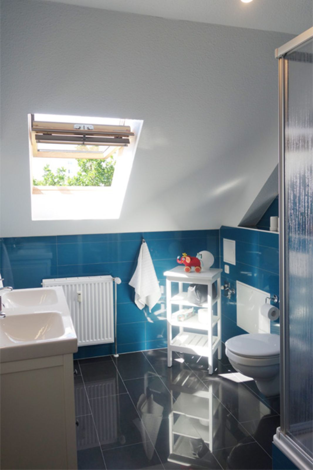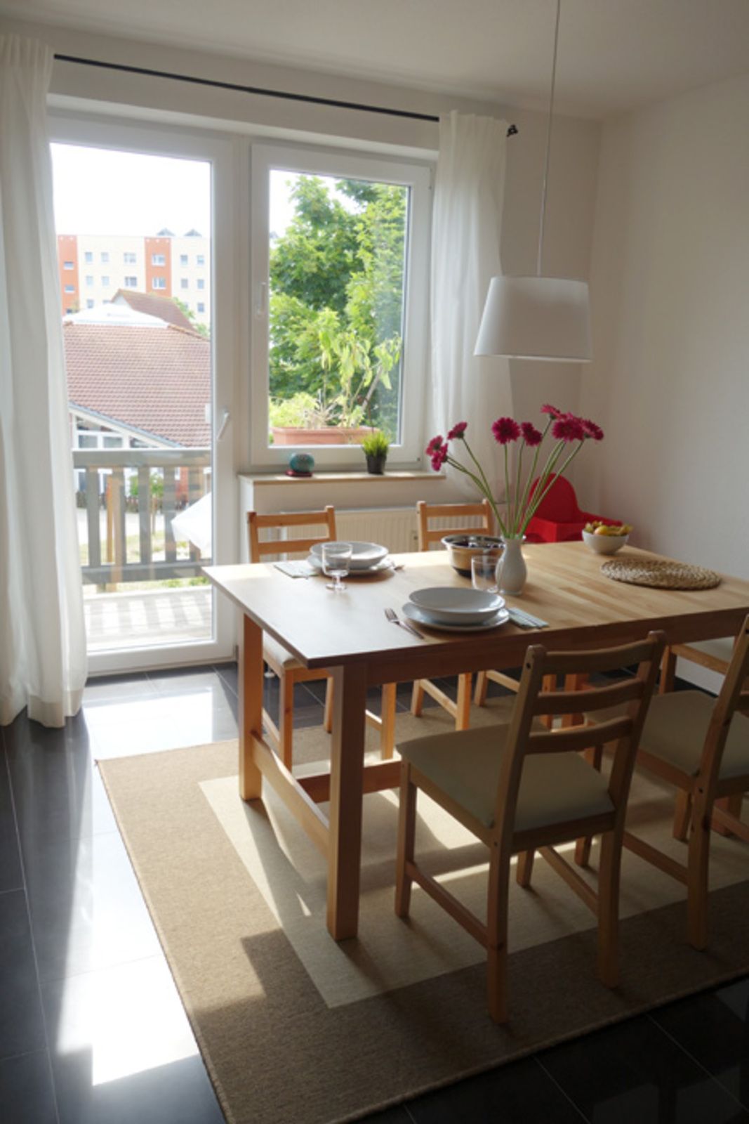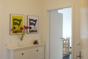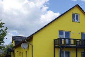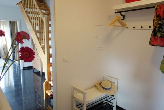 Sie befindet sich in der 1. (und 2.) Etage eines zweigeschossigen Neubaus (Erstbezug Juli 2014) und verfügt über 80 m². Die beiden Etagen sind durch eine interne Treppe miteinander verbunden. In der unteren Etage befindet sich die moderne Küche mit großem Essbereich und einem Sonnenbalkon, ein Schafzimmer mit Doppelbett und ein großes Badezimmer mit Dusche, Doppelwaschbecken und WC. Eine Holztreppe (mit Kindersicherung) führt vom Esszimmer in die obere Etage (Dachgeschoss) direkt in den Wohnbereich. Dieser ist mit einer Sitzgruppe (Sofa und Schlafcouch und Tische), einem TV und einer Kinderspielecke ausgestattet. Neben dem Wohnbereich befindet ein weiteres Schlafzimmer und ein WC. Die Böden sind in der gesamten Wohnung großflächig gefliest und in den Sitzbereichen mit Teppichen ausgelegt. Die Ausstattung des Hauses und der FeWo ist gast- und familienfreundlich. Die Lage der Zimmer ist von der Straßenseite abgewandt.