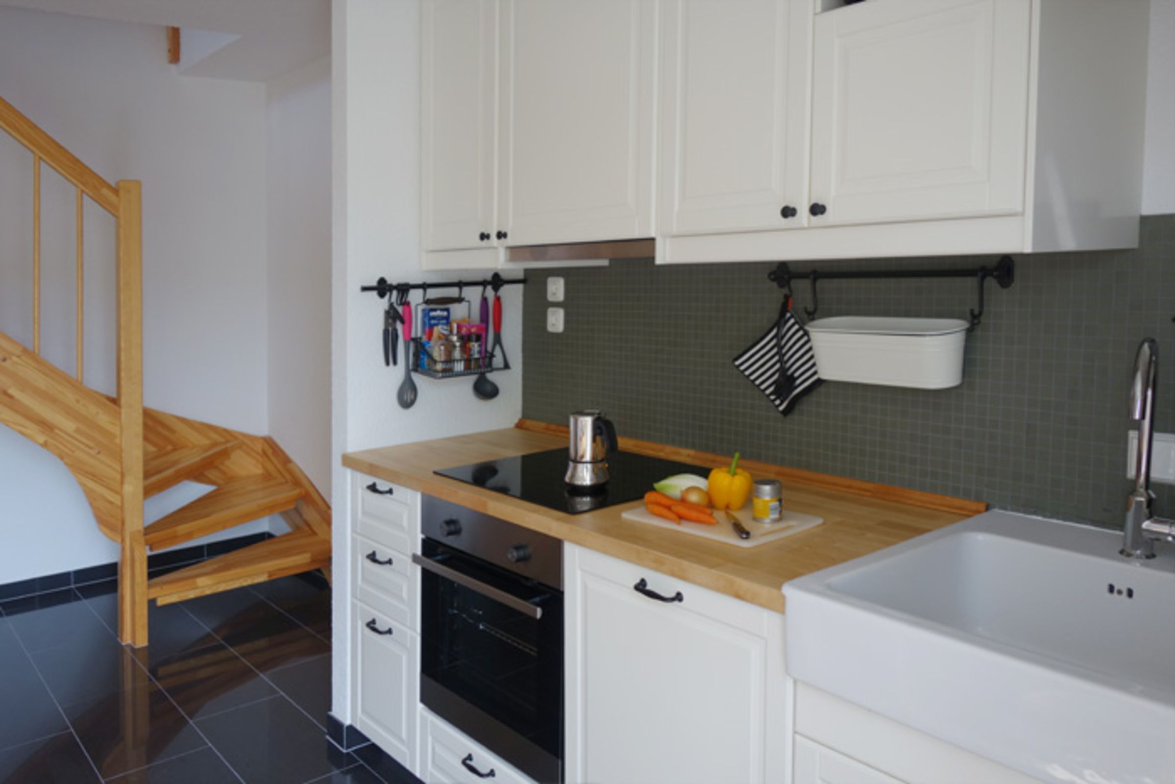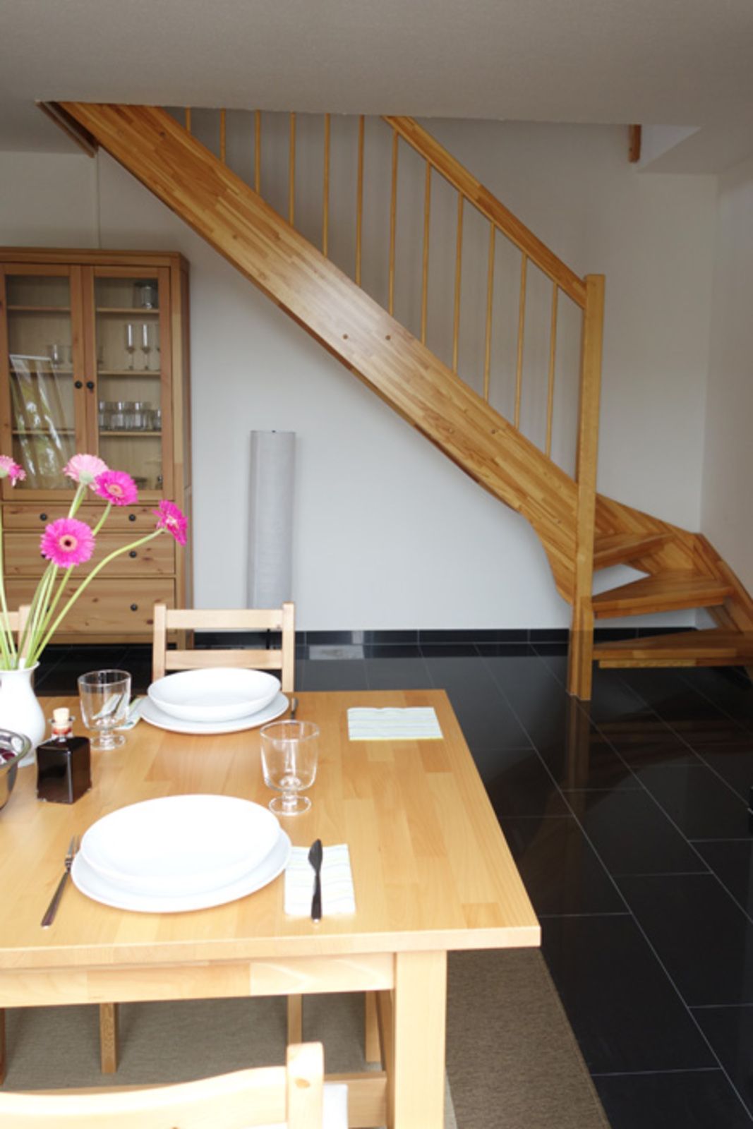 3-Zi-Maisonette-Ferienwohnung (Nichtraucher) zum Wohlfühlen mit Balkon: 2 Schlafzimmer, Küche mit großem Essbereich, Wohnbereich mit Schlafcouch und einer zusätzlichen Couch, Badezimmer mit WC (weiteres WC im Obergeschoss), Holztreppe mit Kindersicherung. Die Küche ist komplett ausgestattet und verfügt u.a. über einen Herd mit Ceranfeld-Kochplatten, einen Backofen, Dunstabzug und einen Geschirrspüler.