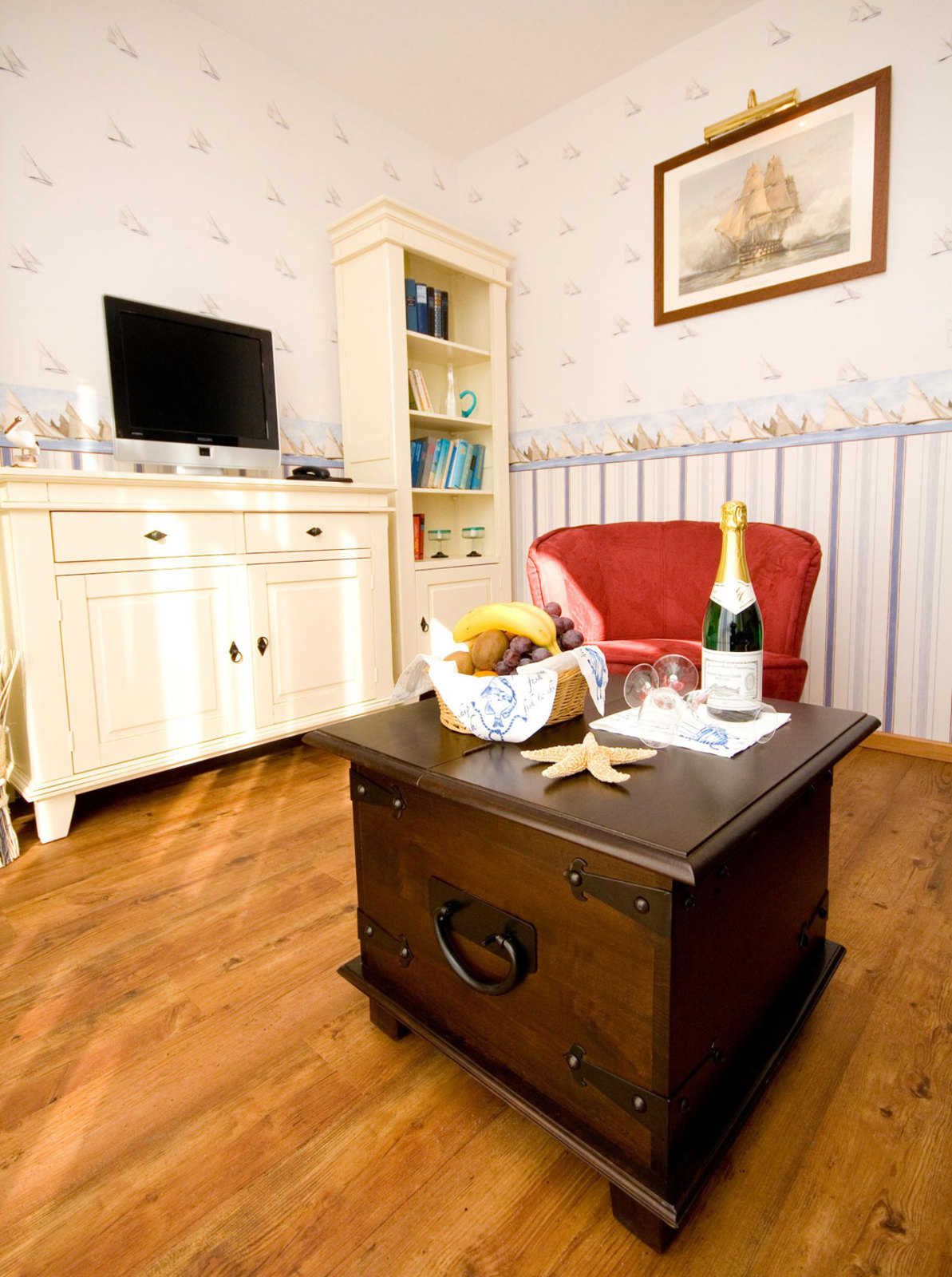 Unsere modern und originell eingerichteten Kapitänssuiten (ca. 38 qm, max. 3 Gäste) sind hell und freundlich, mit Naturholzmöbeln ausgestattet. Sie befinden sich in den separat liegenden Gästehäusern, verfügen über einen eigenen Eingang und eine Sonnenterrasse mit Gartenmöbeln.