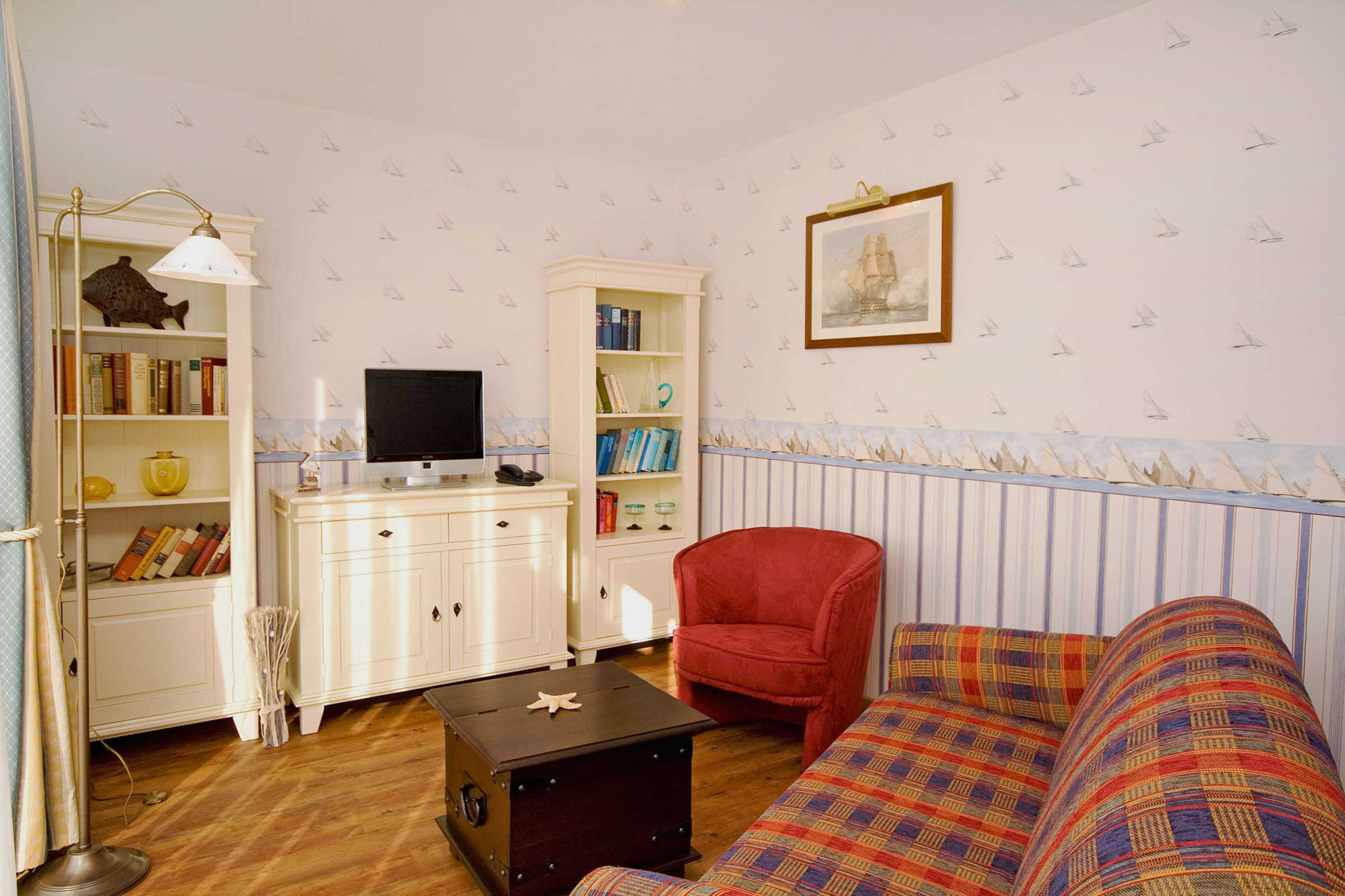 Zur weiteren Ausstattung der Kapitänssuiten gehören ein modernes Flachbild-TV-Gerät, Radio, Minibar, Internet-LAN und Telefon sowie ein Schreibtisch mit Sessel. Ein kleines Reisebett für Kinder bis 3 Jahre kann gern gegen Aufpreis von 5 Euro je Übernachtung zu gebucht werden.