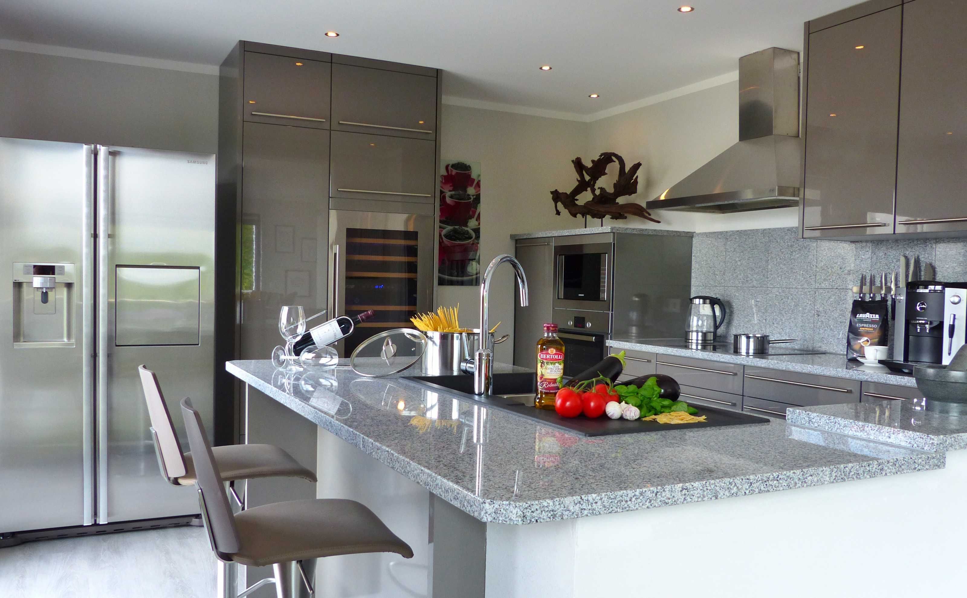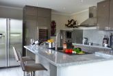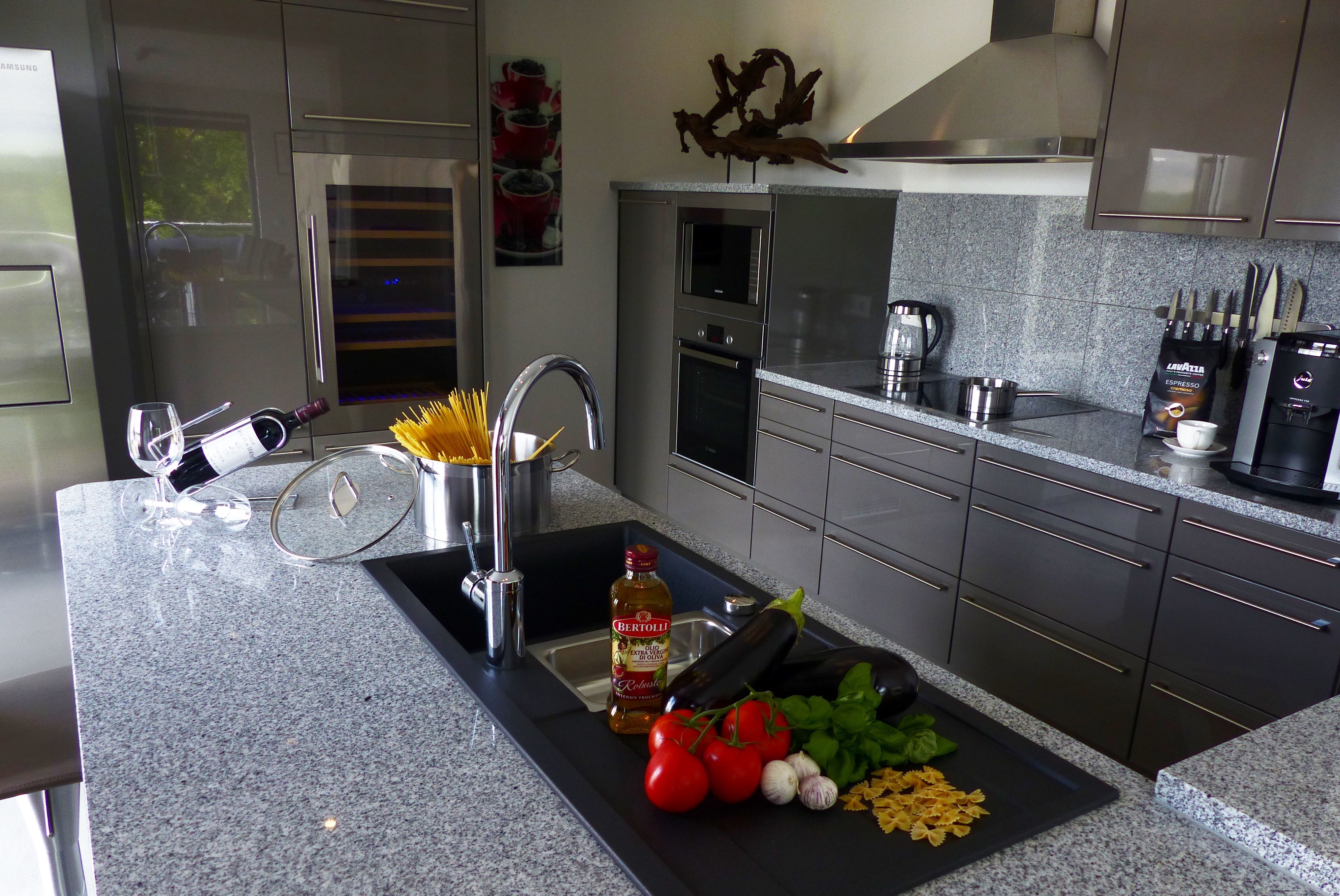 • luxuriöse Küche mit Granitarbeitsplatten, u. a. mit Geschirrspüler, Side-by-Side-Kühlschrank mit Eiswürfelbereiter, Weinkühler, JURA F50 Kaffeevollautomat