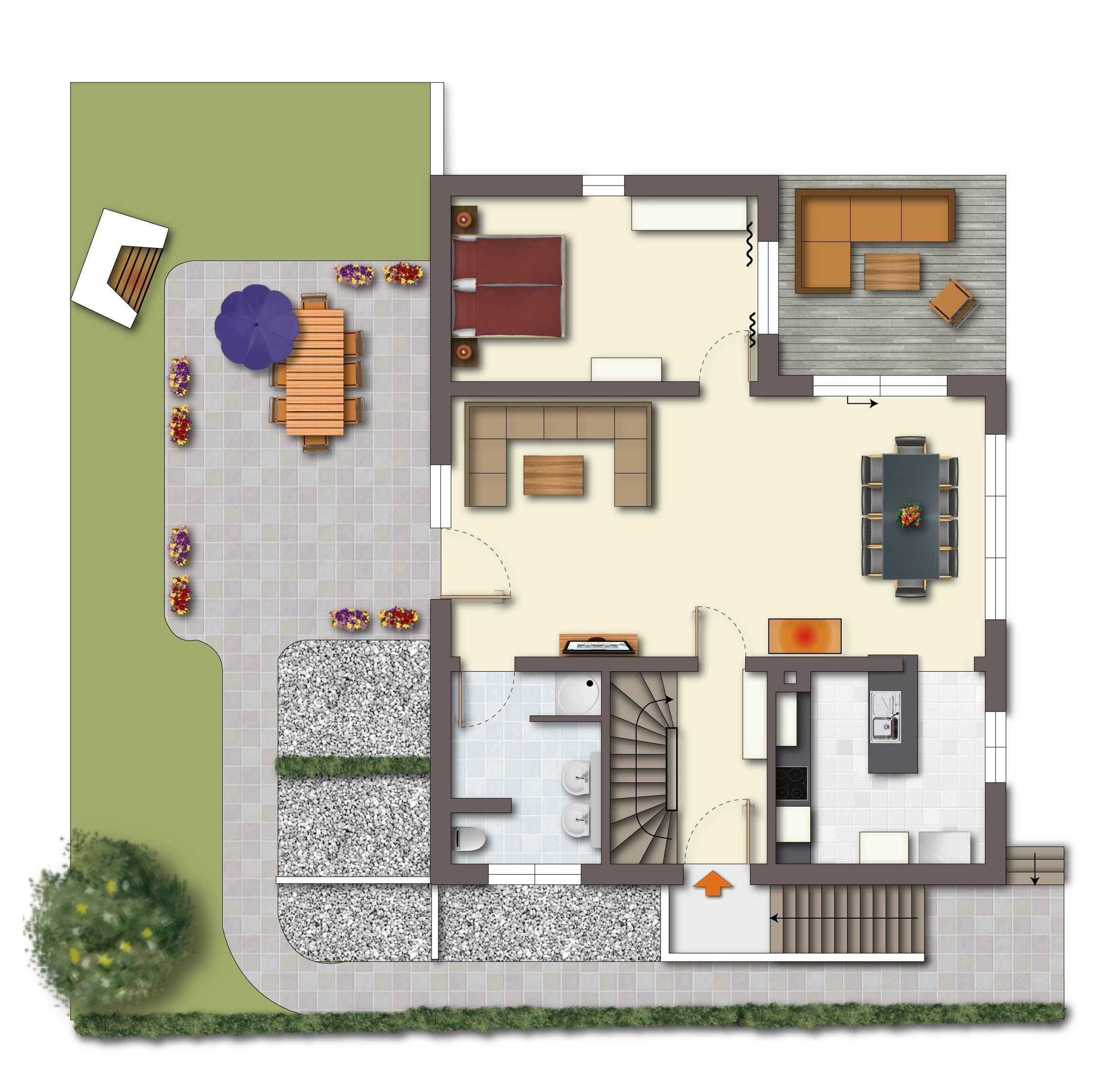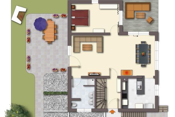 • 1 Terrasse zur Gartenseite: 6,50m x 4,50m mit Grillecke sowie Tisch und Stühle für 8 Personen