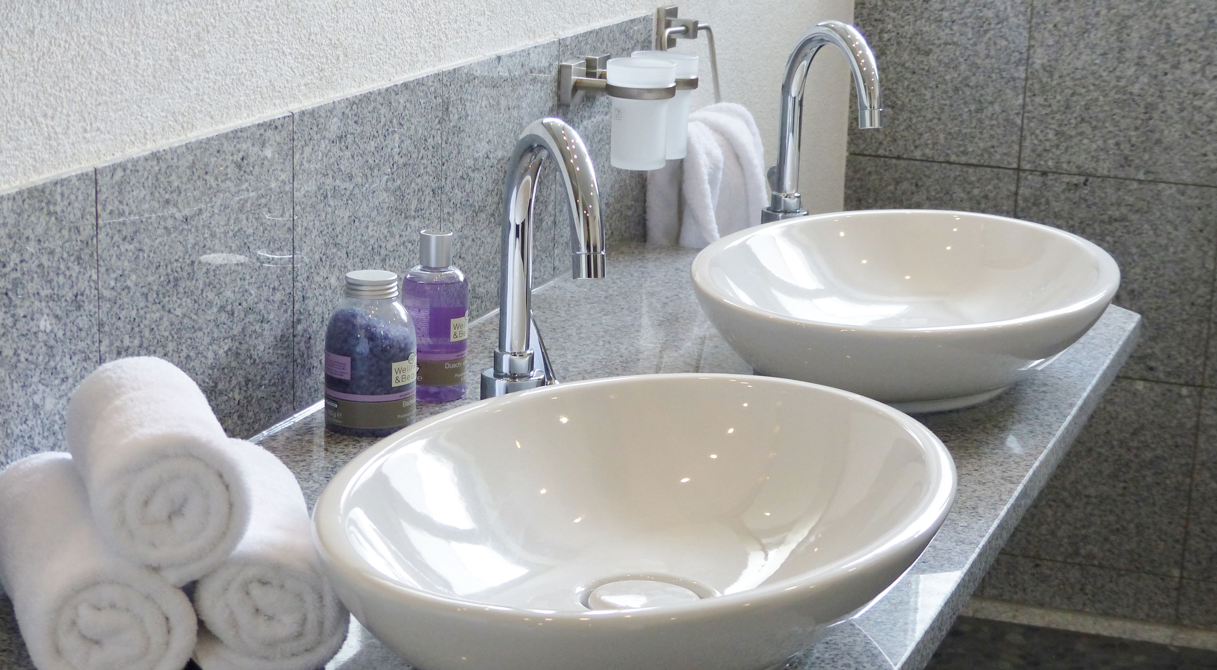 • Echtglas-Walk-In-Dusche, 2 Waschtische, Fön, Fenster mit Sichtschutz, Granitfußboden, Markenarmaturen bzw. -objekte
