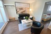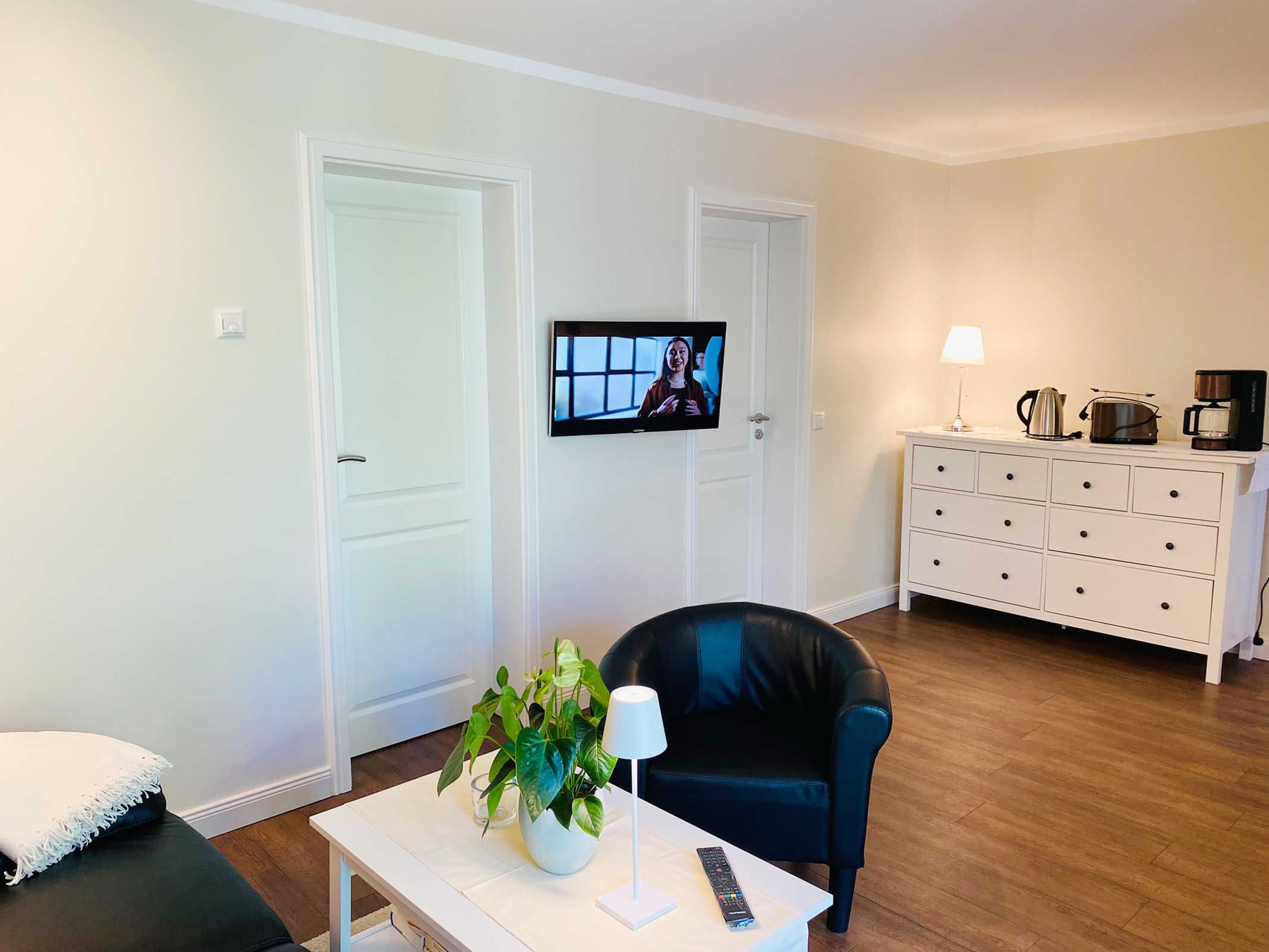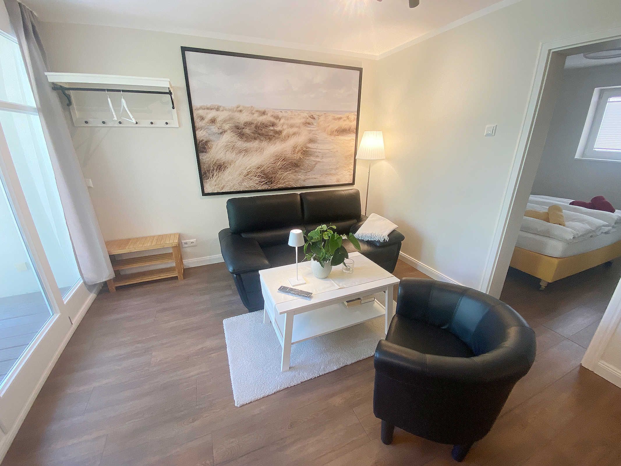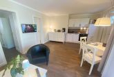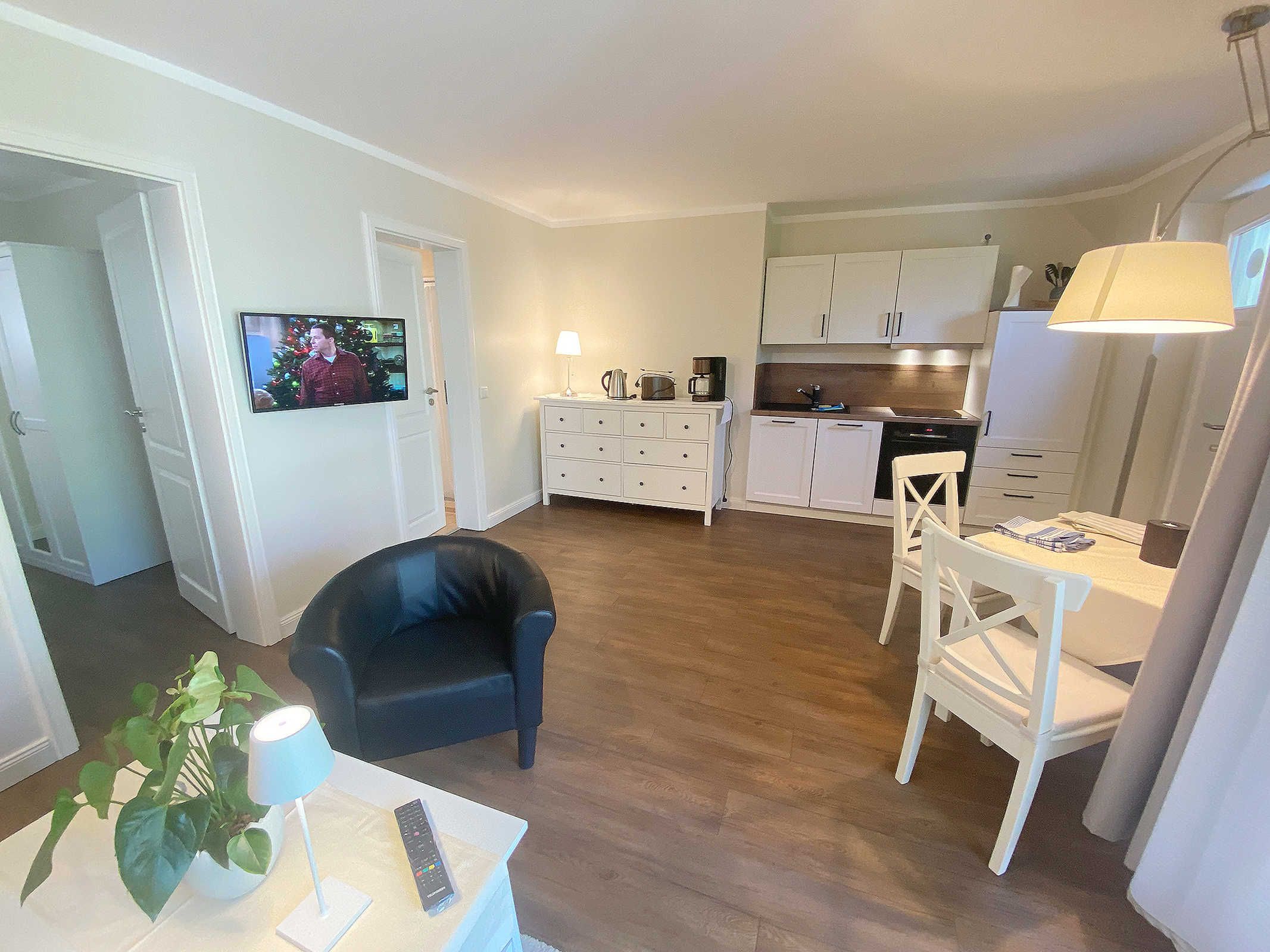 Wohnzimmer mit bequemer Couch und Sessel, Essecke, SAT-TV, Kompaktstereoanlage mit Radio und CD, Einbauküche mit gehobener Ausstattung sowie Ceranfeld, Backofen, Geschirrspülmaschine, Dunstabzug und Kühlschrank, Schlafzimmer mit Doppelbett (1,60 m x 2 m), Kleiderschrank, Kommode und 2 Nachttischen, Großzügiges Badezimmer mit ebenerdiger Dusche, WC, Haartrockner, Kosmetikspiegel, Handtuchheizung, Terrasse Ost ausgestattet mit Teakholzmöbeln