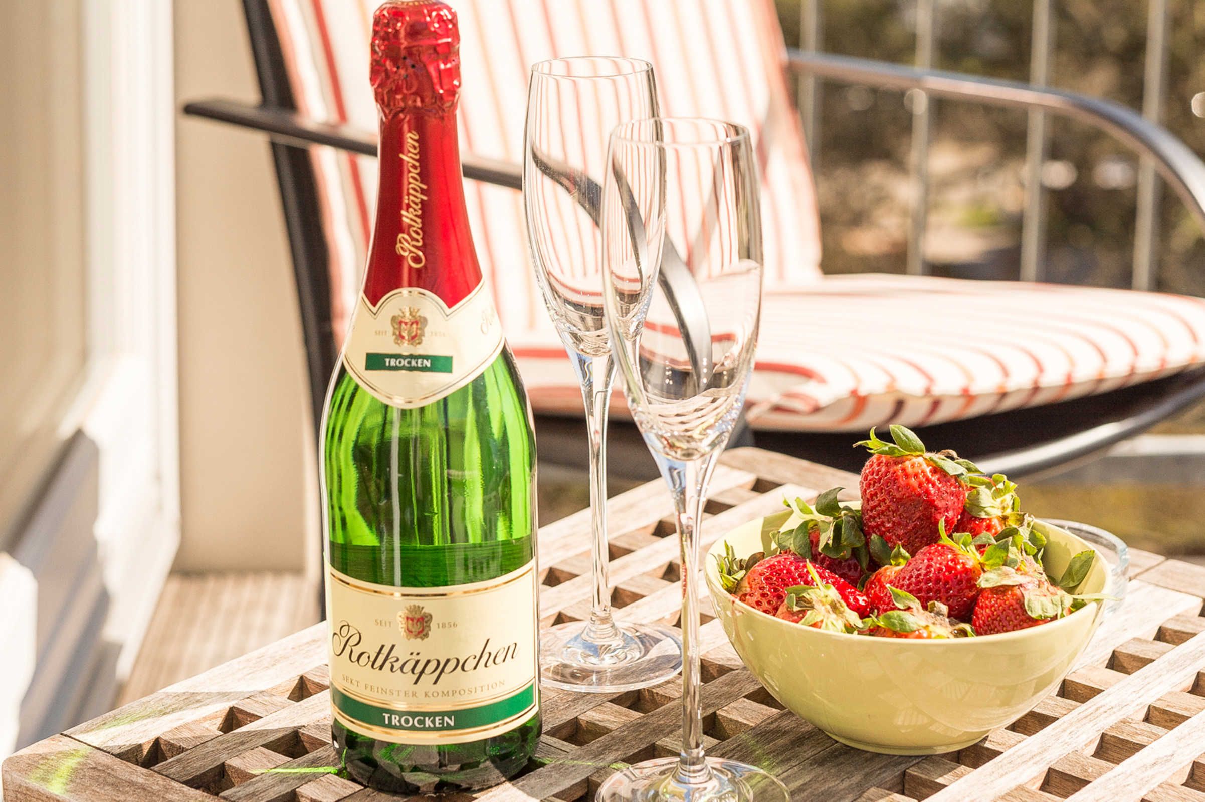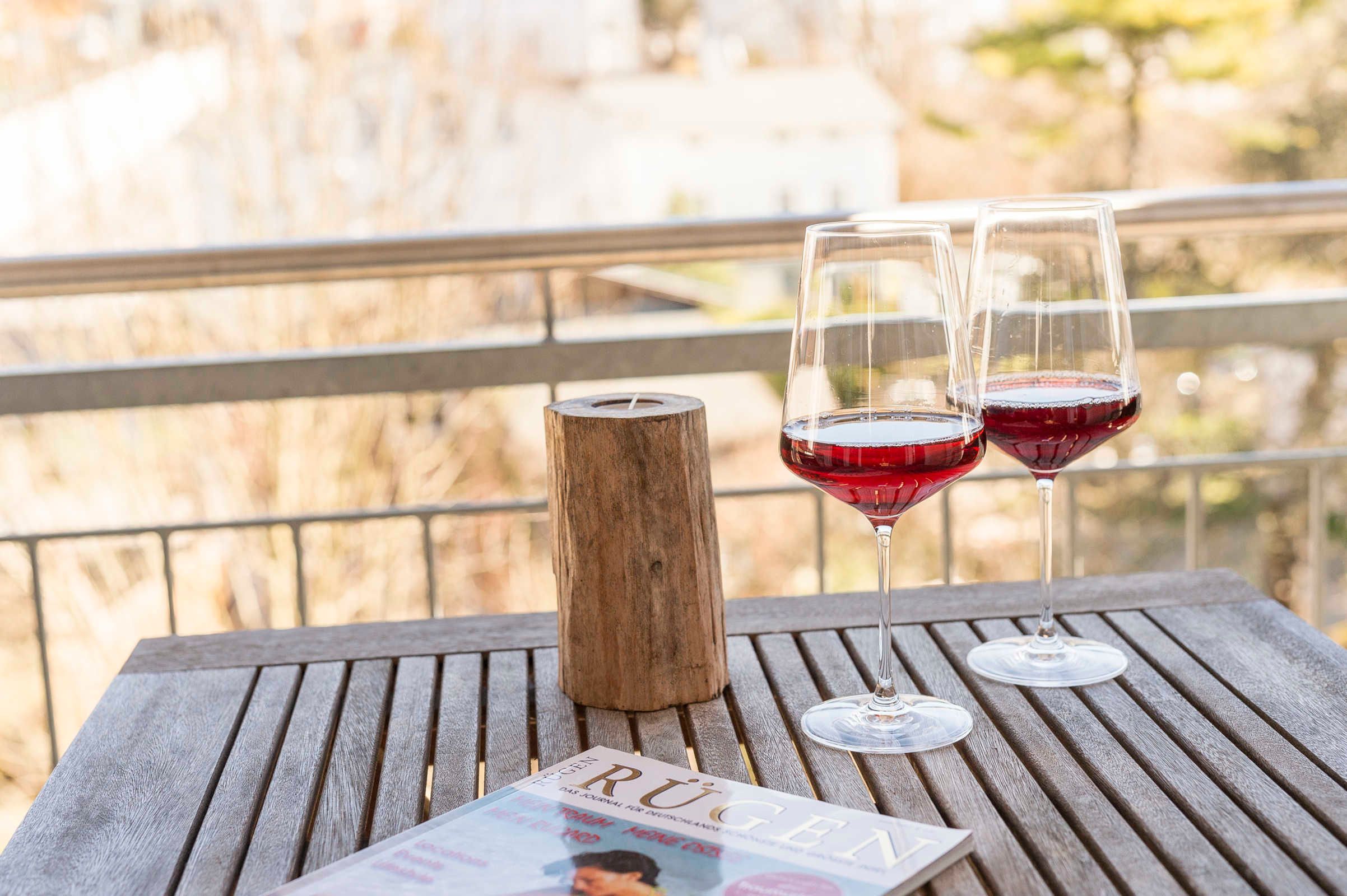 • Balkon Ost mit seitlichem Blick zur Ostsee, Balkon Süd mit direktem Meerblick und Blick über den Alten Markt, Balkone ausgestattet mit Teakholzmöbeln und einer Sonnenliege