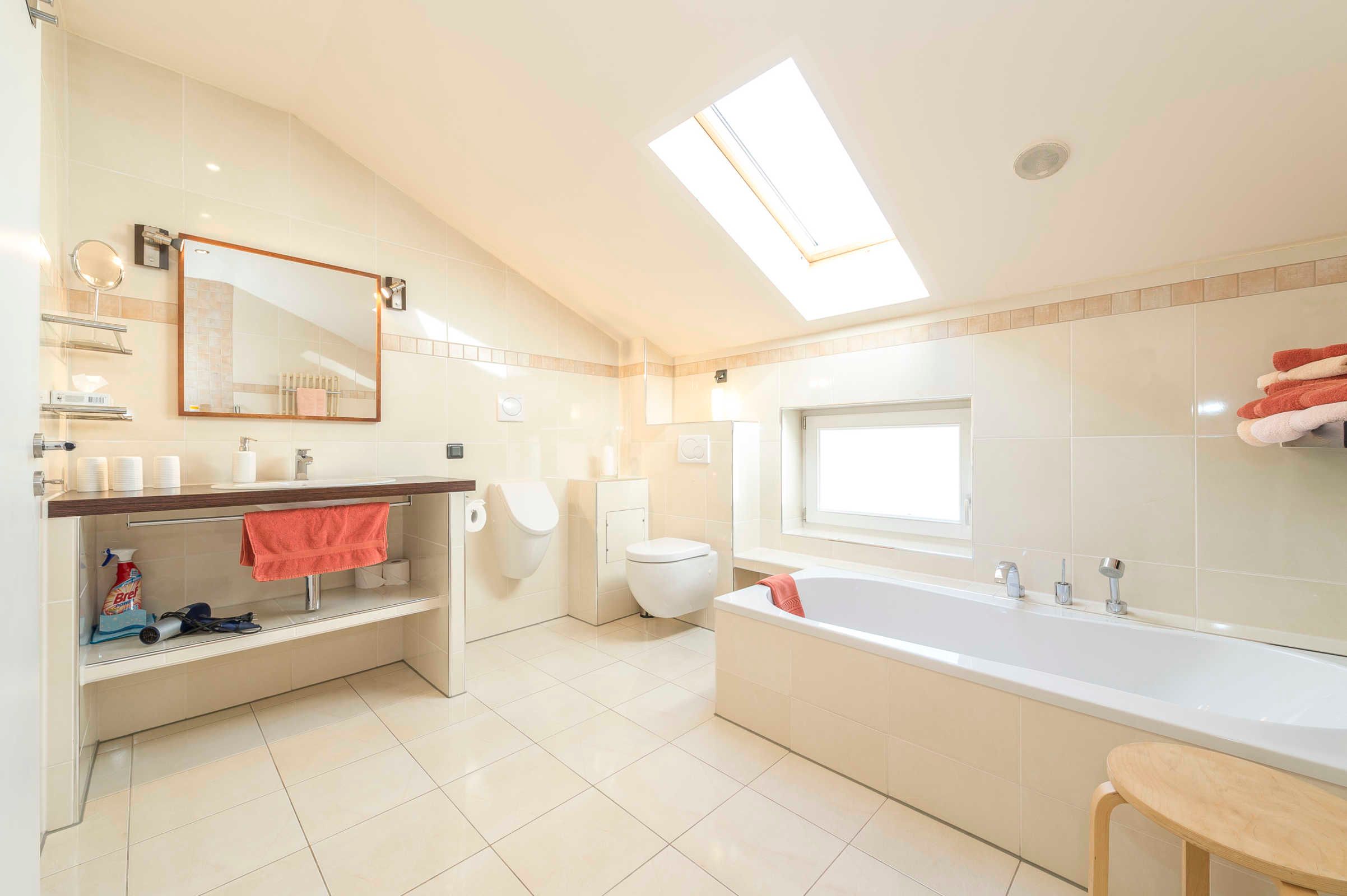 • Extravagantes Badezimmer mit großer Badewanne, ebenerdiger Dusche, WC, Urinal, Haartrockner, Kosmetikspiegel, Handtuchheizung, Fußbodenheizung