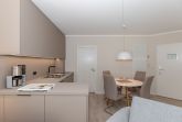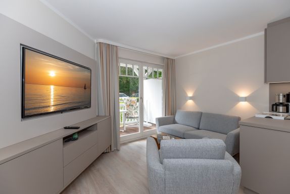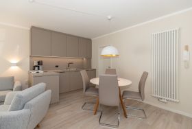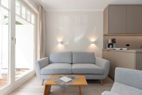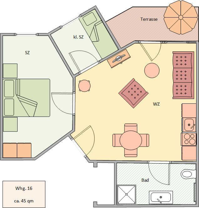 Die Wohnung ist in Parterre gelegen und hat eine Terrasse zur Südseite. Die Wohnungsgröße beträgt ca. 45 qm und teilt sich in Wohnzimmer, Küchenzeile, Schlafzimmer, kl. Kinderzimmer, Duschbad. Im Wohnzimmer befindet sich ein Esstisch mit 4 Stühlen, eine Küchenzeile, Kühlschrank, Cerankochfeld, Mikrowelle mit Backofen, Tresor, HD-Sat TV und Telefon.