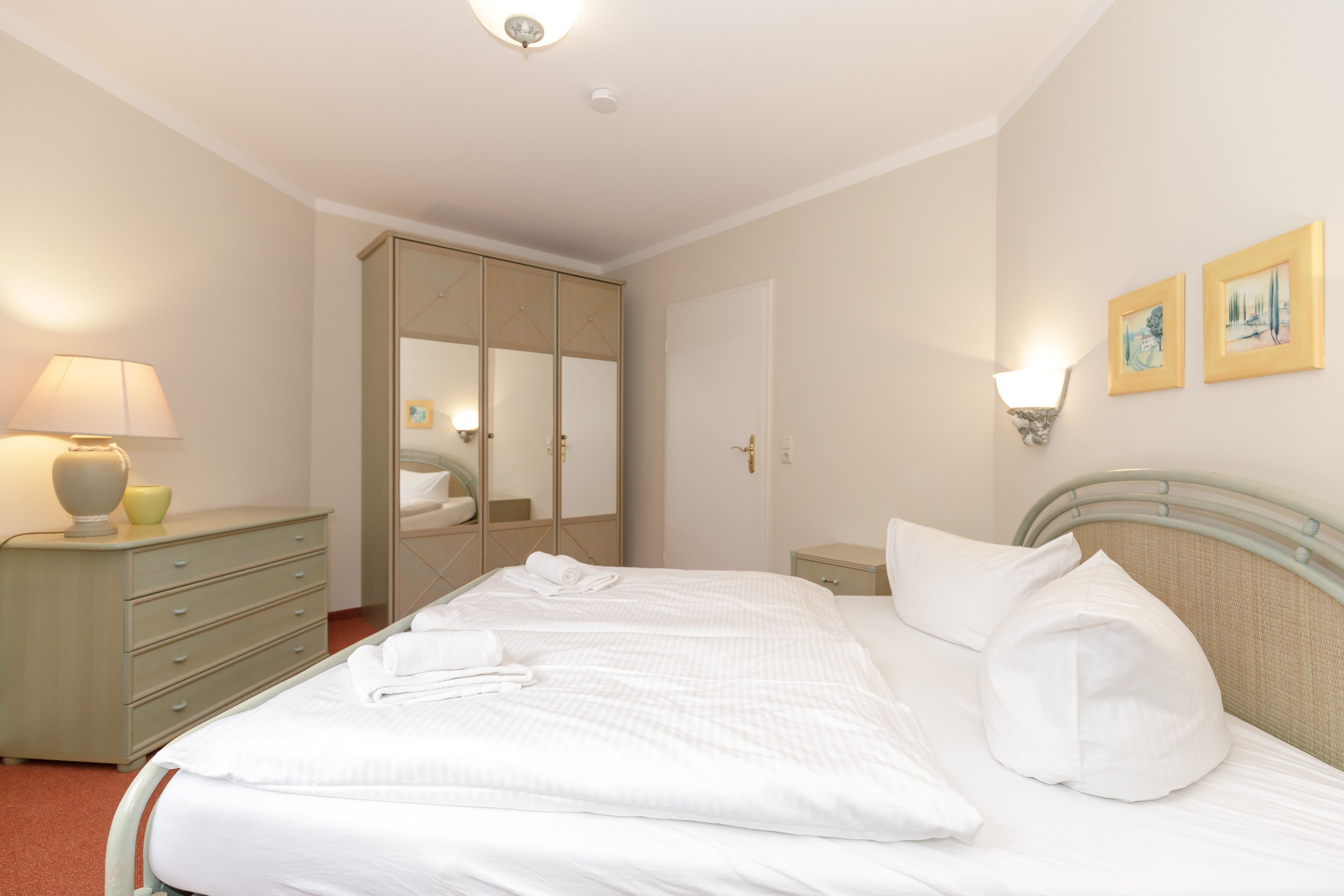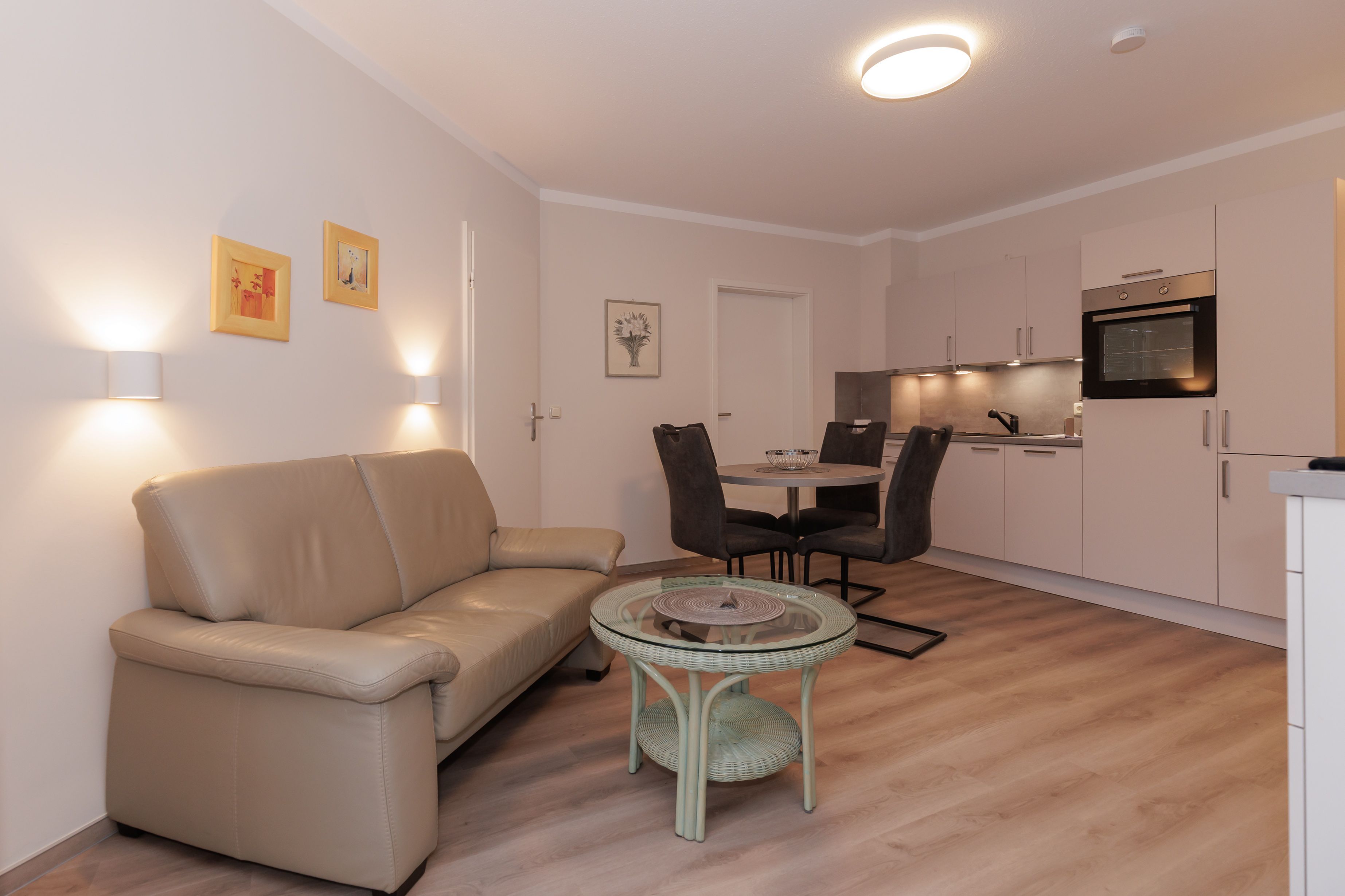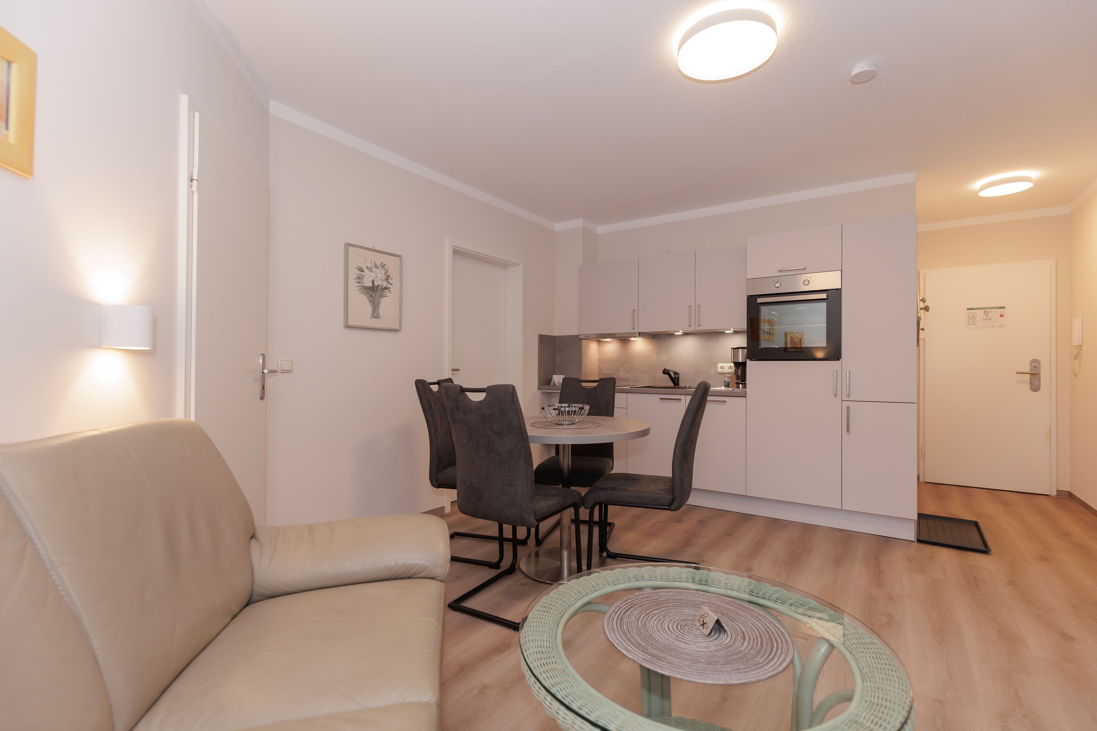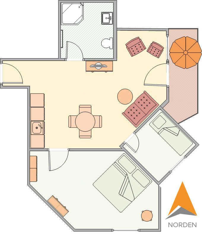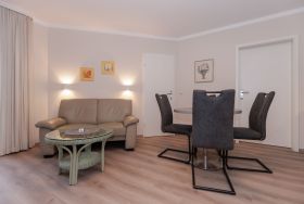Die Wohnung ist in Parterre gelegen und hat eine Terrasse zur Ostseite. Die Wohnungsgröße beträgt ca. 48 qm und teilt sich in Wohnzimmer, Küchenzeile, Schlafzimmer, kl. Kinderzimmer, Bad mit Dusche und Flur. Im Wohnzimmer befindet sich ein Esstisch mit 4 Stühlen, eine Küchenzeile, Kühlschrank, Cerankochfeld, Mikrowelle mit Backofen, Tresor, HD-Sat TV und Telefon.