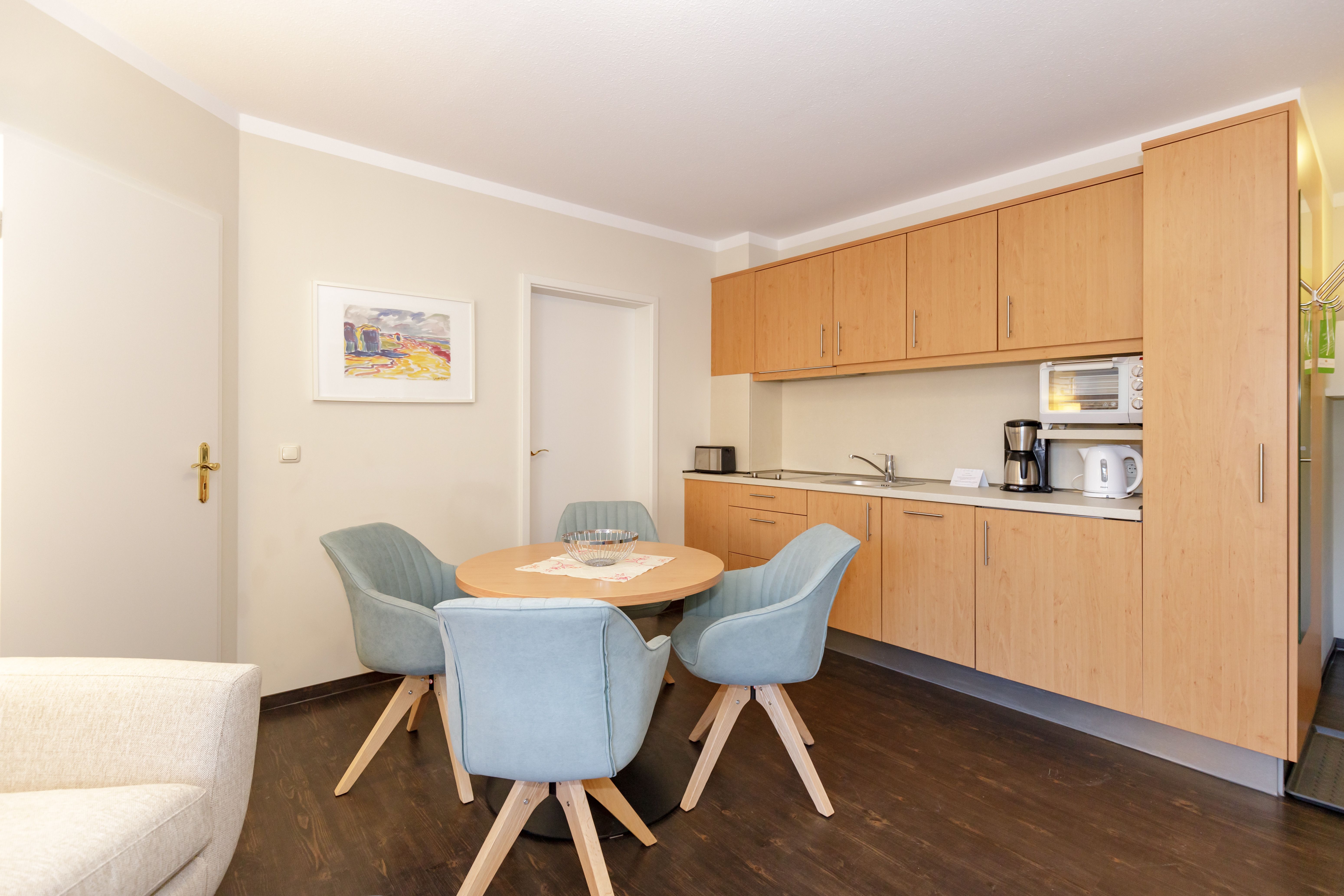 Die Wohnung ist im 1. Obergeschoss gelegen und hat einen Balkon zu Ostseite. Die Wohnungsgröße beträgt ca. 48 qm und teilt sich in Wohnzimmer, Küche, Schlafzimmer, kl. Kinderzimmer, Duschbad und Flur. Im Wohnzimmer befindet sich ein Esstisch mit 4 Stühlen, Küche mit Cerankochfeld, Geschirrspüler, Kühlschrank, Tresor, HD-Sat TV und Telefon. Die Wohnung wurde modernisiert und neu eingerichtet.
