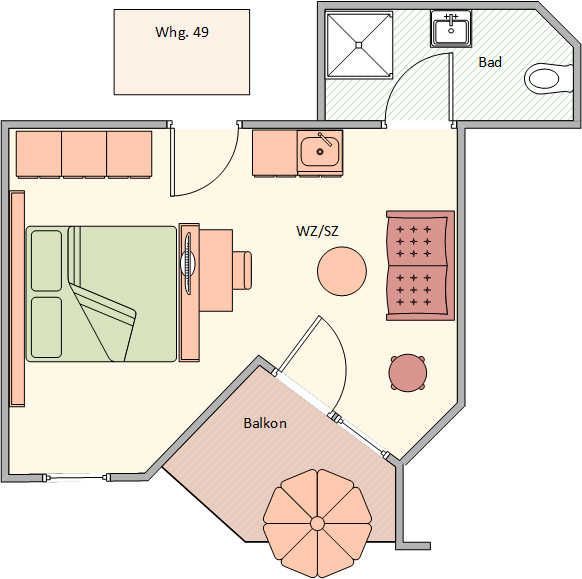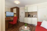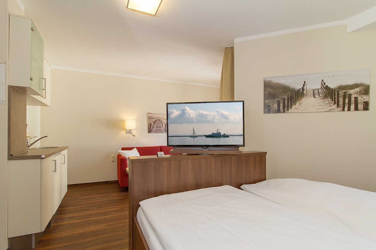 Umfangreich renoviertes 1 Raumappartment mit Platz für 2 Personen. Die Wohnung liegt in der 3ten Etage und ist mit dem Balkon zur Ostseite ausgerichtet. Im Schlafzimmer befindet sich ein komfortables Bett. Das helle Appartement ist mit ansprechenden Polstermöbeln ausgestattet und verfügt über eine kleine Pantryküche.