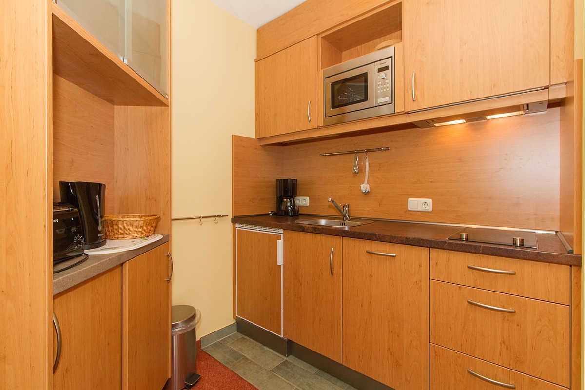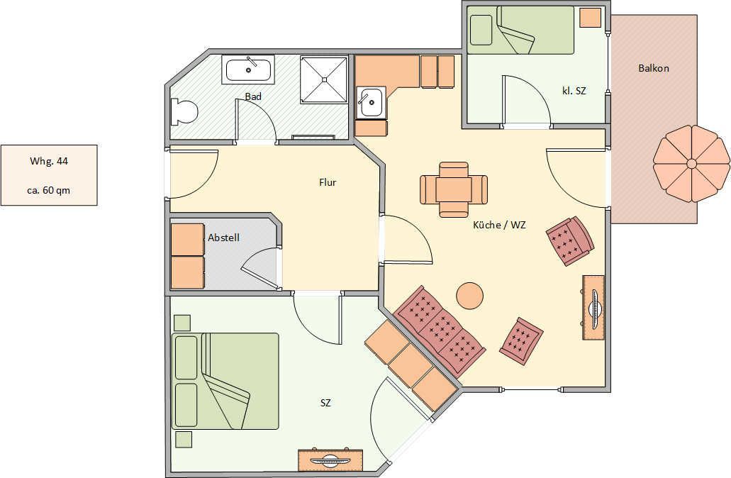 Die Wohnung ist im 3. Obergeschoss gelegen und hat einen Balkon zur Westseite. Die Wohnungsgröße beträgt ca. 60 qm und teilt sich in Wohnzimmer, angrenzende Küche, Schlafzimmer, kl. Kinderzimmer, Duschbad, Flur und Abstellkammer. Im Wohnzimmer befindet sich ein Esstisch mit 4 Stühlen. Küche ist mit einer Spülmaschine, Kühlschrank, Ceranfeld, Mikrowelle mit Backofen, Tresor, HD-Sat TV und Telefon.