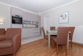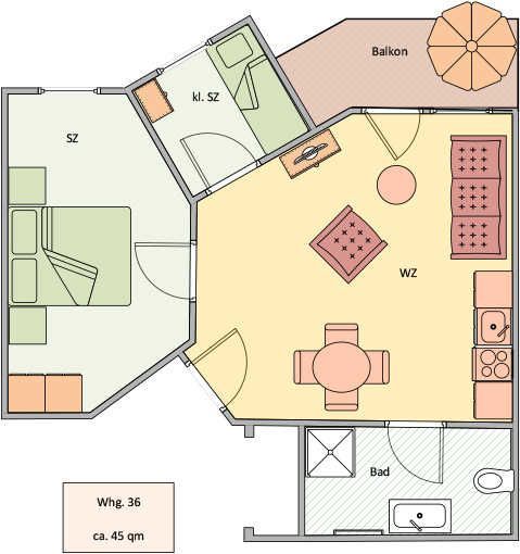 Die Wohnung ist im 2. Obergeschoss gelegen und hat einen Balkon zur Südseite. Die Wohnungsgröße beträgt ca. 45 qm und teilt sich in Wohnzimmer, Küchenzeile, Schlafzimmer, kl. Kinderzimmer, Duschbad. Im Wohnzimmer befindet sich ein Esstisch mit 4 Stühlen, eine Küchenzeile, Kühlschrank, Caranfeld, Mikrowelle mit Backofen, Tresor, HD-Sat TV und Telefon.