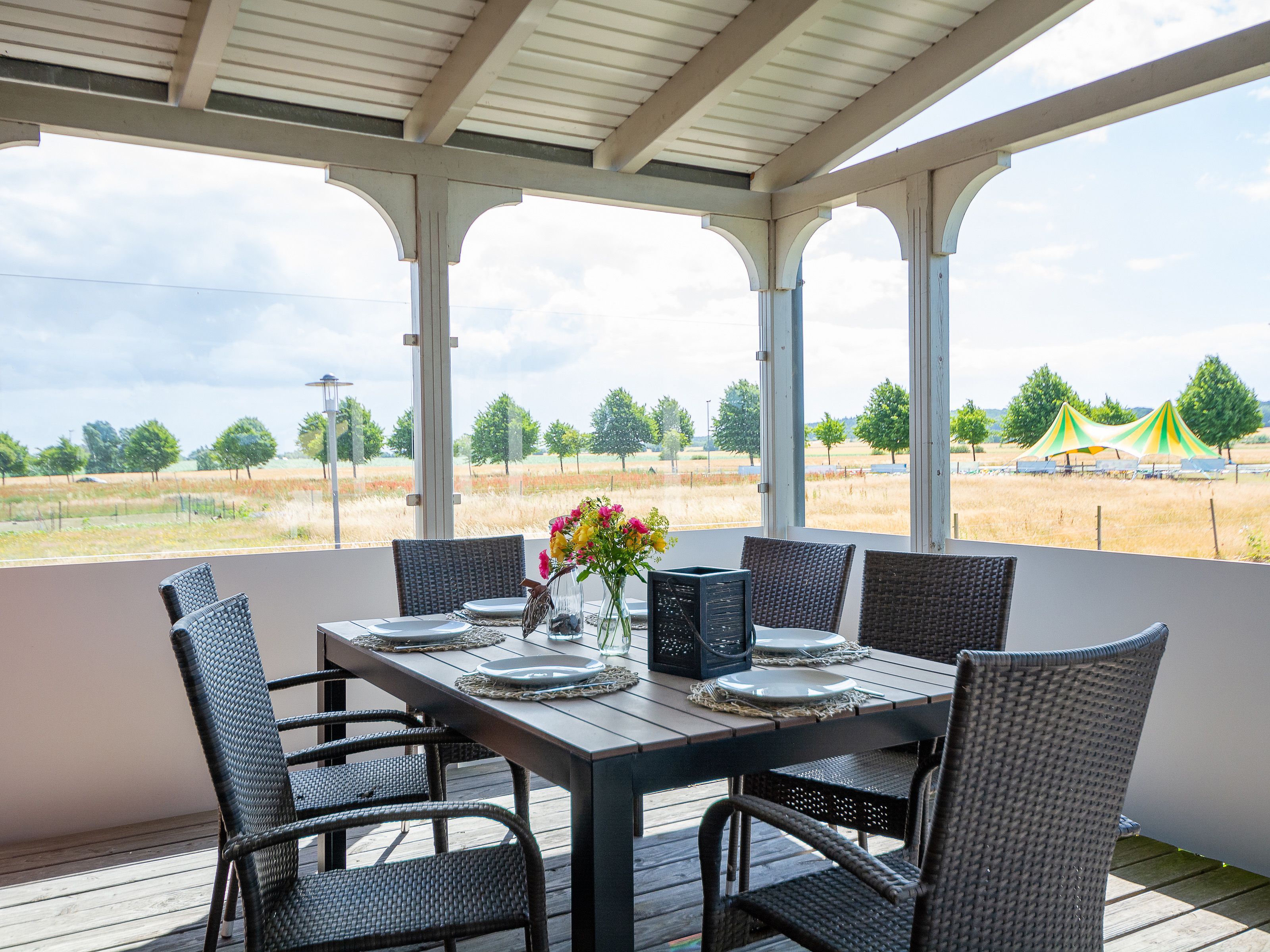 Sie wohnen in einem ca. 120 m² großen Ferienhaus, das über 2 Etagen verläuft. In der 1. Etage befindet sich der große Wohnraum mit einem geräumigen Essbereich und die separate moderne Küche mit 4-Platten Ceranfeld, Backofen, Geschirrspüler, Kühlschrank etc.. Von der Küche gelangen Sie auf den großzügigen Balkon und haben einen fantastischen Blick auf eine angrenzende Koppel. Auf dieser Etage befindet sich ebenfalls ein Gäste-WC. In der 2. Etage befinden sich die 3 Schlafräume (2x ein Doppelbett, 1x ein Kojenbett) und das Bad mit Badewanne, Dusche und WC, was das Gesamtbild dieses Hauses vervollständigen.