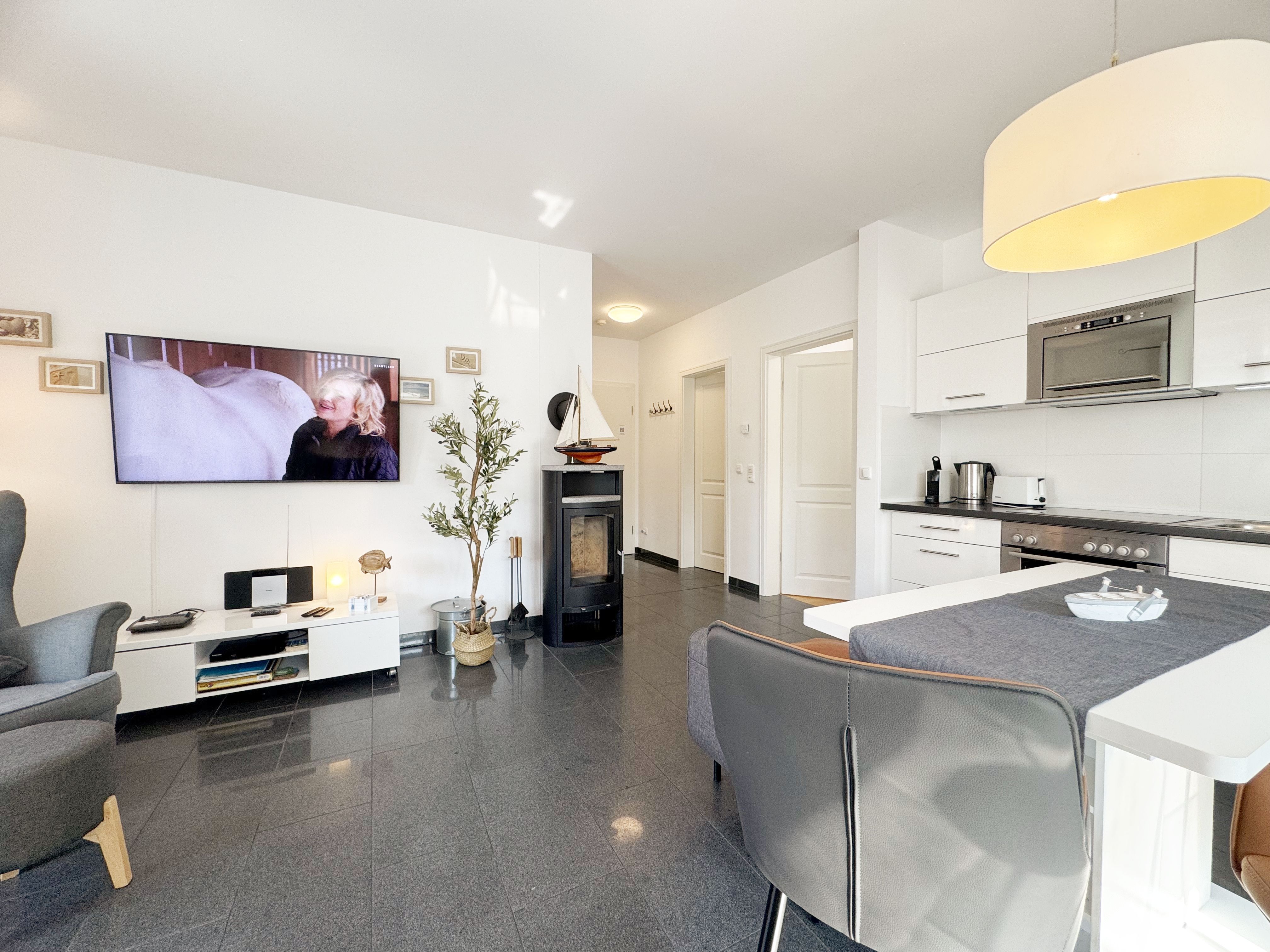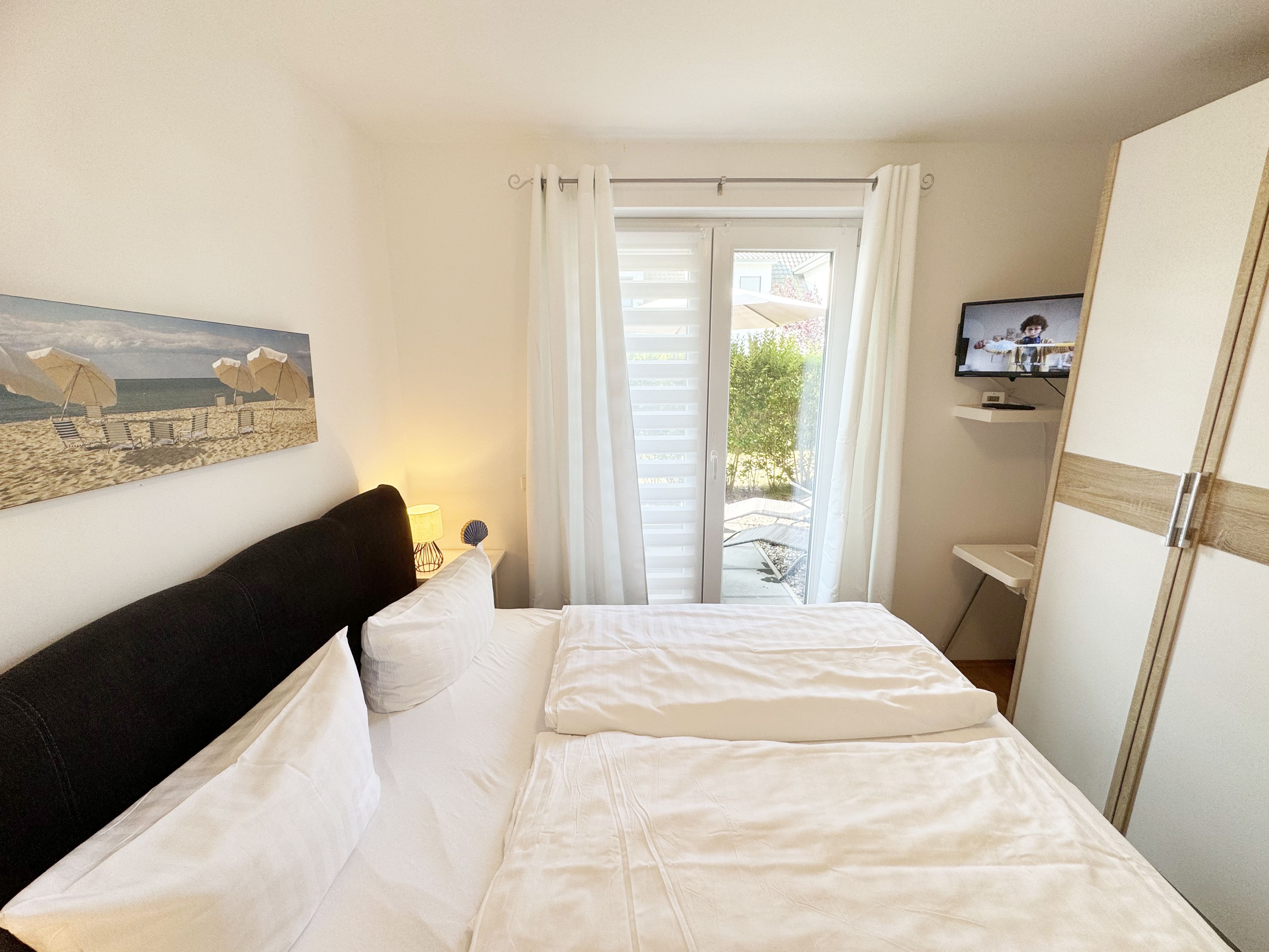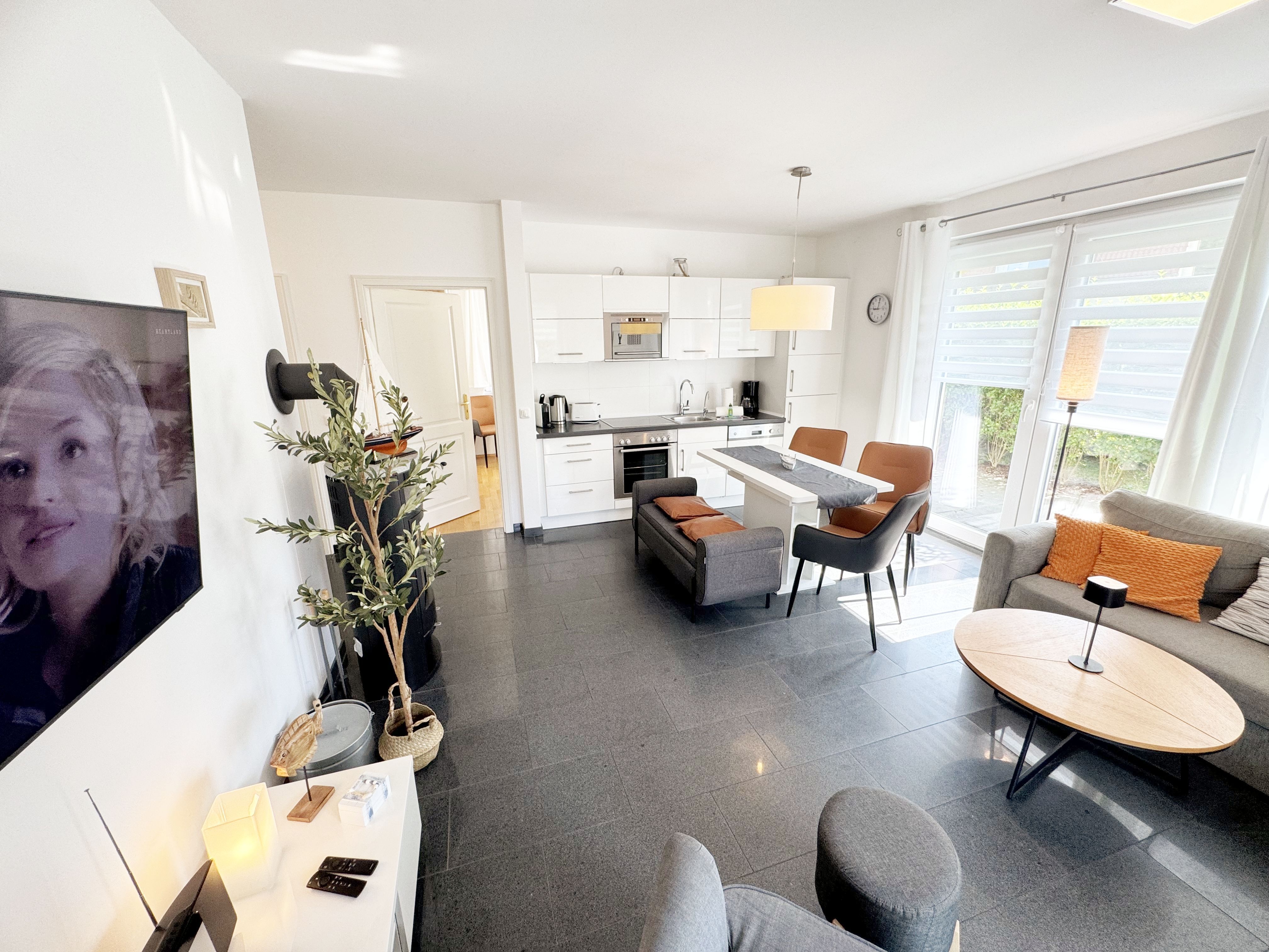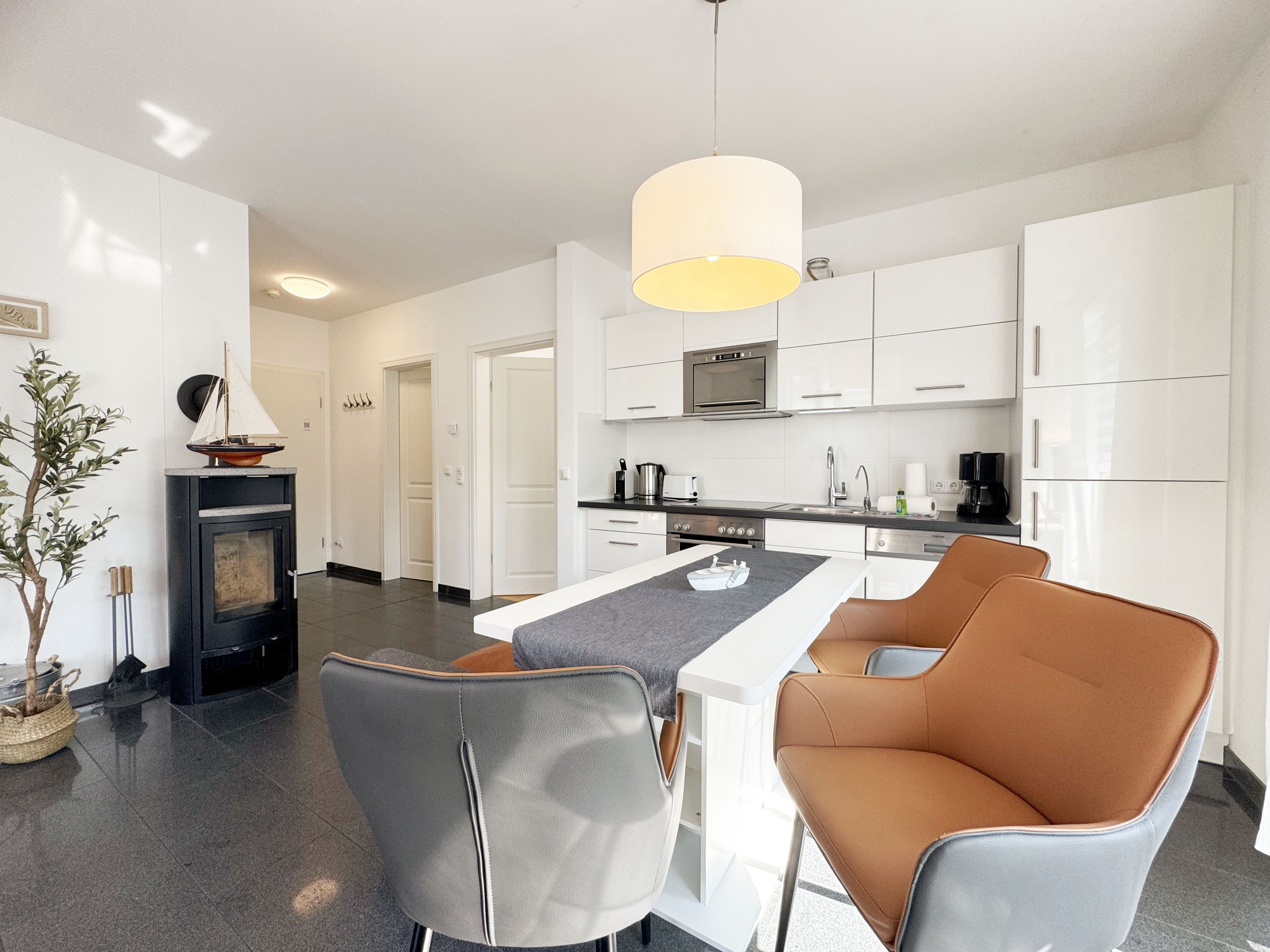 Die helle und großzügige 3-Zimmer-Komfort-Wohnung Nr. 04 im Haus Sanddorn ist modern eingerichtet und besticht durch ihre geschickte Raumaufteilung. Die Nichtraucher-Ferienwohnung mit ca. 67 m² befindet sich im Erdgeschoss des Hauses und bietet Ihnen 2 großen Terrassen. Der Wohnbereich verfügt über eine Eck-Couch (Aufbettungsmöglichkeit 5.Person /1,30m x 2,00m), einen Couchtisch, einen Lesesessel mit Hocker sowie ein TV-Board mit Smart-TV, Blu-Ray-Player und DAB-Radio mit USB, Bluetooth und CD-Player. Ein WLAN-Zugang rundet den technischen Bereich ab. An Gesellschaftsspiele und Urlaubslektüre wurde auch gedacht. An kühleren Tagen sorgt der Kamin für wohlige Wärme und die entsprechende Gemütlichkeit. Kaminholz können Sie gerne dazu buchen. Die angrenzende Küchenzeile fügt sich harmonisch an den Wohnbereich an. Um jede Mahlzeit zu genießen, steht Ihnen ein Kühlschrank mit Gefrierfach, ein Backofen, ein Cerankochfeld, eine Spülmaschine, eine Mikrowelle, eine Kaffeemaschine, eine Nespresso Maschine, ein Toaster, ein Wasserkocher sowie diverse Küchenutensilien zur Verfügung. Ein bequemer Essplatz rundet den Bereich ab. Vom Wohn-/Essbereich kommen Sie auf Ihre bestuhlte und überdachte Terrasse (Osten/Süden). Ein Sonnenschirm, sowie 2 Sonnenliegen, ein Strandkorb und ein Grill sorgen für die richtige Entspannung. Das 1. Schlafzimmer verfügt über ein Boxspringbett (1,80m x 2,00m), Nachttischablagen mit Beleuchtung, einen Kleiderschrank sowie ein Flachbild-TV mit integrierten DVD-Player. Hier haben Sie zusätzlich die Möglichkeit auf eine der zwei Terrassen zu gelangen. Das 2. Schlafzimmer verfügt über ein Boxspringbett (1,60m x 2,00m), Nachttischablagen mit Beleuchtung, einen Kleiderschrank, Insektenschutzgitter sowie ein Flachbild-TV. Auch hier haben Sie zusätzlich die Möglichkeit auf eine der zwei Terrassen zu gelangen. Für einen ruhigen und erholsamen Schlaf sorgen in beiden Schlafzimmern Aussenrollo´s welche Sie in der gesamten Wohnung vorfinden. Das Tageslichtbad ist mit einer ebenerdigen Dusche, einem WC, einer Waschmaschine mit integriertem Trockner, einem Waschplatz, einem Kosmetikspiegel, einem Fön, einem Ablagestuhl sowie Ablageflächen ausgestattet. In der gesamten Wohnung sorgt eine Fußbodenheizung für angenehme Wärme. Für unsere kleinen Gäste steht Ihnen 1x Kinderhochstuhl inklusive zur Verfügung. Ein Kinderreisebett kann dazu gebucht werden bzw. von zu Hause mitgebracht werden. Ihre mitgebrachten oder geliehenen Fahrräder können Sie in dem zu Ihrer Wohnung gehörenden Schuppen (Nr.04) verschließen.1 Haustier ist mit eigenem Schlafplatz gegen eine Gebühr ein gern gesehener Gast. Es besteht eine Leinenpflicht auf dem Grundstück. Ein PKW-Stellplatz Nr. 04 befindet sich direkt am Objekt. Die Erstausstattung eines Wäschepaketes (komplette Bettwäsche, 1 Duschhandtuch, 2 kleine Handtücher) können Sie bis 14 Tage vor Anreise gegen einen Aufpreis dazu buchen oder durch eigenes Ergänzen. Ab 2 gebuchten Paketen erhalten Sie einmalig 1 Geschirrhandtuch und 1 Duschvorleger hinzu.