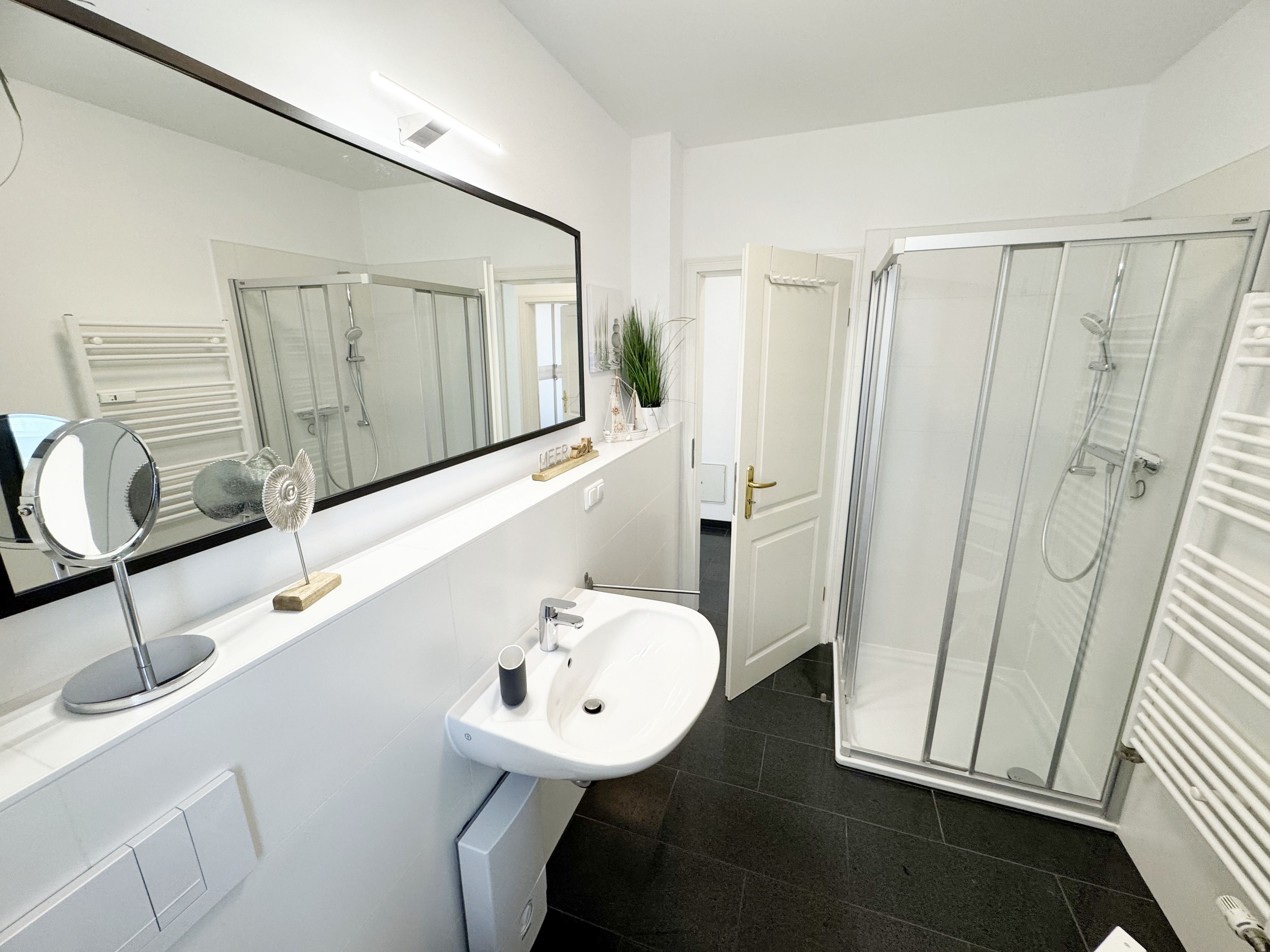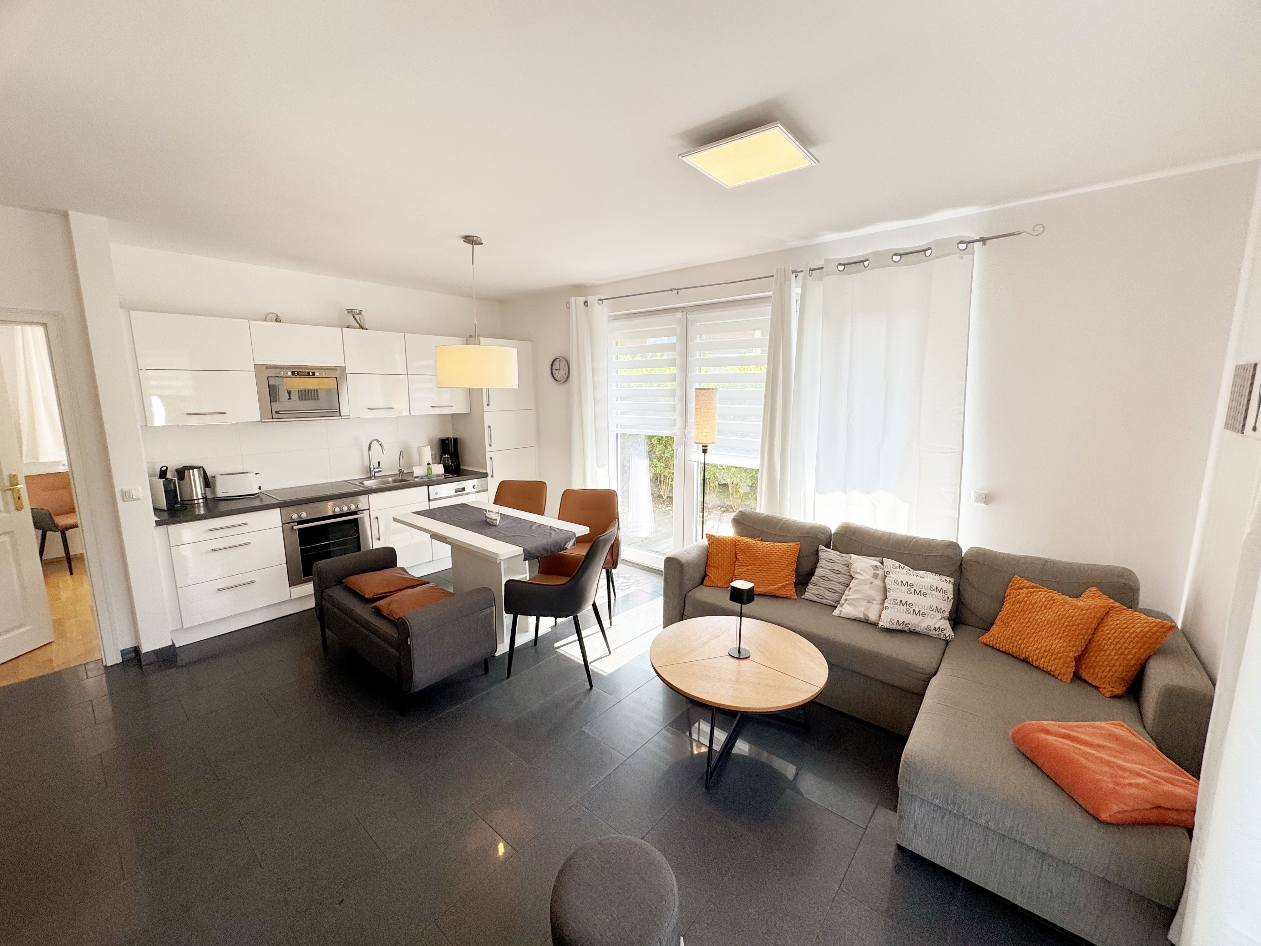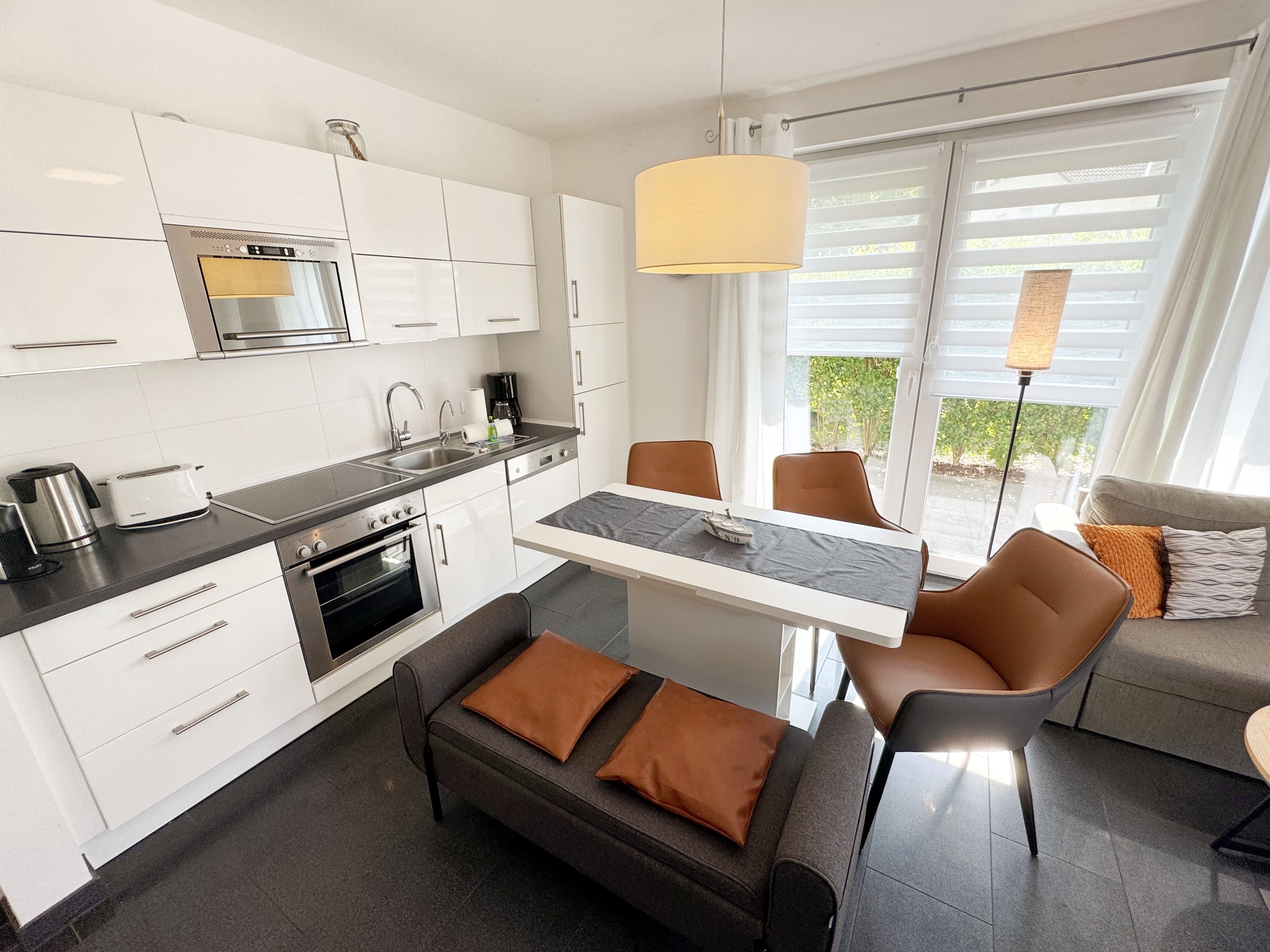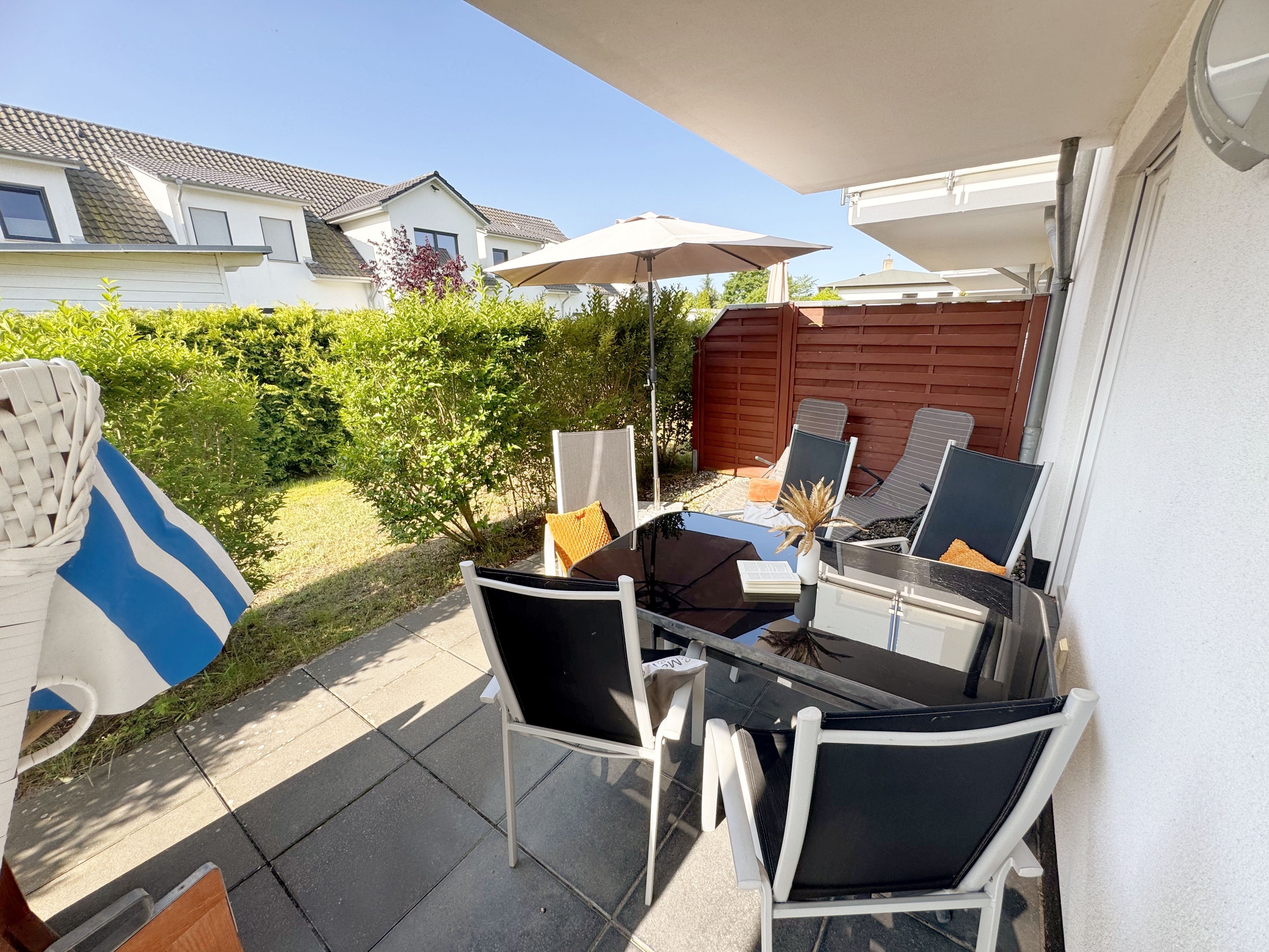 Die helle und großzügige 3-Zimmer-Komfort-Wohnung Nr. 04 im Haus Sanddorn ist modern eingerichtet und besticht durch ihre geschickte Raumaufteilung. Die Nichtraucher-Ferienwohnung mit ca. 67 m² befindet sich im Erdgeschoss des Hauses und bietet Ihnen 2 großen Terrassen. Der Wohnbereich verfügt über eine Eck-Couch (Aufbettungsmöglichkeit 5.Person /1,30m x 2,00m), einen Couchtisch, einen Lesesessel mit Hocker sowie ein TV-Board mit Smart-TV, Blu-Ray-Player und DAB-Radio mit USB, Bluetooth und CD-Player. Ein WLAN-Zugang rundet den technischen Bereich ab. An Gesellschaftsspiele und Urlaubslektüre wurde auch gedacht. An kühleren Tagen sorgt der Kamin für wohlige Wärme und die entsprechende Gemütlichkeit. Kaminholz können Sie gerne dazu buchen. Die angrenzende Küchenzeile fügt sich harmonisch an den Wohnbereich an. Um jede Mahlzeit zu genießen, steht Ihnen ein Kühlschrank mit Gefrierfach, ein Backofen, ein Cerankochfeld, eine Spülmaschine, eine Mikrowelle, eine Kaffeemaschine, eine Nespresso Maschine, ein Toaster, ein Wasserkocher sowie diverse Küchenutensilien zur Verfügung. Ein bequemer Essplatz rundet den Bereich ab. Vom Wohn-/Essbereich kommen Sie auf Ihre bestuhlte und überdachte Terrasse (Osten/Süden). Ein Sonnenschirm, sowie 2 Sonnenliegen, ein Strandkorb und ein Grill sorgen für die richtige Entspannung. Das 1. Schlafzimmer verfügt über ein Boxspringbett (1,80m x 2,00m), Nachttischablagen mit Beleuchtung, einen Kleiderschrank sowie ein Flachbild-TV mit integrierten DVD-Player. Hier haben Sie zusätzlich die Möglichkeit auf eine der zwei Terrassen zu gelangen. Das 2. Schlafzimmer verfügt über ein Boxspringbett (1,60m x 2,00m), Nachttischablagen mit Beleuchtung, einen Kleiderschrank, Insektenschutzgitter sowie ein Flachbild-TV. Auch hier haben Sie zusätzlich die Möglichkeit auf eine der zwei Terrassen zu gelangen. Für einen ruhigen und erholsamen Schlaf sorgen in beiden Schlafzimmern Aussenrollo´s welche Sie in der gesamten Wohnung vorfinden. Das Tageslichtbad ist mit einer ebenerdigen Dusche, einem WC, einer Waschmaschine mit integriertem Trockner, einem Waschplatz, einem Kosmetikspiegel, einem Fön, einem Ablagestuhl sowie Ablageflächen ausgestattet. In der gesamten Wohnung sorgt eine Fußbodenheizung für angenehme Wärme. Für unsere kleinen Gäste steht Ihnen 1x Kinderhochstuhl inklusive zur Verfügung. Ein Kinderreisebett kann dazu gebucht werden bzw. von zu Hause mitgebracht werden. Ihre mitgebrachten oder geliehenen Fahrräder können Sie in dem zu Ihrer Wohnung gehörenden Schuppen (Nr.04) verschließen.1 Haustier ist mit eigenem Schlafplatz gegen eine Gebühr ein gern gesehener Gast. Es besteht eine Leinenpflicht auf dem Grundstück. Ein PKW-Stellplatz Nr. 04 befindet sich direkt am Objekt. Die Erstausstattung eines Wäschepaketes (komplette Bettwäsche, 1 Duschhandtuch, 2 kleine Handtücher) können Sie bis 14 Tage vor Anreise gegen einen Aufpreis dazu buchen oder durch eigenes Ergänzen. Ab 2 gebuchten Paketen erhalten Sie einmalig 1 Geschirrhandtuch und 1 Duschvorleger hinzu.