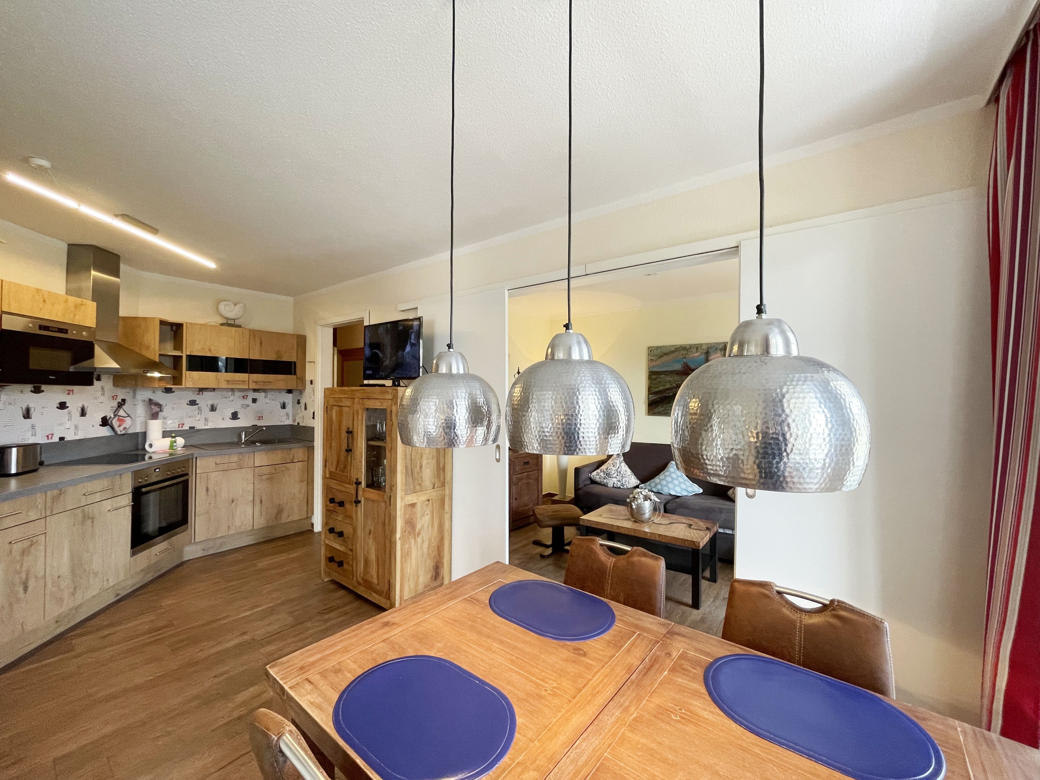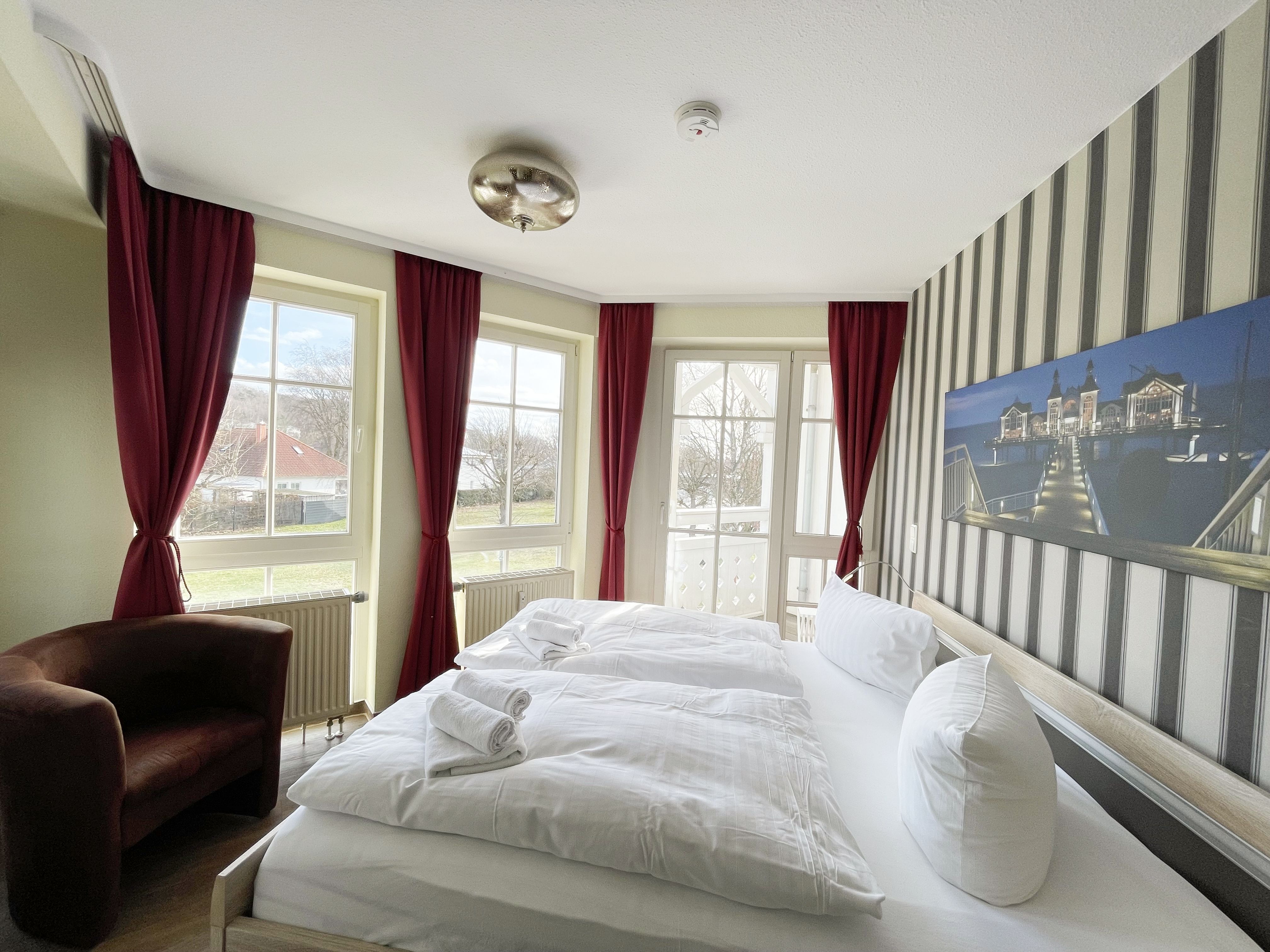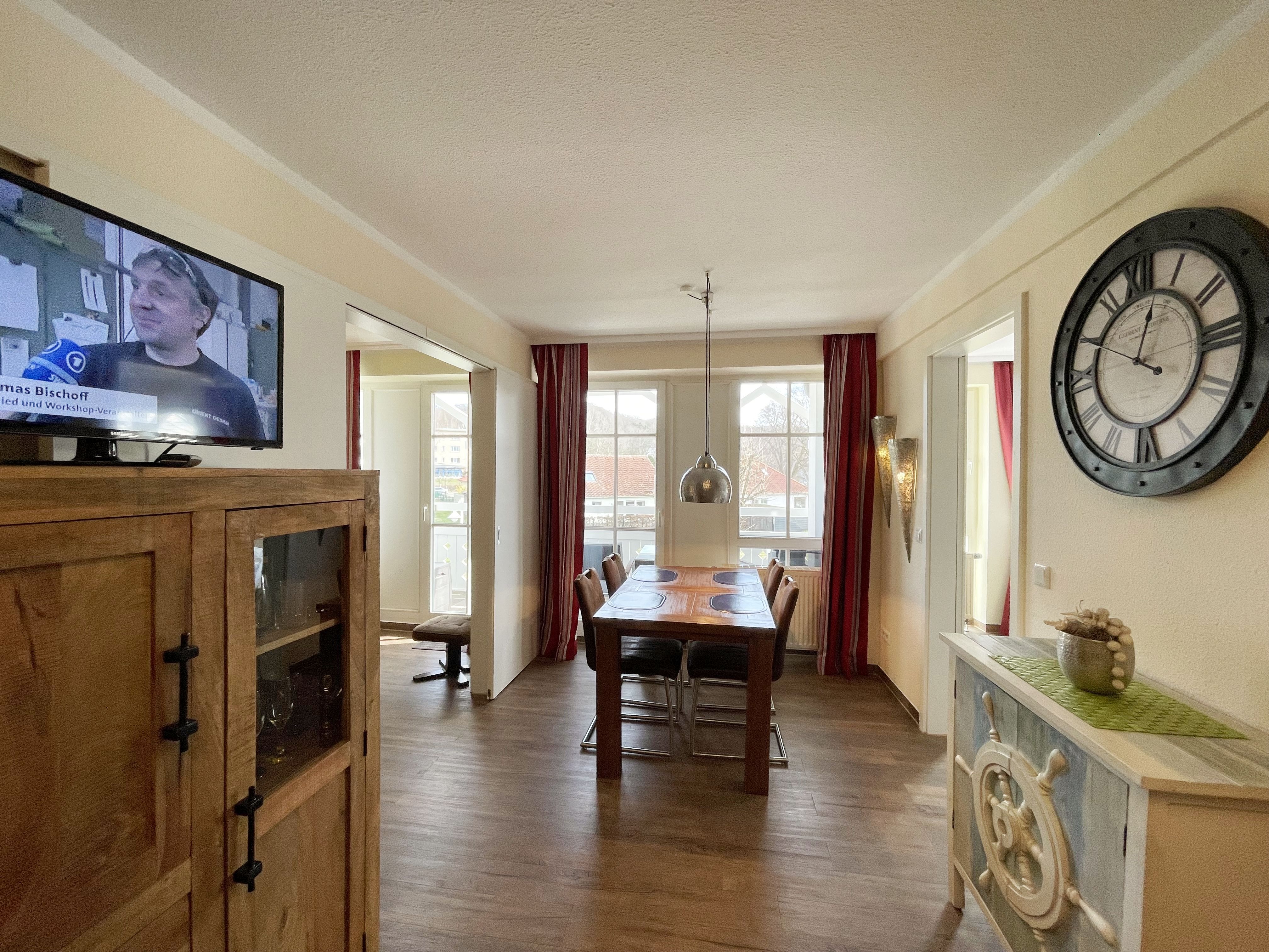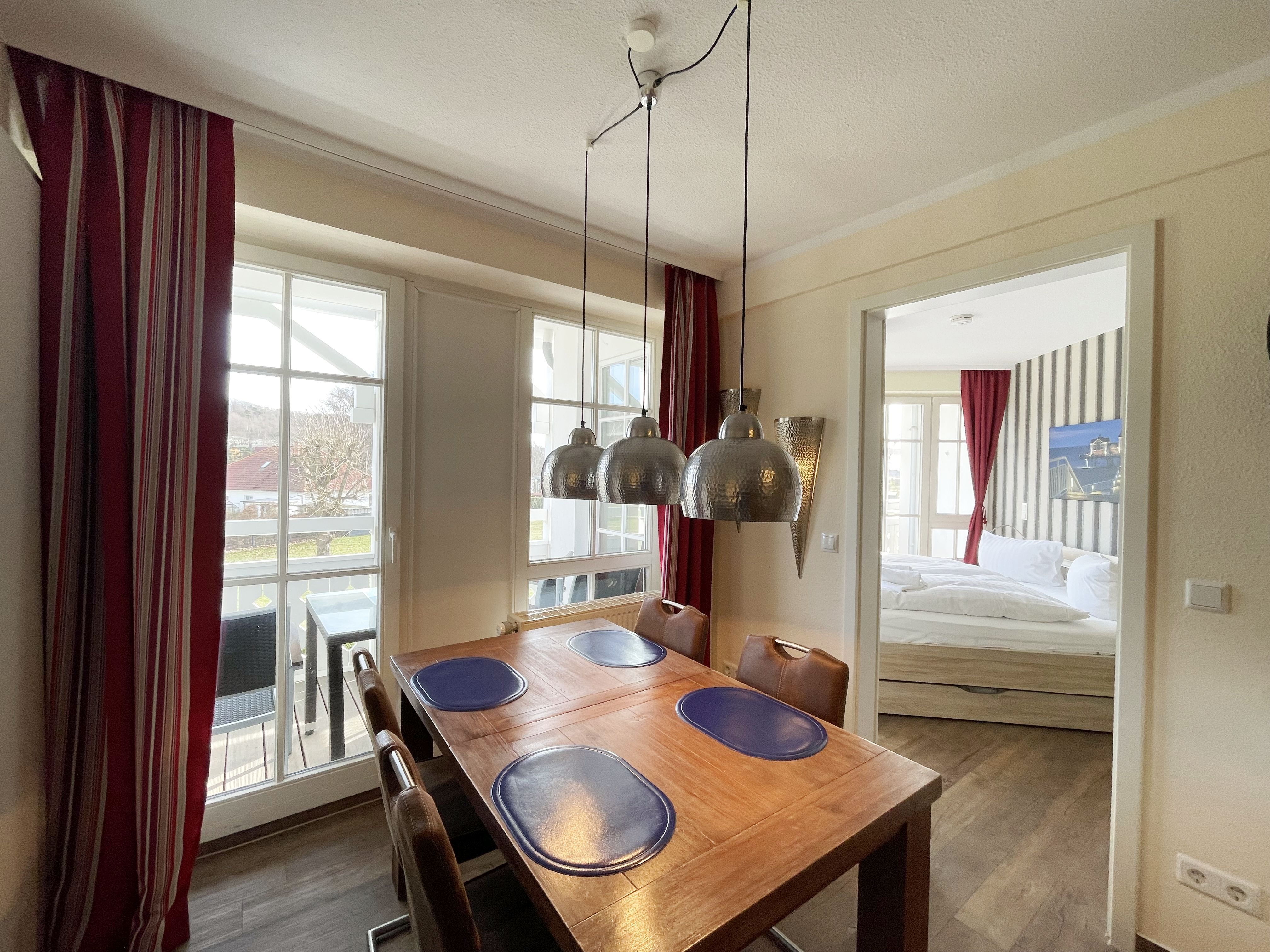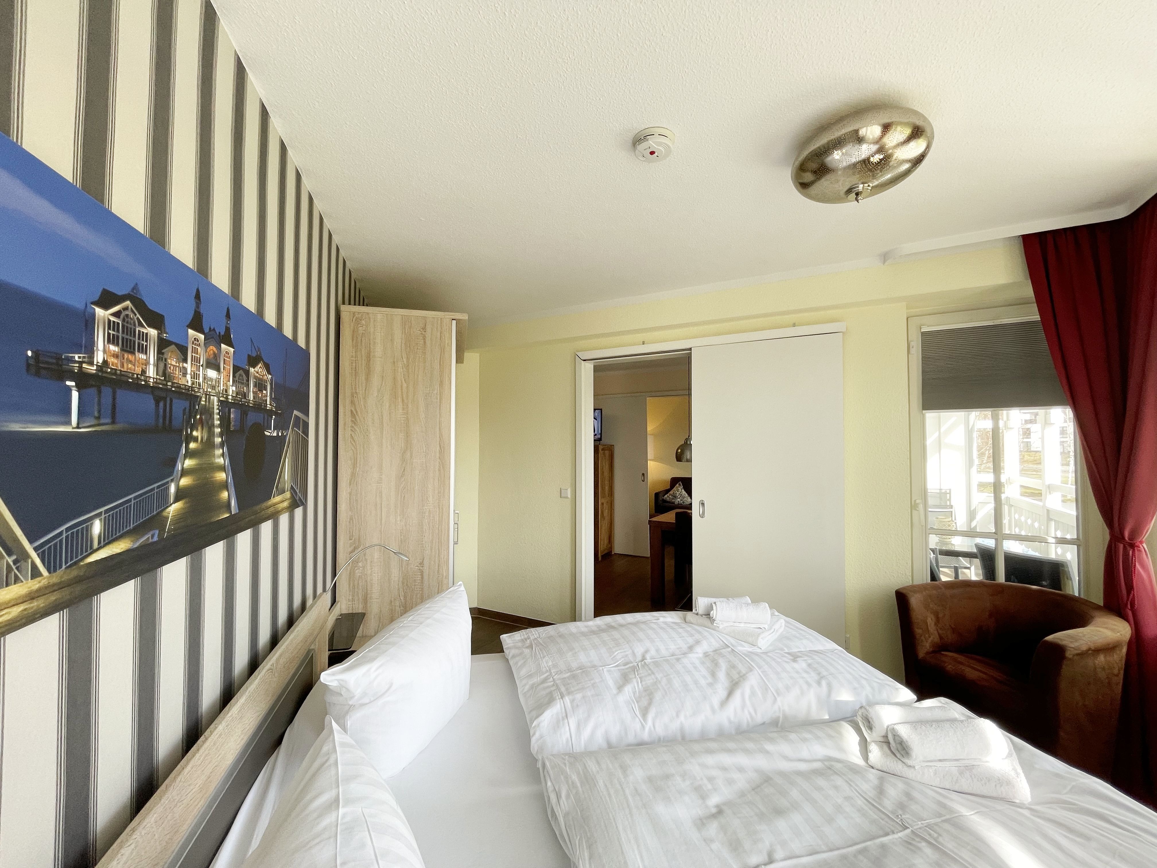 Die gemütlich eingerichtete Nichtraucherwohnung befindet sich in der 1. Etage des Hauses Südperd im Seepark Sellin. Durch die ca. 52 qm große Wohnfläche bietet Sie ausreichend Platz für max. 2 Personen. Der Wohn-/ Essbereich ist mit Schiebetüren voneinander abtrennbar. Der Essbereich verfügt über eine Einbauküche mit Induktionsceranfeld, Spüle, großen Kühl-und Gefrierschrank, Spülmaschine, Mikrowelle, Backofen, Kaffeemaschine, Toaster, Wasserkocher sowie diversen Küchenutensilien. Angrenzend haben Sie einen hellen und gemütlichen Essbereich, der nicht nur für die Mahlzeiten zum Verweilen einlädt. Zusätzlich haben Sie eine Leselampe, ein Highboard mit Smart-TV und Mini-Stereo-Anlage. Ein 2. TV-Flachbild (40) steht im Wohnbereich zur Verfügung, ebenso ein Blu-Ray-Player. Im Wohnbereich passt sich eine Couch, 1 Sessel, ein Couchtisch sowie eine Anrichte dem Raum an. Das geräumige Schlafzimmer bietet Ihnen ein Doppelbett (2 x 0,90 m x 2,00 m), verstellbare Lattenroste, Nachtischkonsolen und Kleiderschrank. Vom Schlaf-/Ess- & Wohnbereich können Sie den bestuhlten Balkon (Südosten) erreichen. Das Badezimmer ist in 2 Räume aufgeteilt, wo sich in einem der Räume eine ebenerdige Glasdusche sowie ein Waschtisch mit Fön sowie eine Waschmaschine befindet und in einem weiteren Raum das WC mit kleinem Waschbecken. Beide Badezimmer sind gefliest. Alle anderen Räumlichkeiten sind mit einem Vinylboden verlegt worden. Ein eigener PKW-Stellplatz (43) steht Ihnen in der Tiefgarage (Höhe 2,00m) zur Verfügung sowie auch eine Fahrradabstellmöglichkeit. Auch im Urlaub brauchen Sie in Ihrer Wohnung nicht auf einen Internetanschluss (WLAN) zu verzichten. Dieser ist für Sie inklusive!!! Für unsere kleinen Gäste ist 1x Kinderreisebett mit zusätzlicher Matratze (ohne Bettinlett) inklusive. 2 kleine Hunde oder 1 Kniehoher Hund (keine Katzen) sind gegen eine Gebühr gern gesehene Gäste in der Wohnung. Die Erstausstattung eines Wäschepaketes (komplette Bettwäsche, 1 Duschhandtuch, 2 kleine Handtücher) können Sie bis 14 Tage vor Anreise gegen einen Aufpreis dazu buchen oder durch eigene ergänzen. Ab 2 gebuchten Paketen erhalten Sie einmalig 1 Geschirrhandtuch und 1 Duschvorleger hinzu.