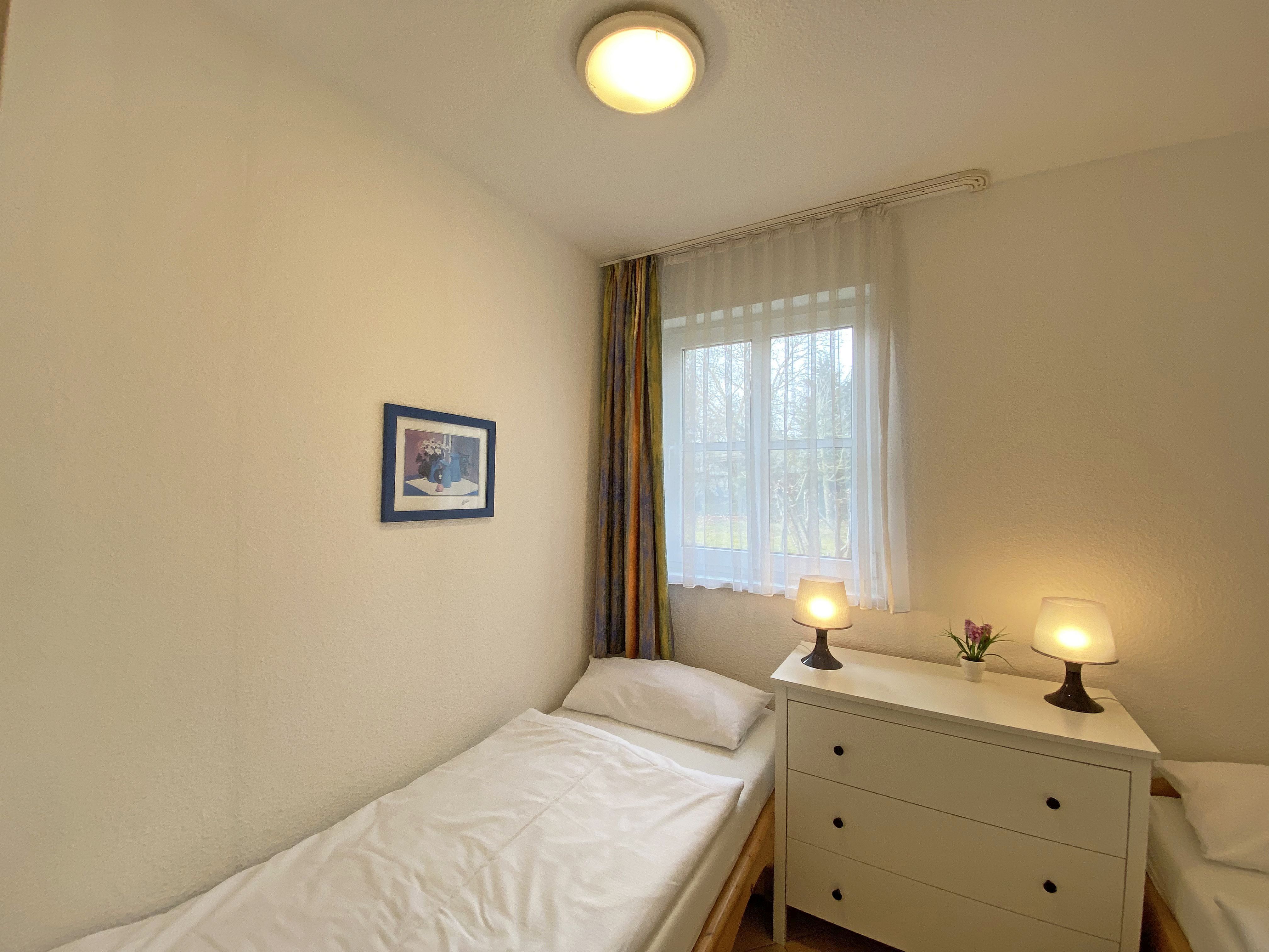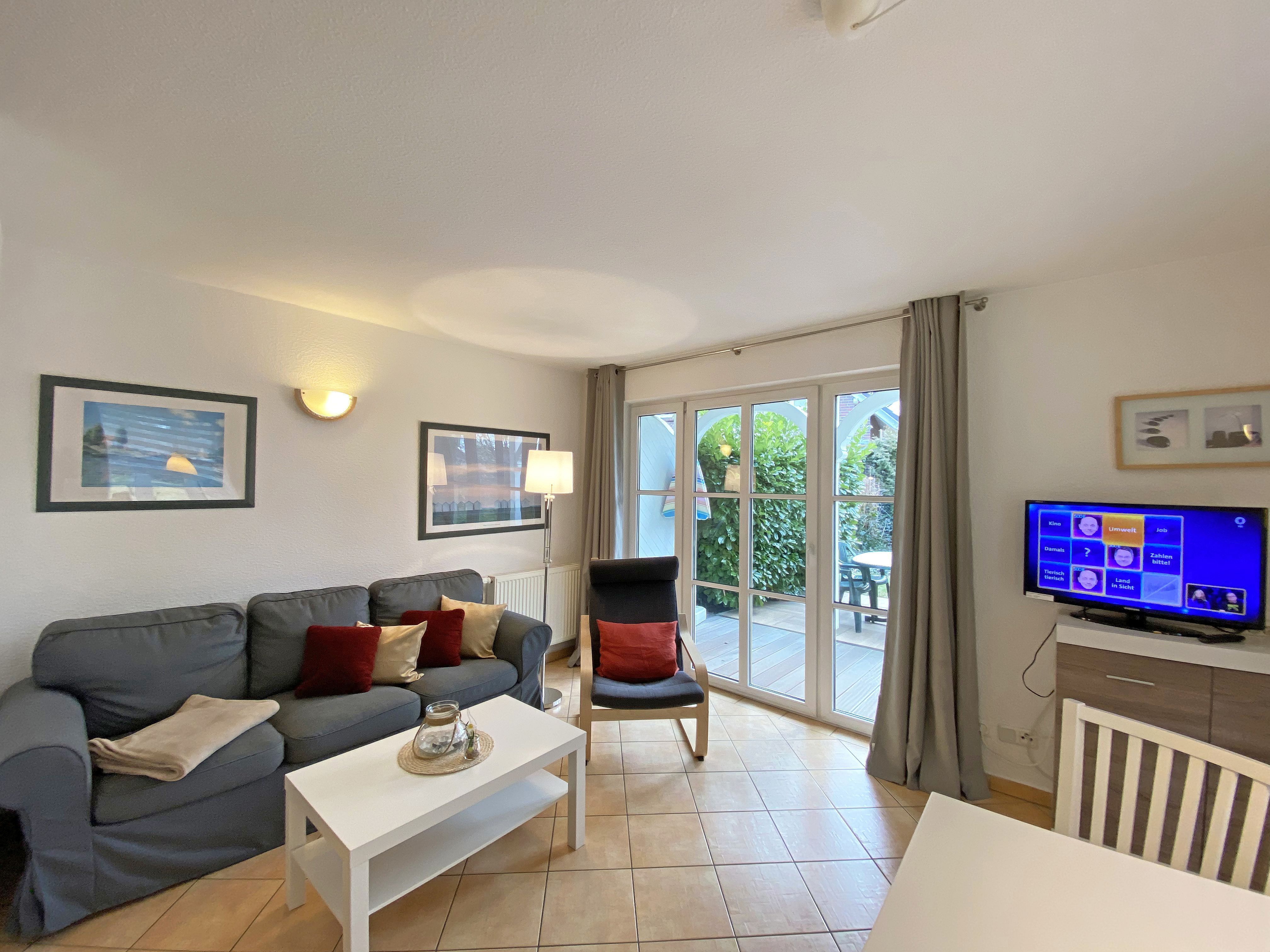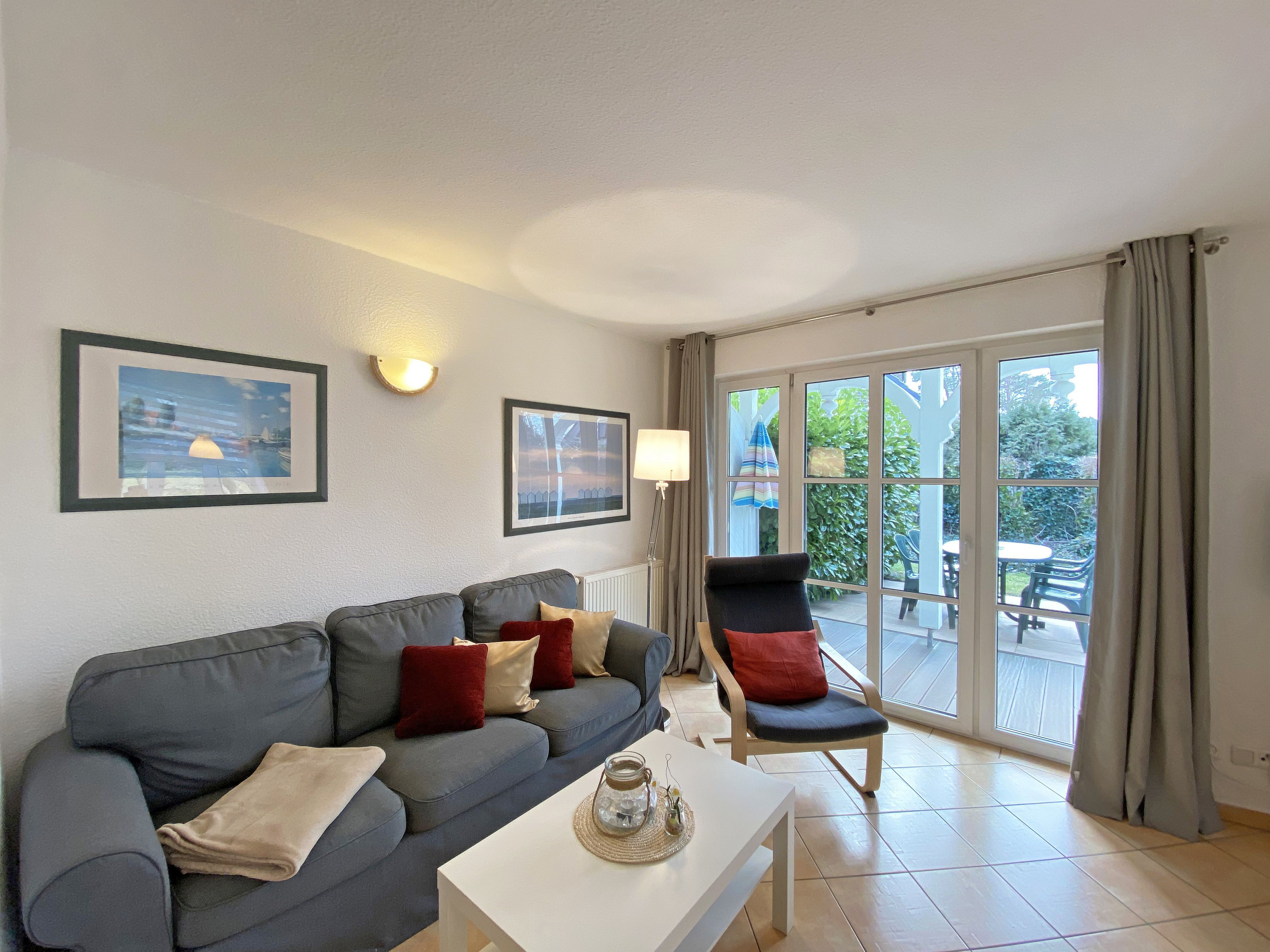 Die gemütliche und komfortable 3-Raum-Nichtraucherwohnung mit ca. 55qm Wohnfläche befindet sich im Erdgeschoss und bietet ausreichend Platz für 2 Erw. + 2 Kinder bis 17 Jahre. Die im Rügener Stil behaglich eingerichtete Ferienwohnung bietet einen großzügigen Wohn- Essbereich mit Zugang auf die teilweise überdachte Terrasse. Die kleine aber komplett eingerichtete Küchenzeile mit Geschirrspüler, Backofen, 4 Herdplatten, Kaffeemaschine, Toaster, Wasserkocher sowie diverse Küchenutensilien lassen keine Wünsche offen und grenzen an den Wohnbereich. Im Wohn- Essbereich erwartet Sie ein Esstisch mit 4 Stühlen, eine gemütliche Couch mit einem Sideboard sowie einen LCD Sat-TV in HD-Qualität für eine hohe Programmvielfalt, CD und DVD-Player sowie ein Radio mit USB-Anschluss und SD-Kartenleser. Vom Wohnbereich aus gelangen Sie auf die teilweise überdachte, im Bäderstil gehaltene und bestuhlte Terrasse (Richtung Süden) mit 2 zusätzlichen Sonnenliegen. Das 1. Schlafzimmer verfügt über 1 Doppelbett (2x90x200cm) mit Nachtischkonsolen und einen viertürigen Kleiderschrank. Das Aufstellen eines Kinderreisebettes wäre hier möglich. Das 2. und damit kleinere Schlafzimmer ist mit 2 Einzelbetten (je 80x200cm), und Nachttischablagen ausgestattet. Beide Schlafzimmer sind abdunkelbar. Das geflieste Tageslicht-Bad bietet Ihnen eine Dusche, WC, Fön und einen Waschtisch. Auch im Urlaub brauchen Sie in der Wohnung nicht auf einen Internetanschluss (WLAN) verzichten. Dieser ist für Sie inklusive!!! In einem Gemeinschaftsraum können Sie eine Waschmaschine gegen eine Extragebühr nutzen (in den Monaten: November bis Ende März nicht im Betrieb). Ein Parkplatz Nr. 01 befindet sich vor dem Haus Rügenwelle und ist für Sie inklusive. Ihre mitgebrachten oder geliehenen Fahrräder können Sie auf dem Grundstück anschließen. Auf Wunsch kann auch 1x Kinderreisebett (mit Matratze, ohne Bett Inlett) / 1x Hochstuhl gestellt werden. 2 kleine Haustiere können gegen eine Gebühr dazu gebucht werden. Die Erstausstattung eines Wäschepaketes (komplette Bettwäsche, 1 Duschhandtuch, 2 kleine Handtücher) können Sie bis 14 Tage vor Anreise gegen einen Aufpreis dazu buchen oder durch eigene ergänzen. Ab 2 gebuchten Paketen erhalten Sie einmalig 1 Geschirrhandtuch und 1 Duschvorleger hinzu.