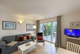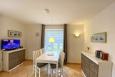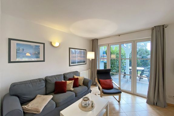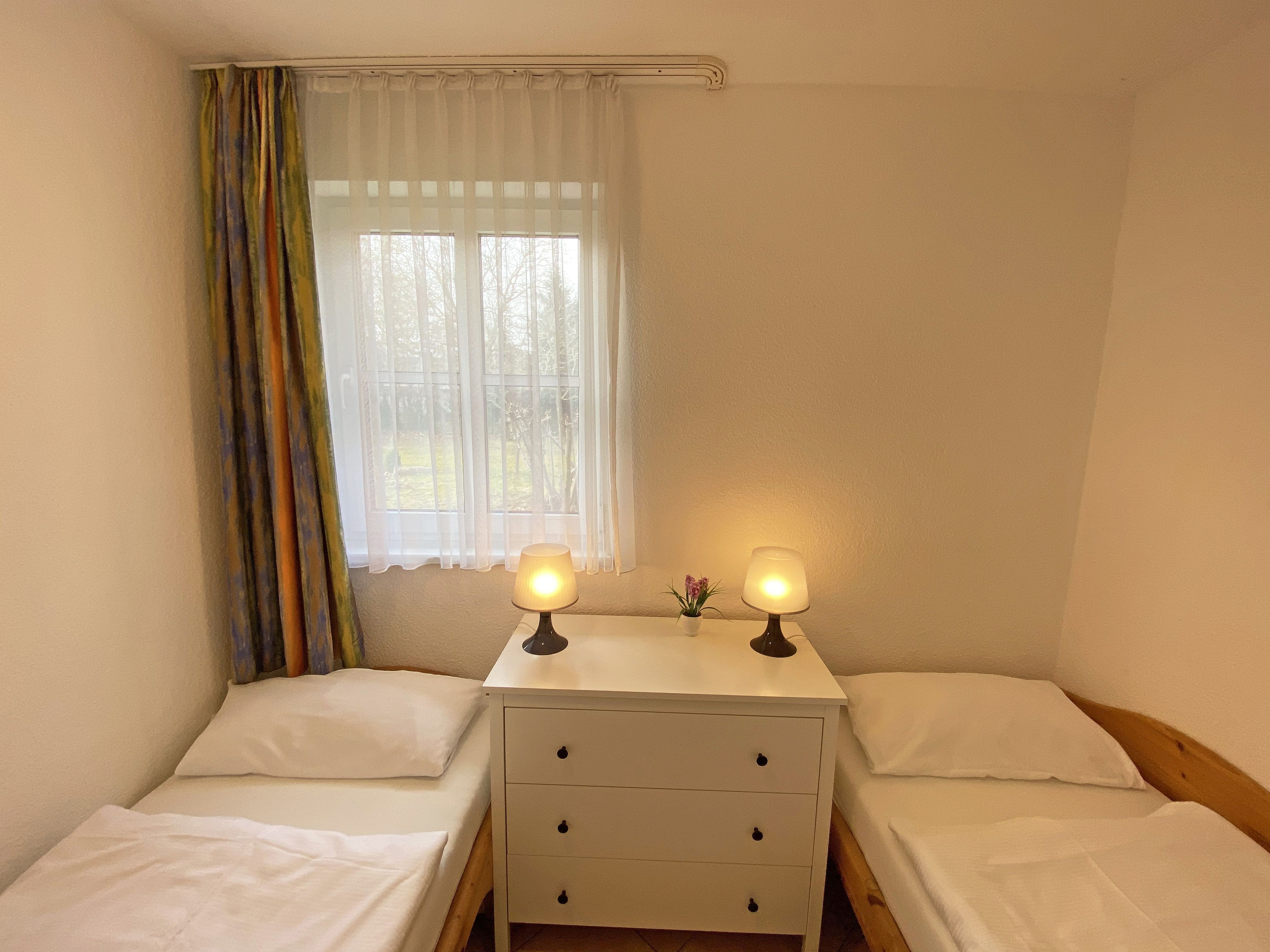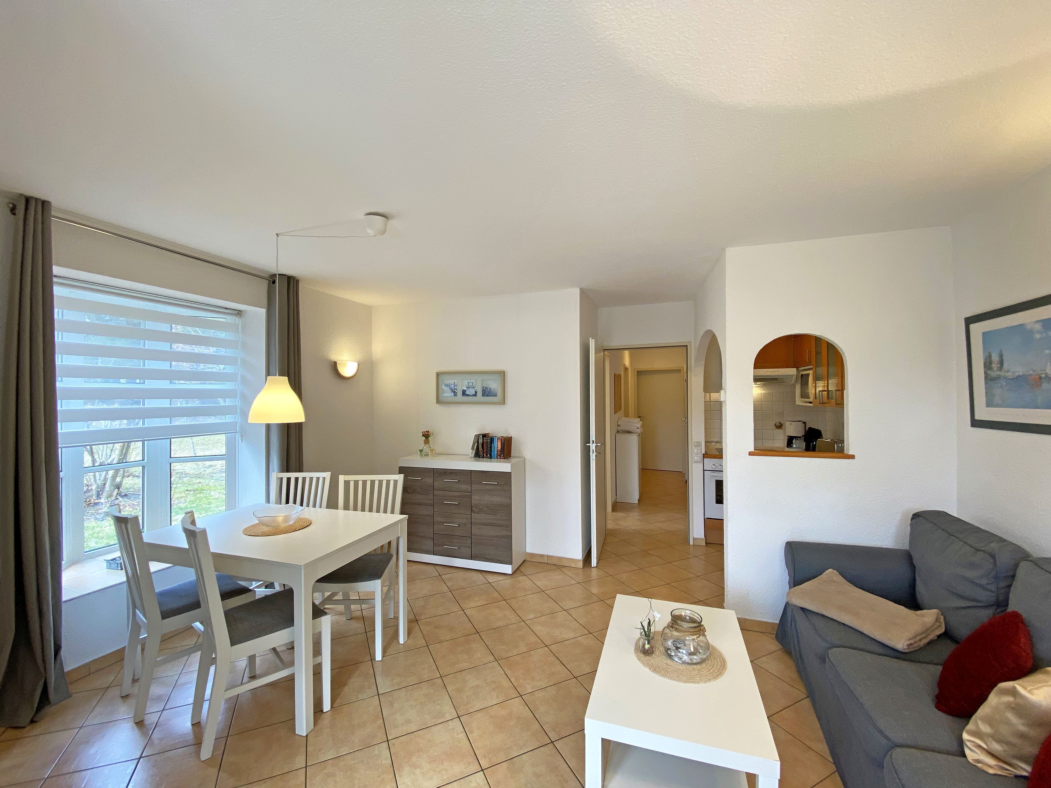 Die gemütliche und komfortable 3-Raum-Nichtraucherwohnung mit ca. 55qm Wohnfläche befindet sich im Erdgeschoss und bietet ausreichend Platz für 2 Erw. + 2 Kinder bis 17 Jahre. Die im Rügener Stil behaglich eingerichtete Ferienwohnung bietet einen großzügigen Wohn- Essbereich mit Zugang auf die teilweise überdachte Terrasse. Die kleine aber komplett eingerichtete Küchenzeile mit Geschirrspüler, Backofen, 4 Herdplatten, Kaffeemaschine, Toaster, Wasserkocher sowie diverse Küchenutensilien lassen keine Wünsche offen und grenzen an den Wohnbereich. Im Wohn- Essbereich erwartet Sie ein Esstisch mit 4 Stühlen, eine gemütliche Couch mit einem Sideboard sowie einen LCD Sat-TV in HD-Qualität für eine hohe Programmvielfalt, CD und DVD-Player sowie ein Radio mit USB-Anschluss und SD-Kartenleser. Vom Wohnbereich aus gelangen Sie auf die teilweise überdachte, im Bäderstil gehaltene und bestuhlte Terrasse (Richtung Süden) mit 2 zusätzlichen Sonnenliegen. Das 1. Schlafzimmer verfügt über 1 Doppelbett (2x90x200cm) mit Nachtischkonsolen und einen viertürigen Kleiderschrank. Das Aufstellen eines Kinderreisebettes wäre hier möglich. Das 2. und damit kleinere Schlafzimmer ist mit 2 Einzelbetten (je 80x200cm), und Nachttischablagen ausgestattet. Beide Schlafzimmer sind abdunkelbar. Das geflieste Tageslicht-Bad bietet Ihnen eine Dusche, WC, Fön und einen Waschtisch. Auch im Urlaub brauchen Sie in der Wohnung nicht auf einen Internetanschluss (WLAN) verzichten. Dieser ist für Sie inklusive!!! In einem Gemeinschaftsraum können Sie eine Waschmaschine gegen eine Extragebühr nutzen (in den Monaten: November bis Ende März nicht im Betrieb). Ein Parkplatz Nr. 01 befindet sich vor dem Haus Rügenwelle und ist für Sie inklusive. Ihre mitgebrachten oder geliehenen Fahrräder können Sie auf dem Grundstück anschließen. Auf Wunsch kann auch 1x Kinderreisebett (mit Matratze, ohne Bett Inlett) / 1x Hochstuhl gestellt werden. 2 kleine Haustiere können gegen eine Gebühr dazu gebucht werden. Die Erstausstattung eines Wäschepaketes (komplette Bettwäsche, 1 Duschhandtuch, 2 kleine Handtücher) können Sie bis 14 Tage vor Anreise gegen einen Aufpreis dazu buchen oder durch eigene ergänzen. Ab 2 gebuchten Paketen erhalten Sie einmalig 1 Geschirrhandtuch und 1 Duschvorleger hinzu.