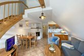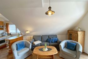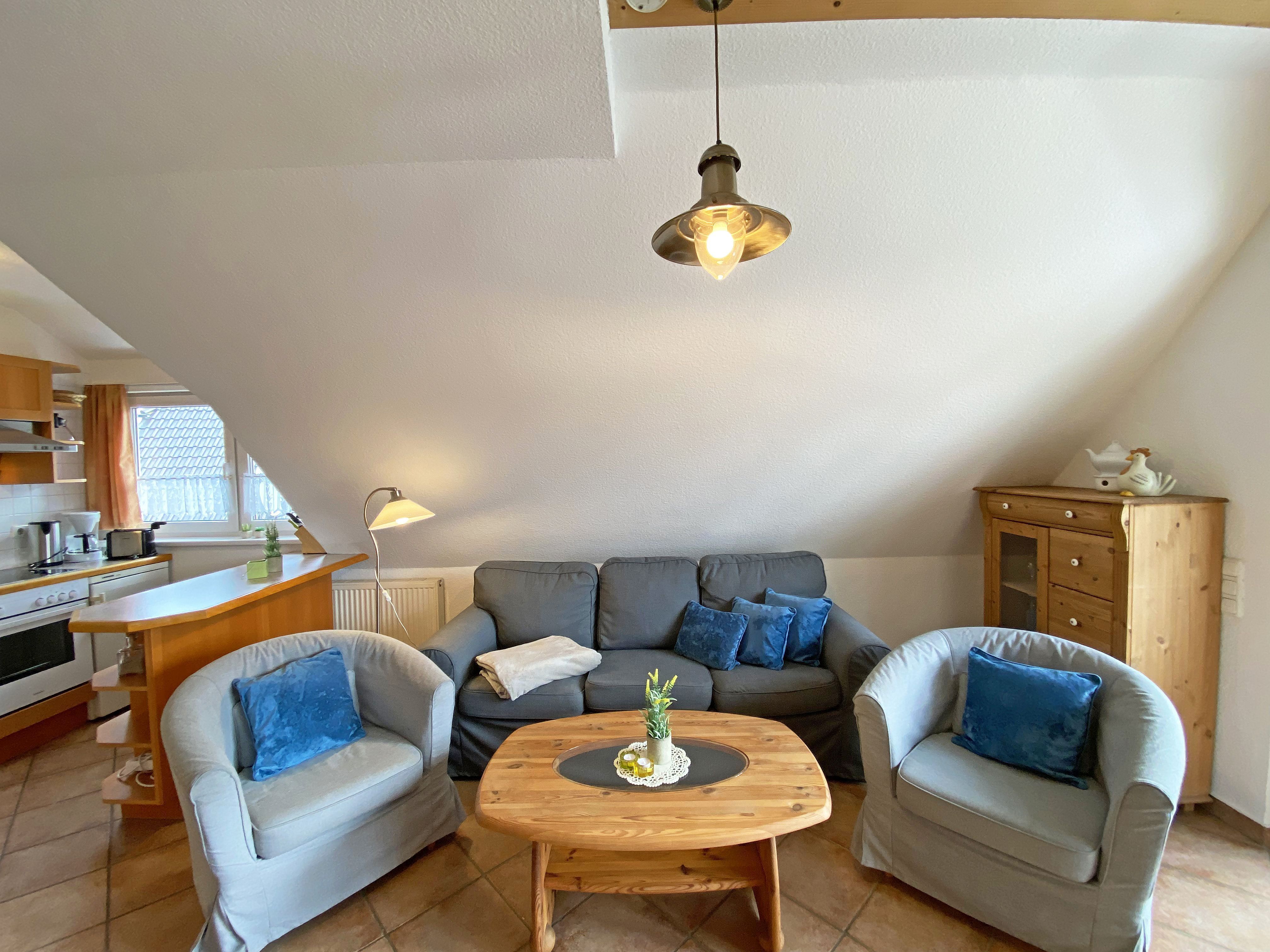 Die gemütliche und komfortable 3-Raum-Nichtraucherwohnung ist eine Maisonette mit ca. 65qm Wohnfläche und befindet sich in der 1. Etage. Sie bietet ausreichend Platz für 5 Erw. + 1 Kleinkind bis 3 Jahre im Kinderreisebett. Die im Rügener Stil behaglich eingerichtete Ferienwohnung bietet einen großzügigen Wohn- Essbereich die über eine komplett eingerichtete Küchenzeile mit Geschirrspüler, Backofen, 4 Herdplatten, Kaffeemaschine, Toaster, Wasserkocher sowie diverse Küchenutensilien verfügt. Angrenzend zum Wohnbereich haben Sie einen Esstisch mit Bestuhlung sowie eine Couch mit Couchtisch, einem Sideboard mit LCD Sat-TV in HD-Qualität für eine hohe Programmvielfalt, CD & DVD-Player mit Radio USB-Anschluss und SD-Kartenleser. Für gemütliche Abende sorgt der Kamin. Vom Wohnbereich gelangen Sie auf den überdachten im Bäderstil gehaltenen und bestuhlten Balkon (Richtung Süden). Das 1. Schlafzimmer befindet sich auf einer Ebene wie der Wohnbereich und verfügt über 1 Doppelbett (2x90x200 cm) mit Nachtischkonsolen und einen viertürigen Kleiderschrank. Durch die Großzügigkeit des Raumes, könnte man auch ein Kinderreisebett mit aufstellen. Das 2. Schlafzimmer im Dachgeschoss erreichen Sie durch eine Treppe im Wohnbereich, wo Sie 2 Einzelbetten (je 0,80m x 2,00m) welche Sie zusammenzustellen können, 1 Einzelbett (0,80m x 2,00m), ein Wandschrank sowie ein Schreibtisch. Beide Schlafzimmer sind abdunkelbar. Das geflieste Tageslicht-Bad bietet Ihnen eine Dusche, WC, Fön, einen Waschtisch sowie eine Badewanne. Auch im Urlaub brauchen Sie in der Wohnung nicht auf einen Internetanschluss (WLAN) verzichten. Dieser ist für Sie inklusive!!! In einem Gemeinschaftsraum können Sie eine Waschmaschine gegen eine Extragebühr nutzen (in den Monaten: November bis Ende März nicht im Betrieb). Ein Parkplatz Nr. 04 befindet sich vor dem Haus Rügenwelle und ist für Sie inklusive. Ihre mitgebrachten oder geliehenen Fahrräder können Sie auf dem Grundstück anschließen. Auf Wunsch kann auch 1x Kinderreisebett (mit Matratze, ohne Bett Inlett) / 1x Hochstuhl gestellt werden. 2 kleine Haustiere können gegen eine Gebühr dazu gebucht werden. Die Erstausstattung eines Wäschepaketes (komplette Bettwäsche, 1 Duschhandtuch, 2 kleine Handtücher) können Sie bis 14 Tage vor Anreise gegen einen Aufpreis dazu buchen oder durch eigene ergänzen. Ab 2 gebuchten Paketen erhalten Sie einmalig 1 Geschirrhandtuch und 1 Duschvorleger hinzu.