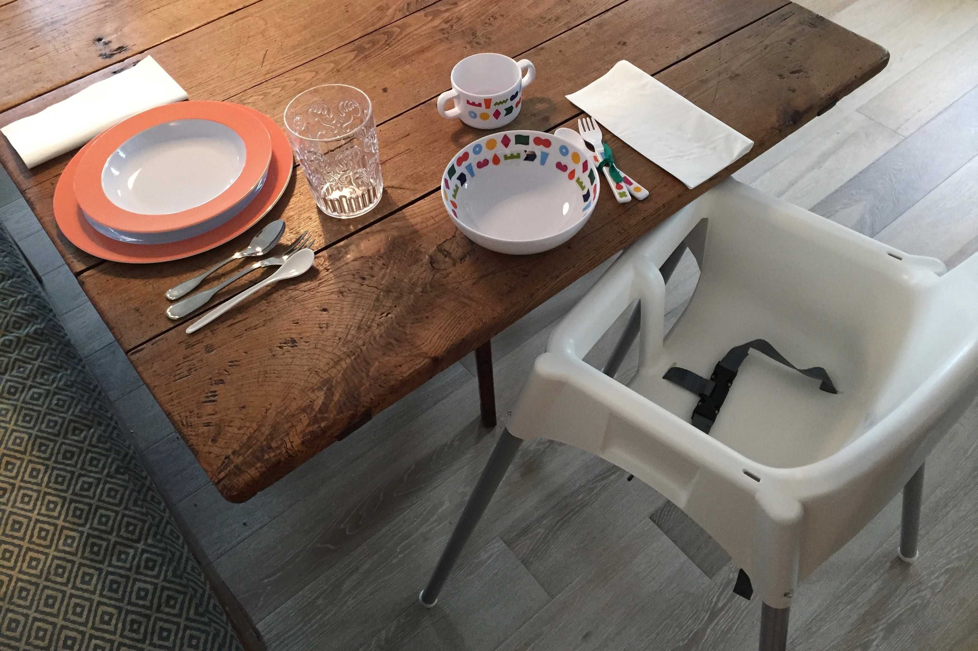 Es gibt einen Kinder-Hochstuhl, ebenso ein Set mit Kindergeschirr.