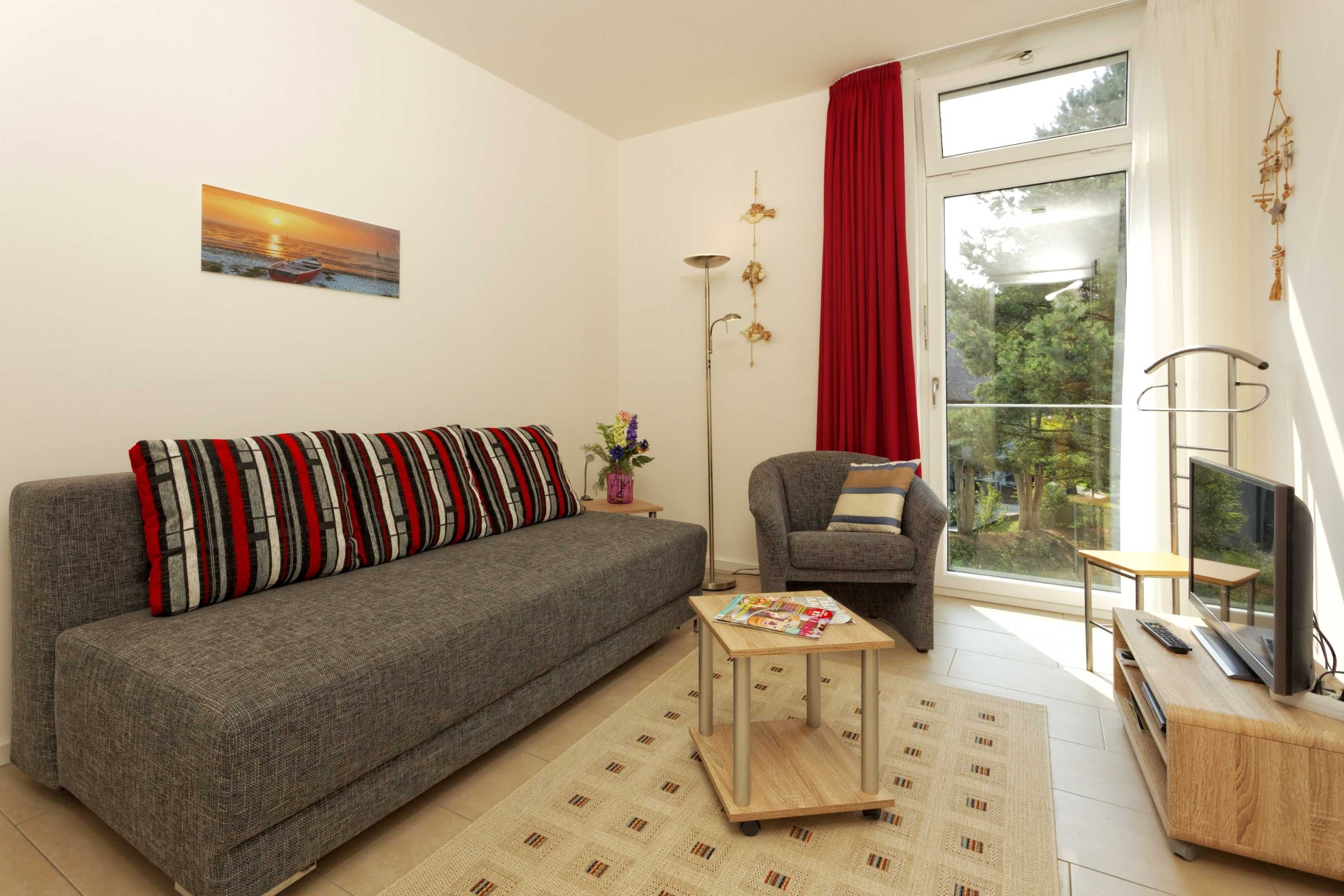 • 1 Schlafzimmer mit einem ausklappbaren Boxspring Schlafsofa (1,50 x 2,00 m), Flat-TV mit ca. 80cm Bilddiagonale