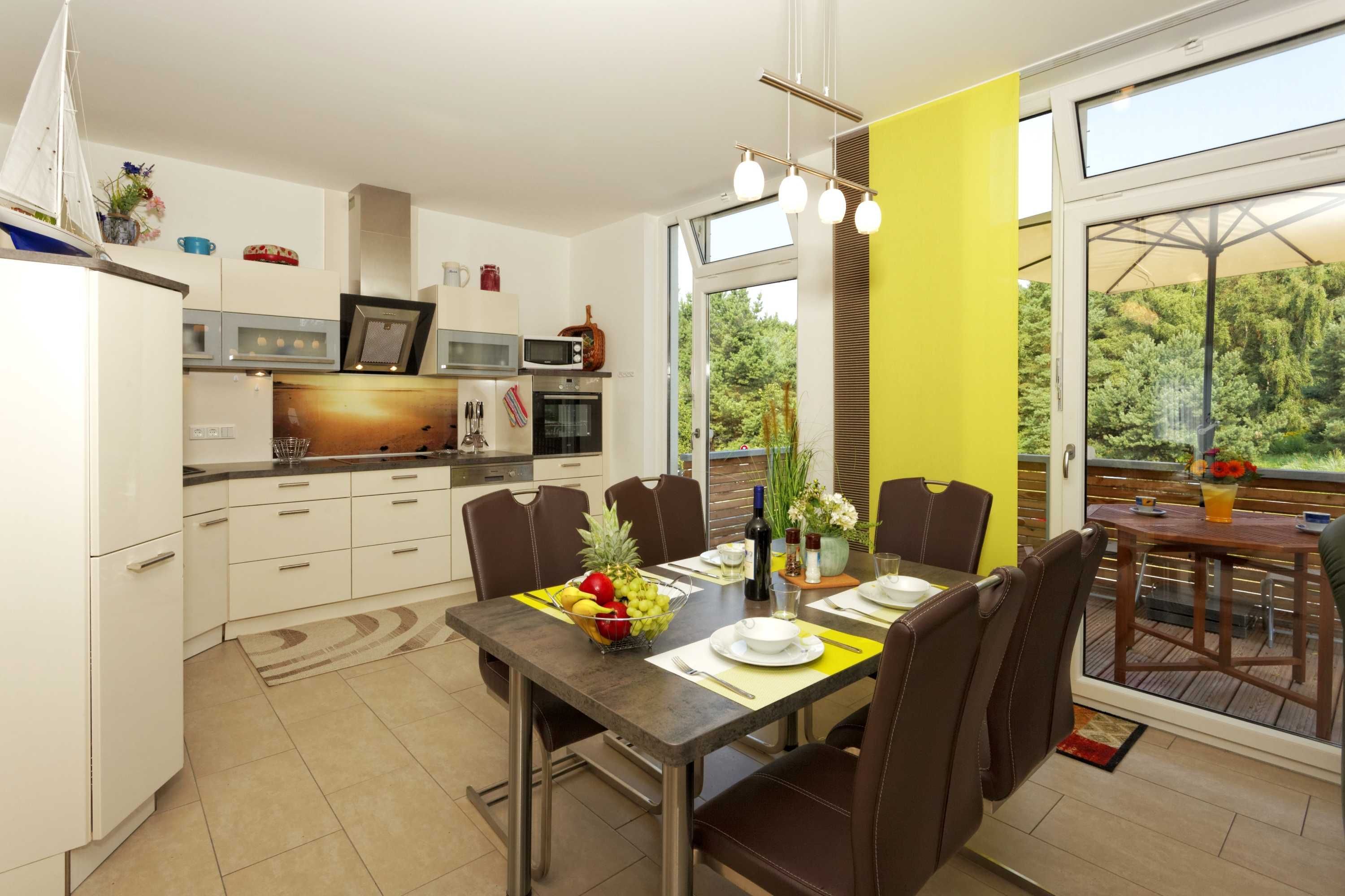 • Integrierte Küche mit Dunstabzugshaube, Elektroherd mit Ceranfeld, Backofen, Geschirrspüler, Mikrowelle, Kaffeemaschine, Cremesso-Kapselmaschine, Toaster, Wasserkocher, Kühlgefrier/Kombi