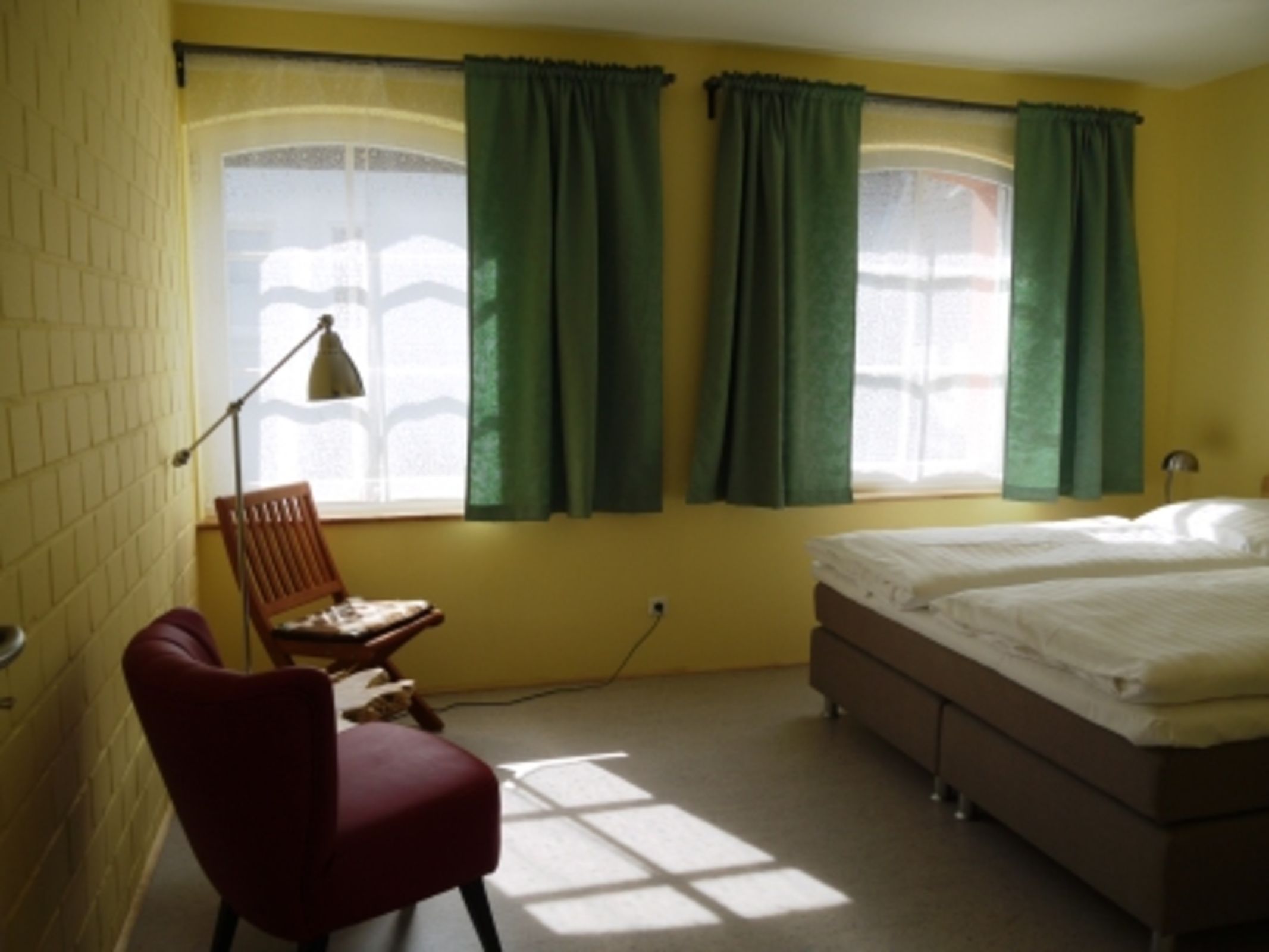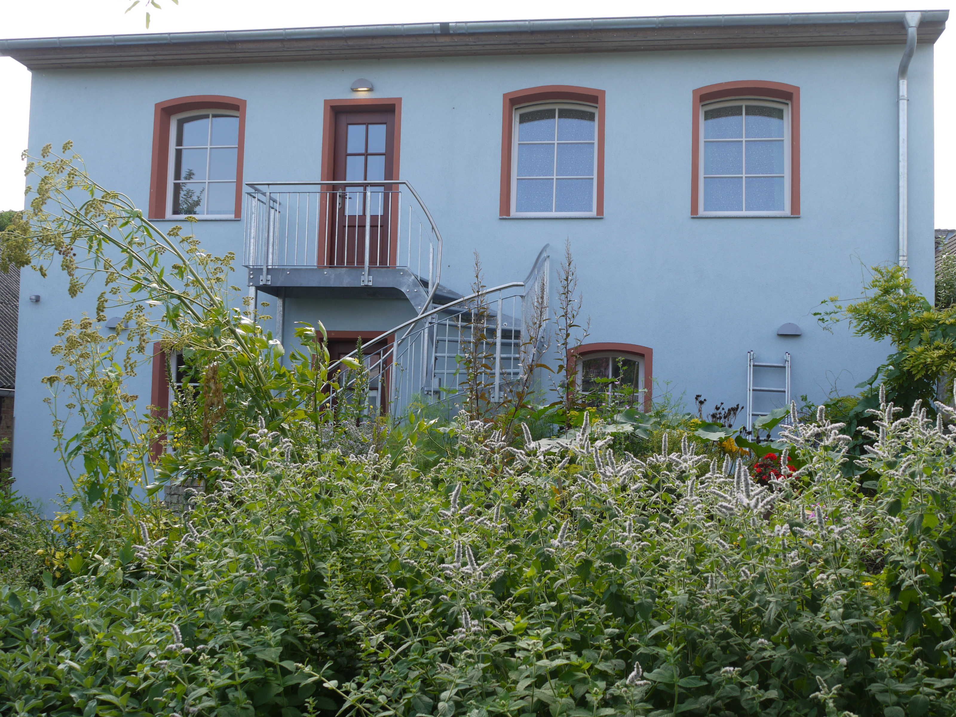 Das Hinterhaus war früher eine Werkstattgebäude. Nach umfangeichen Sanierungsmaßnahmen sind sind im Obergeschoß Gästezimmer entstanden. Sie kommen durch das Vorderhaus, den Hinterhof in den Garten und über eine Außentreppe ins Obergeschoß des Hinterhauses.