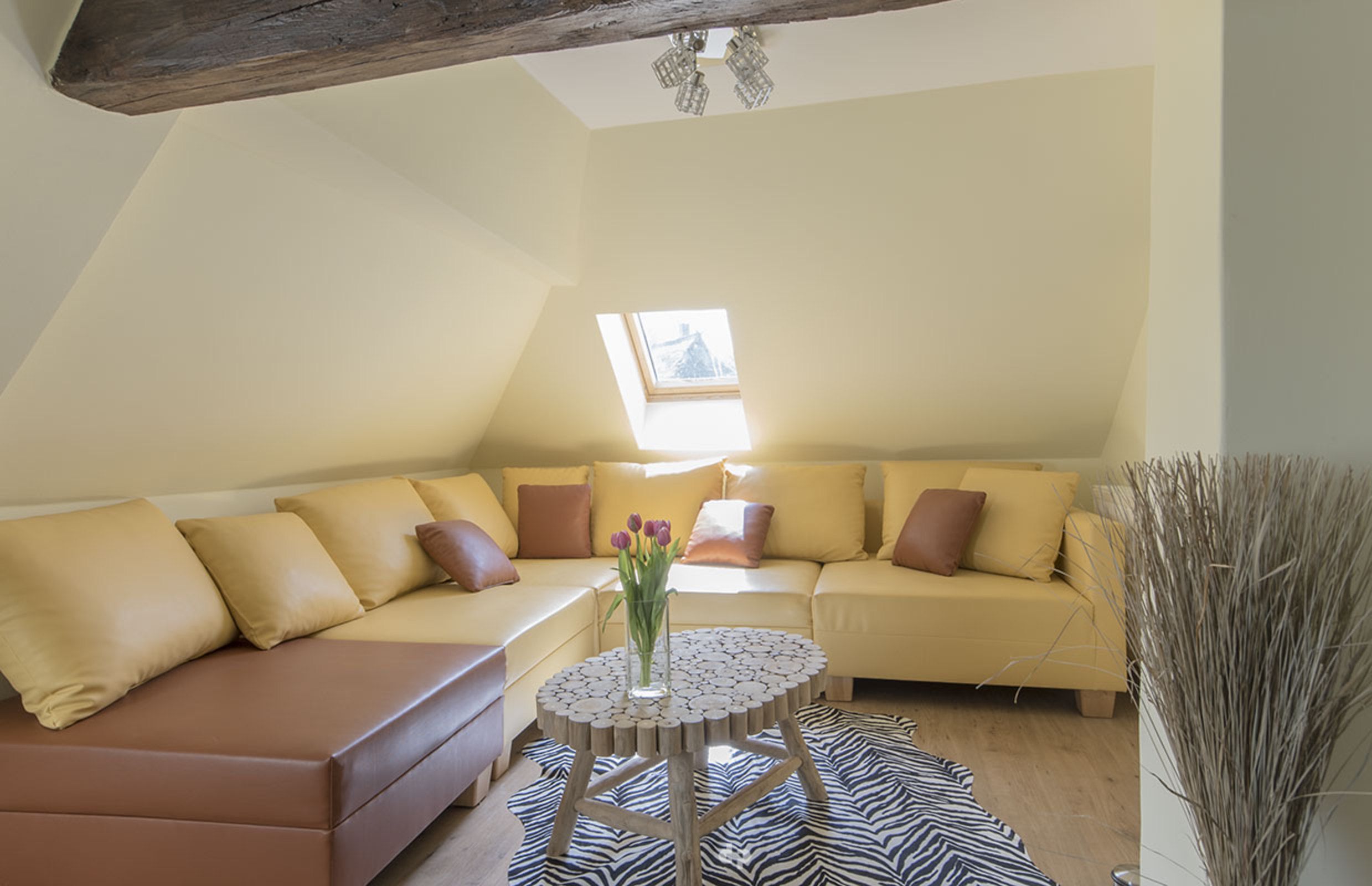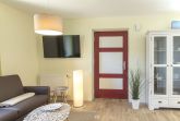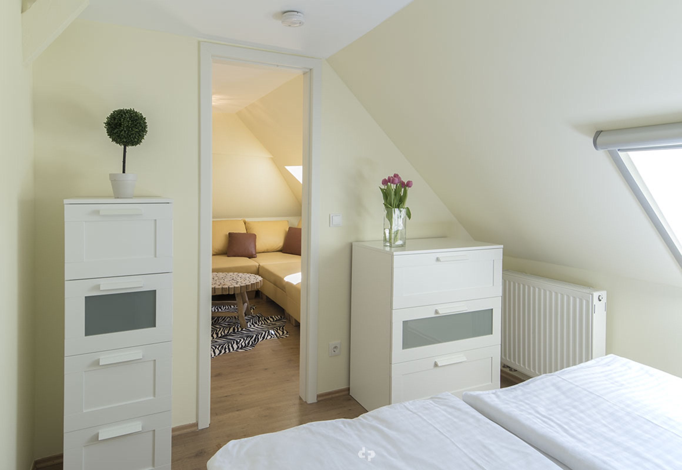 - Über eine Treppe gelangen sie in das Dachgeschoss. Dort kann man wunderbar auf der großzügigen Couch und Flachbild-TV entspannen. Im Schlafzimmer befinden sich ein Boxspringbett mit einer hochwertigen Matratze (180x200) und diverse Kommoden. Ein kleines Bad mit WC und Dusche runden das Ganze ab.
