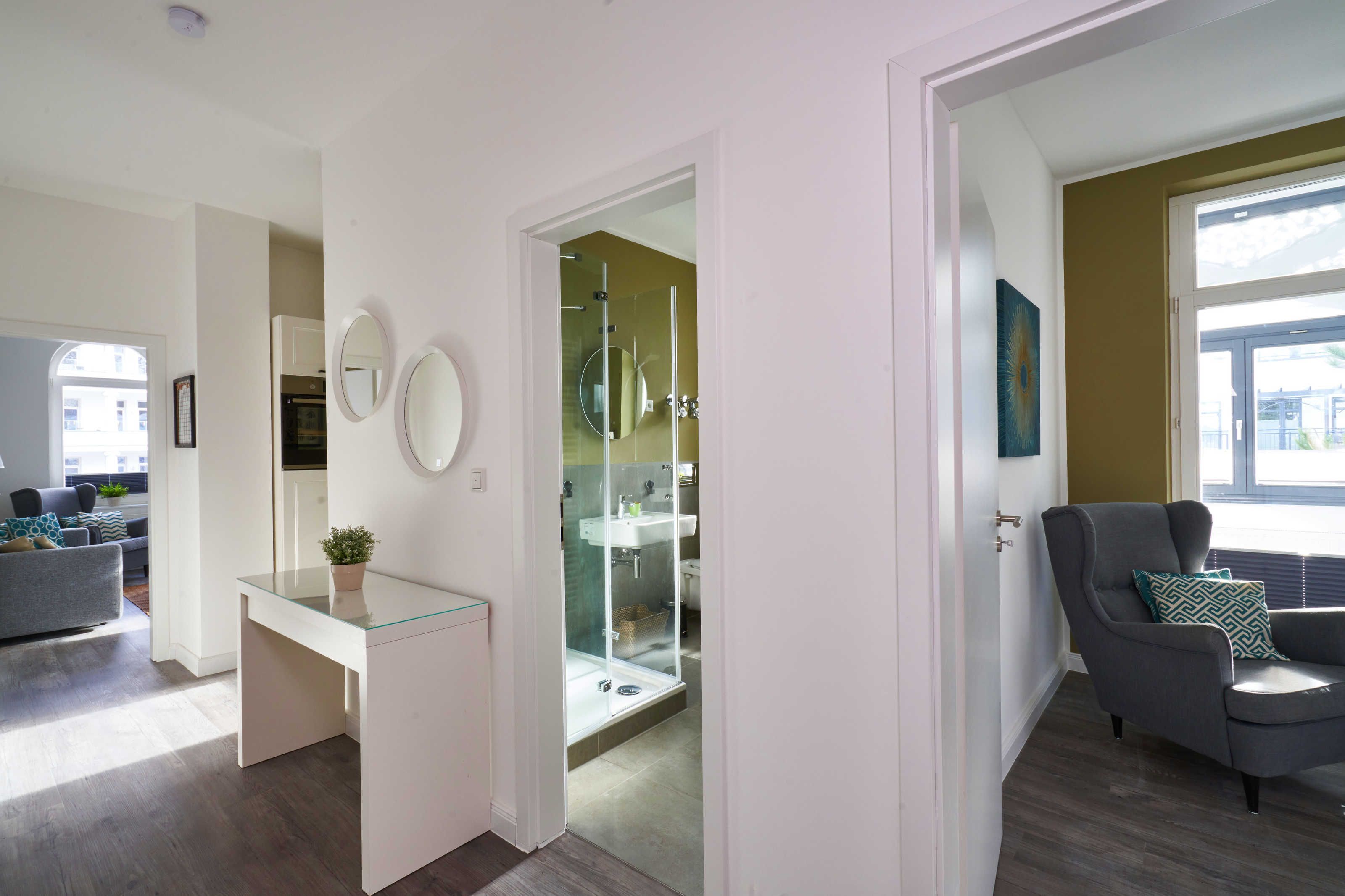 Weiterhin gibt es im Appartement ein geräumiges Badezimmer mit Dusche (Regendusche) und WC sowie  ein weiteres separates Gäste-WC mit Handwaschbecken.