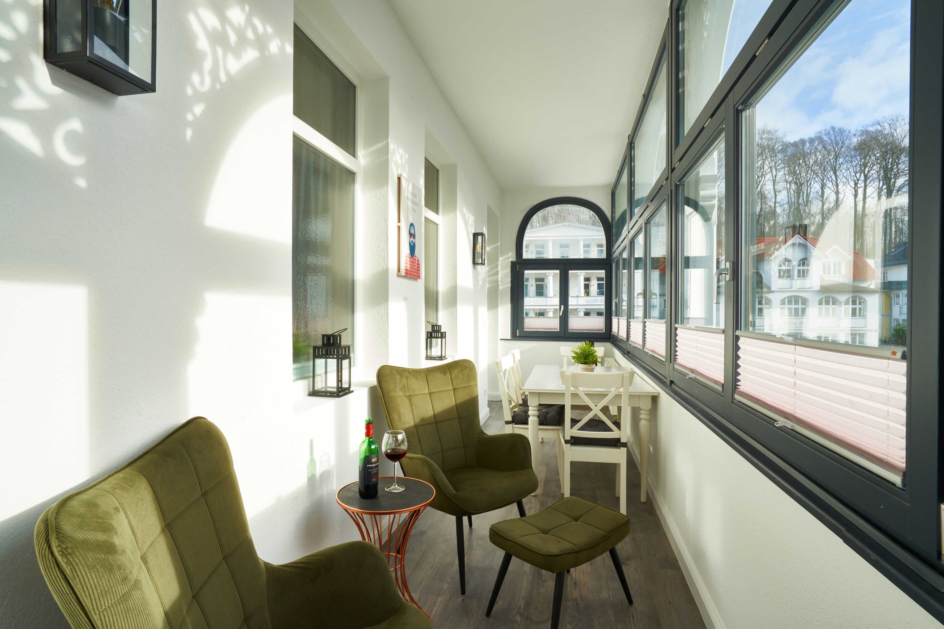 Vom hellen und lichtdurchflutetem Wohnbereich aus gelangt der Gast in den vorgelagerten und verglasten Wintergarten, der einen traumhaften seitlichen Blick auf die pittoreske Promenade der Wilhelmstrasse bietet sowie auch auf den seitlichen Gartenbereich.