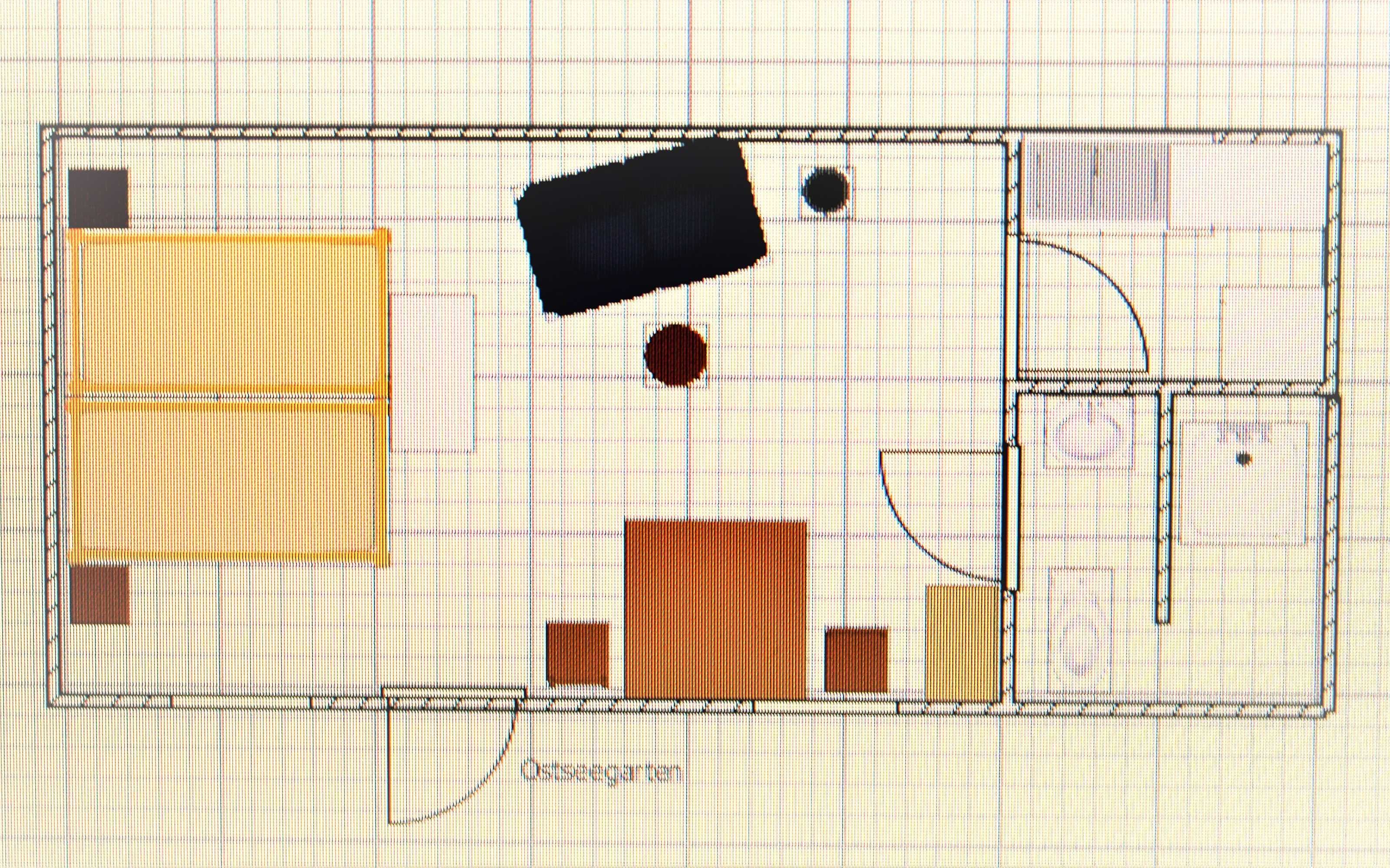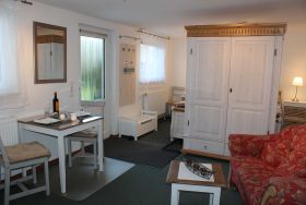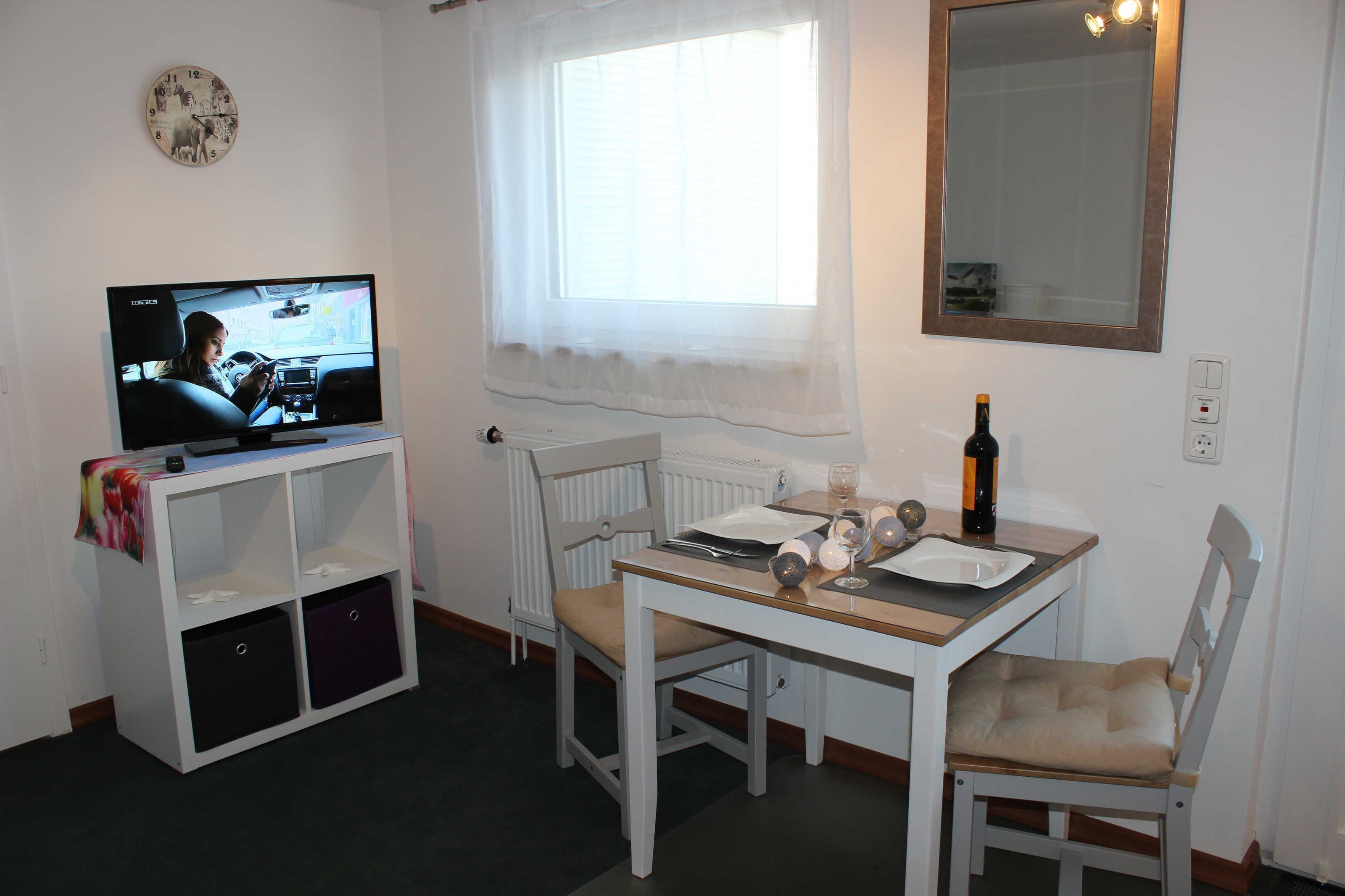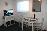 The combined living-/bedroom is modern, cosily furnished and with carpeted floor. Our guests will find a big double bed (2x 90 cm x 2 m). The wardrobe separates the bedroom from the lounge. There is a couch and a place to eat. The kitchen is very small but functional. The bathroom is also small but the guests won't miss daylight and a comfortable shower.