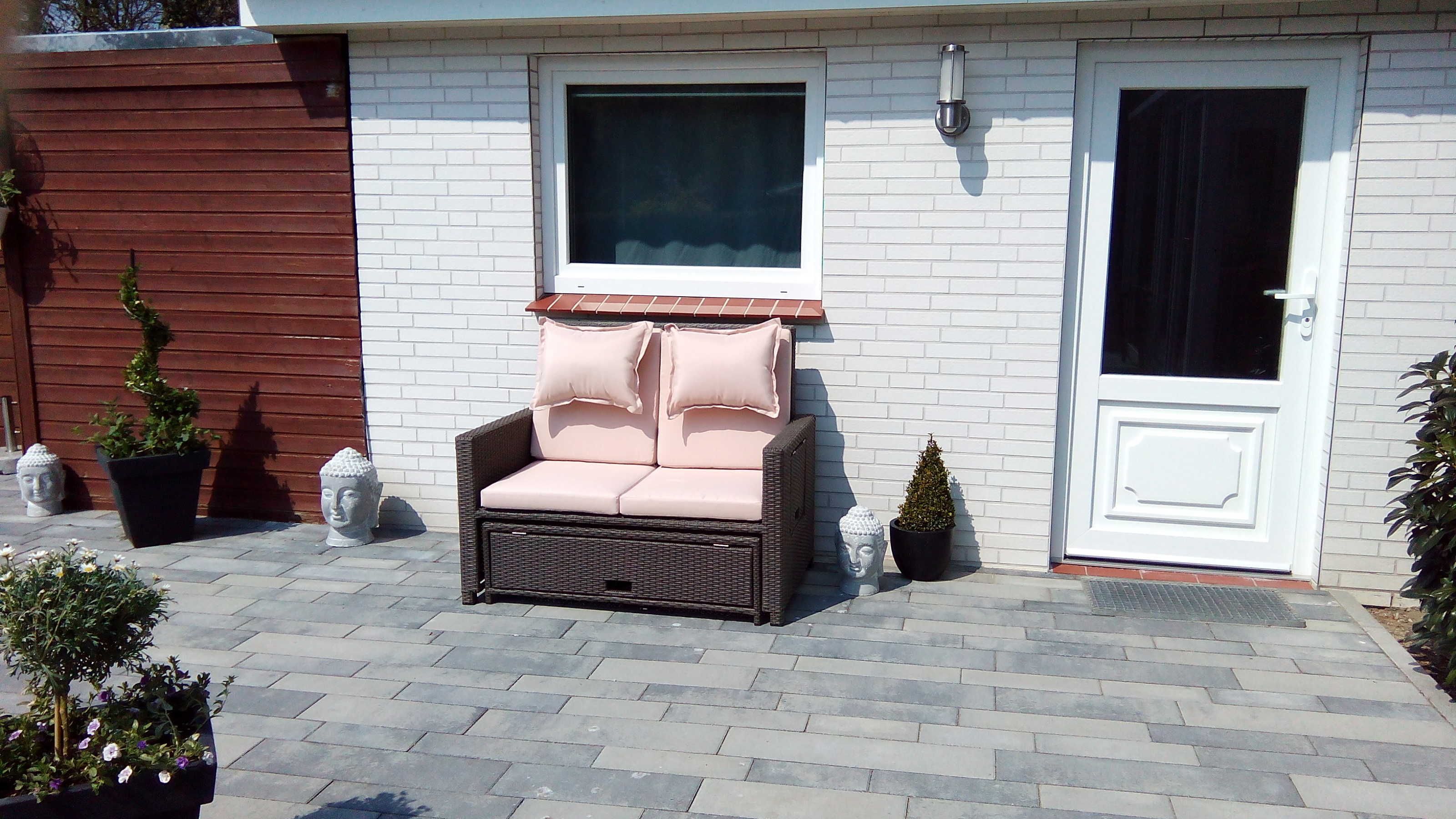 Direkt vor dem Eingang befindet sich die Terrasse; zwei Stühle und ein Tisch stehen im Gartenhaus bereit.