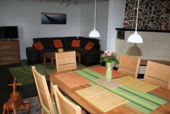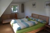Zweistöckiges Wohnhaus, im EG Wohnzimmer, Esszimmer, Küche und Bad mit Dusche, im OG ein Schlafzimmer mit Doppelbett (1,80 x 2 m) und Babybett, ein Schlafzimmer mit zwei Einzelbetten (je 0,90 x 2 m) und kleinem Bad mit Dusche.