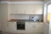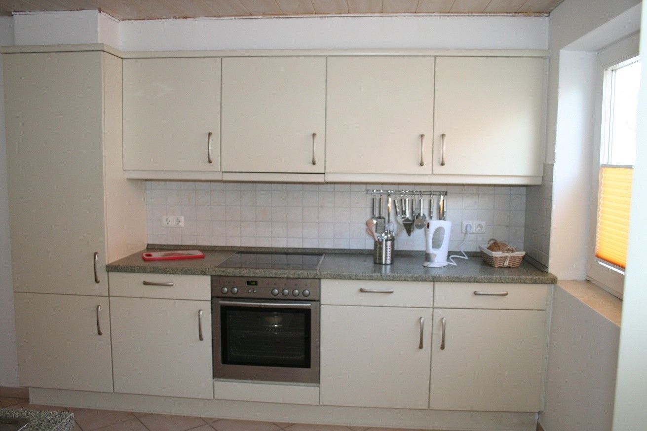 Vollausgestattete Küche mit Mikrowelle, Backofen und Spülmaschine. Der Kühlschrank besitzt ein Gefrierfach.
